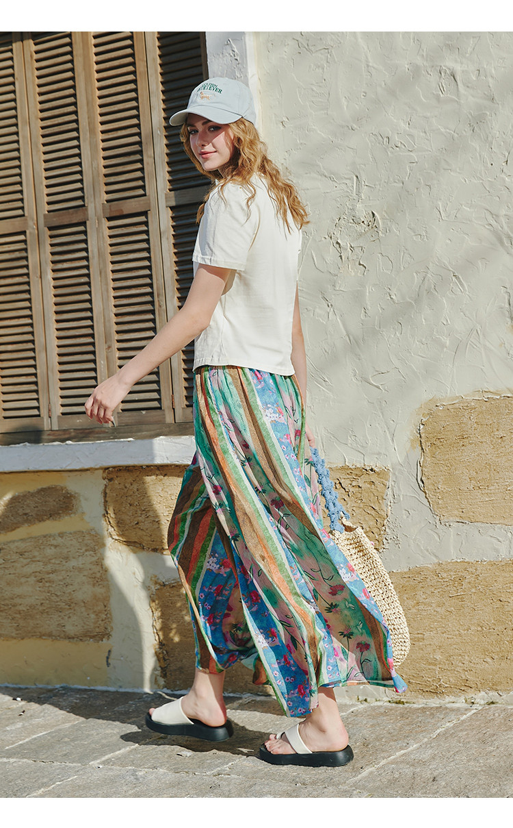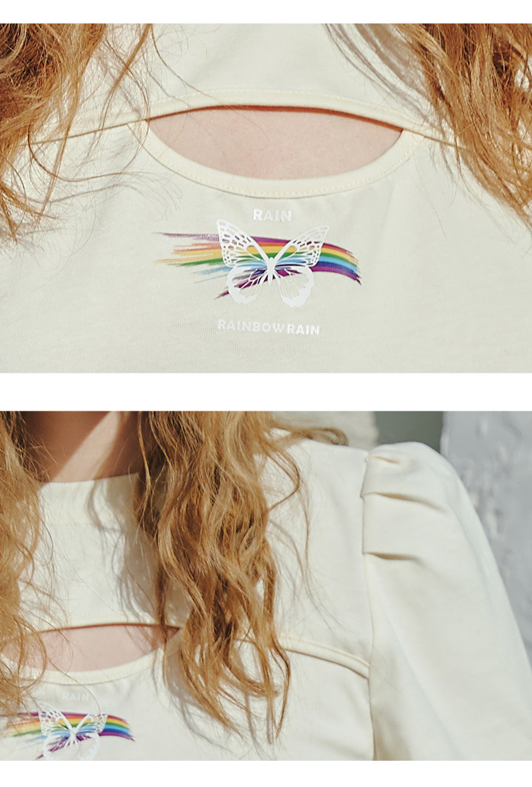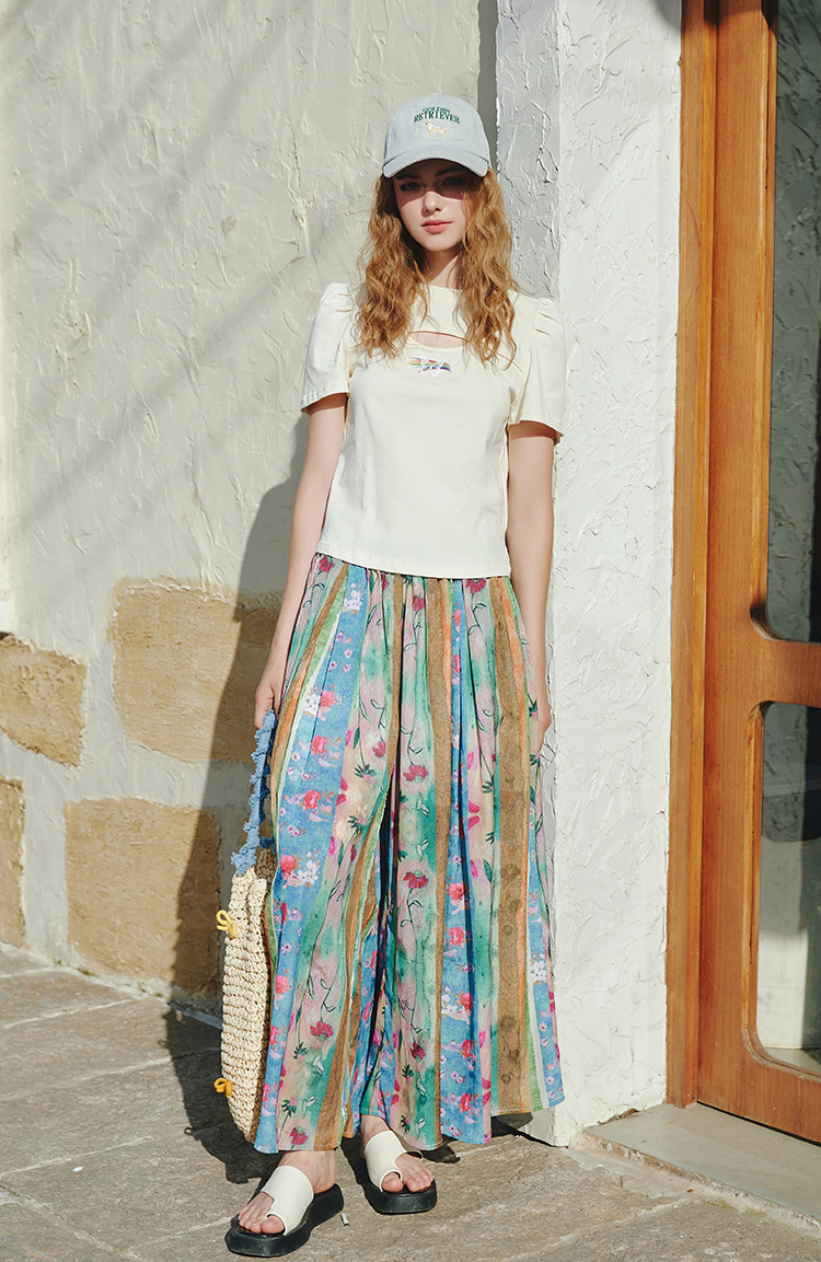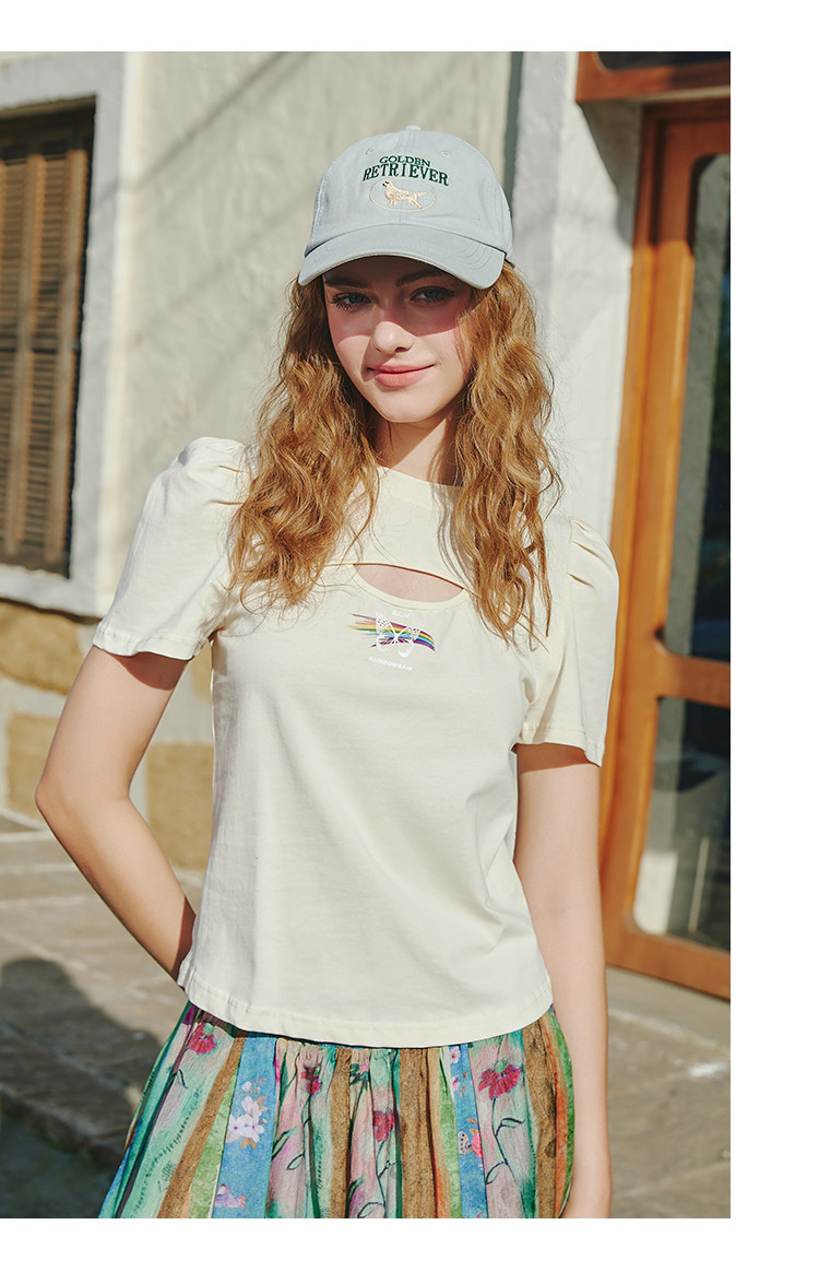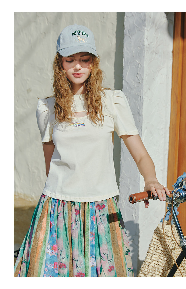 【100%棉】简约印花镂空设计女式T恤夏季小清新短袖 063325