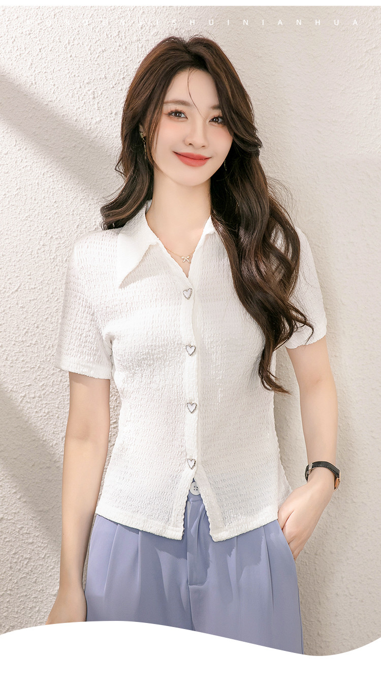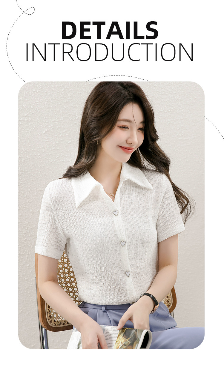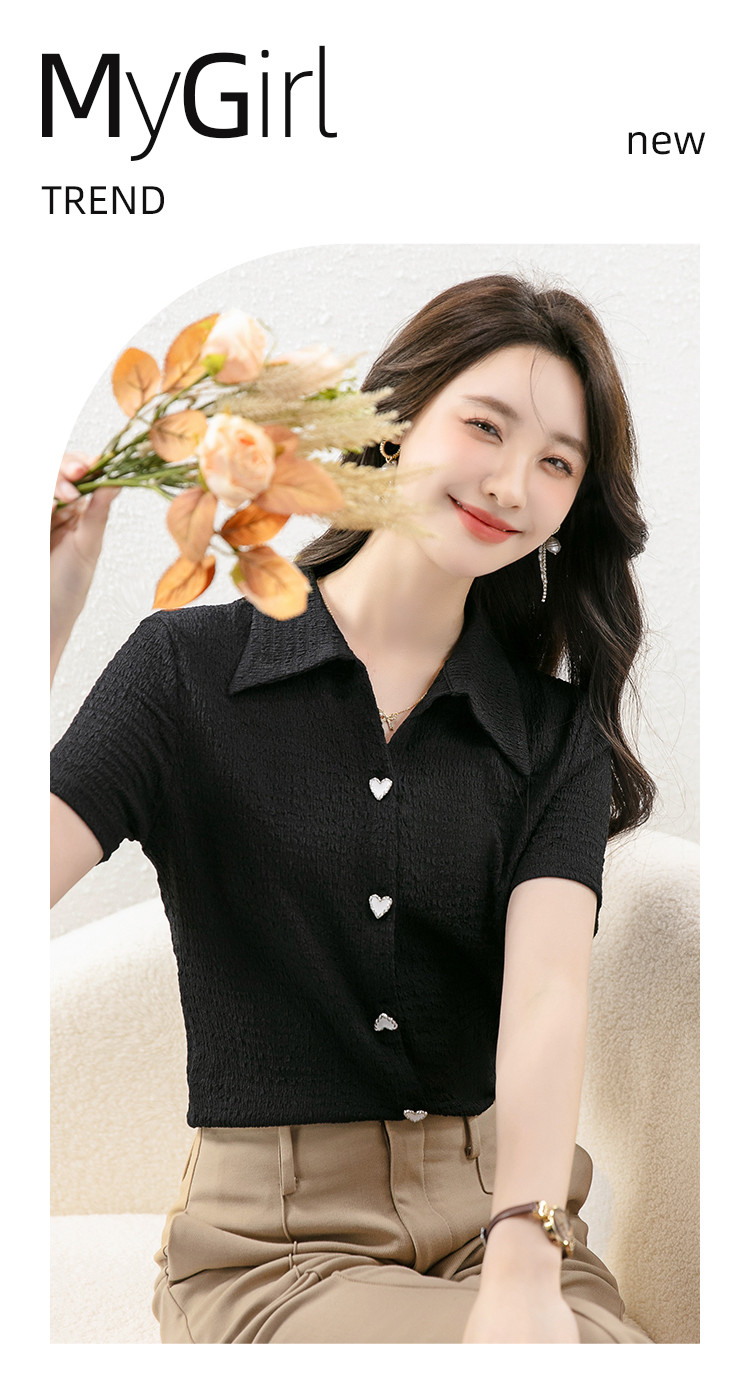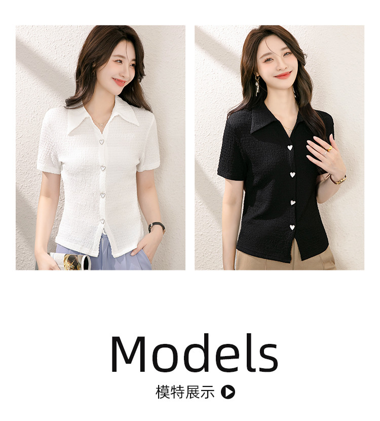 商品名称:夏季短袖t恤女通勤百搭时尚单排扣女装短款修身高弹衬衫上衣 624664