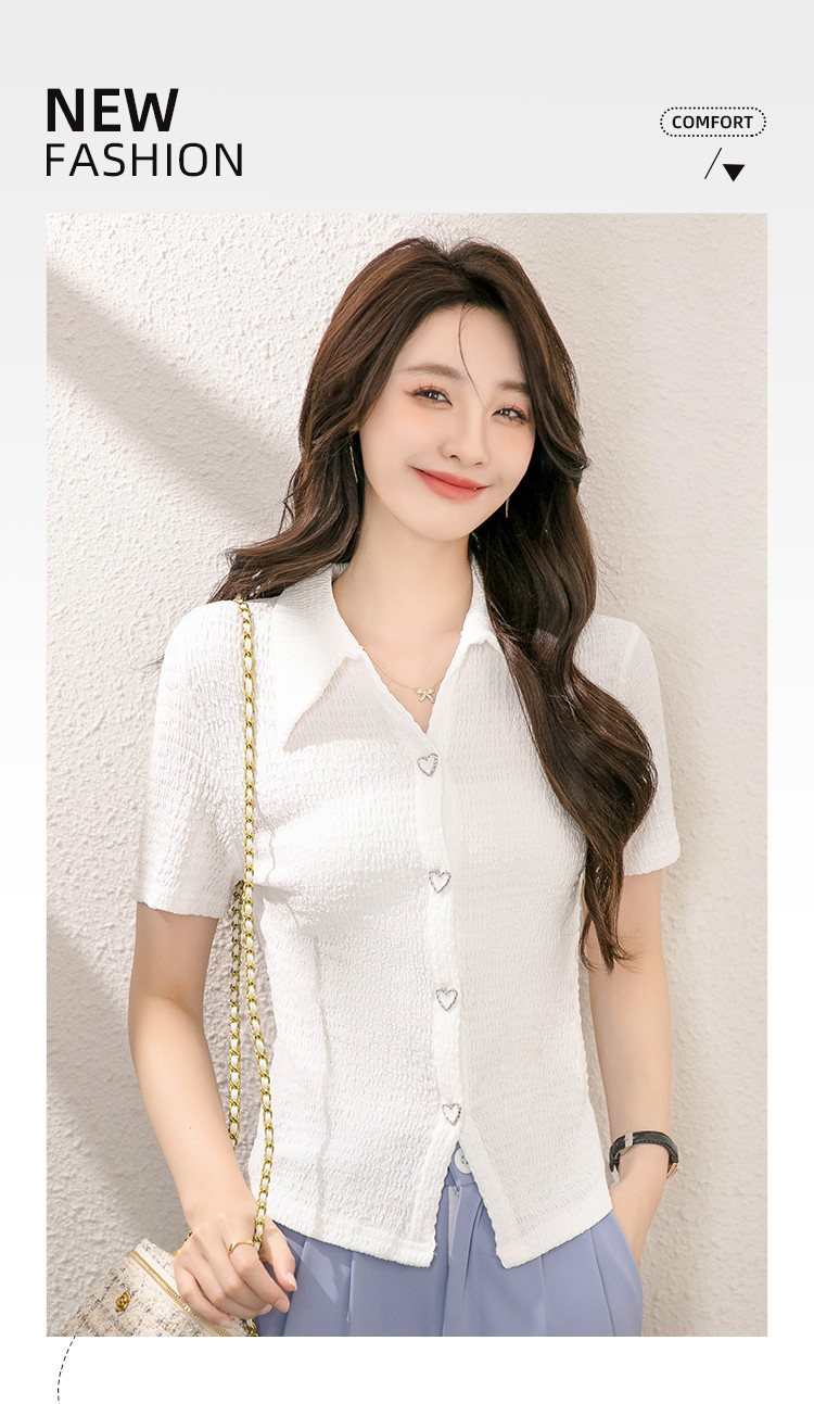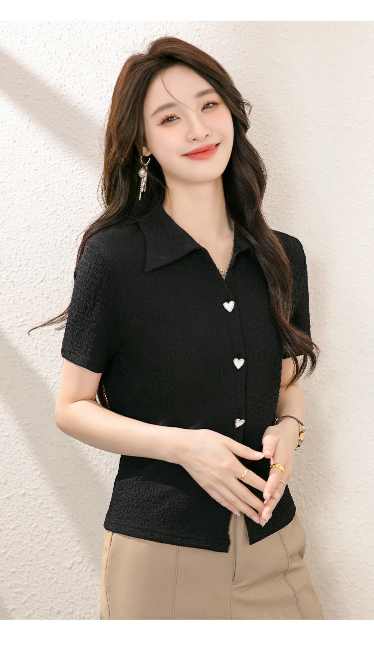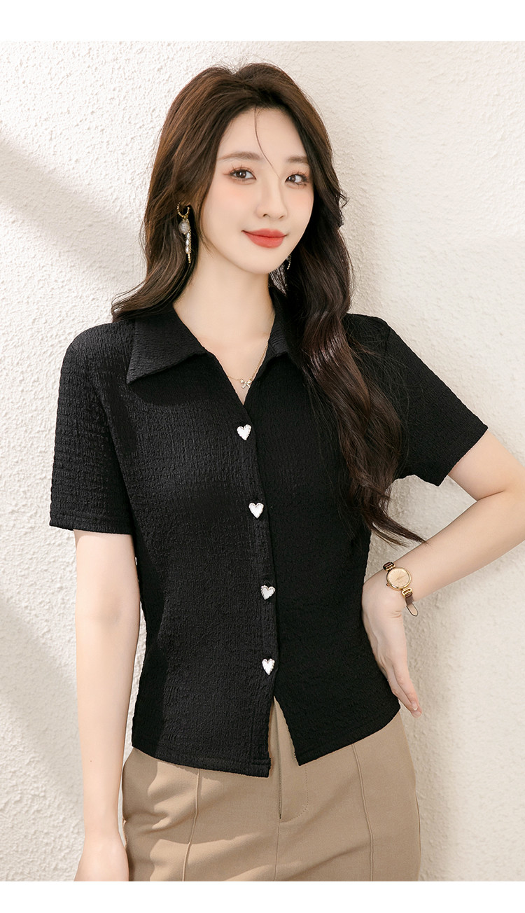 商品名称:夏季短袖t恤女通勤百搭时尚单排扣女装短款修身高弹衬衫上衣 624664