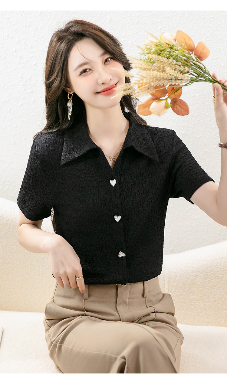 夏季短袖t恤女通勤百搭时尚单排扣女装短款修身高弹衬衫上衣 624664