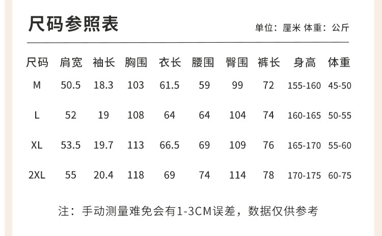 | 尺码 | 肩宽(cm) | 袖长(cm) | 衣长(cm) | 身高(cm) | 腰围(cm) | 裤长(cm) | 体重(kg) | 臀围(cm) | 胸围(cm) | 号型 |