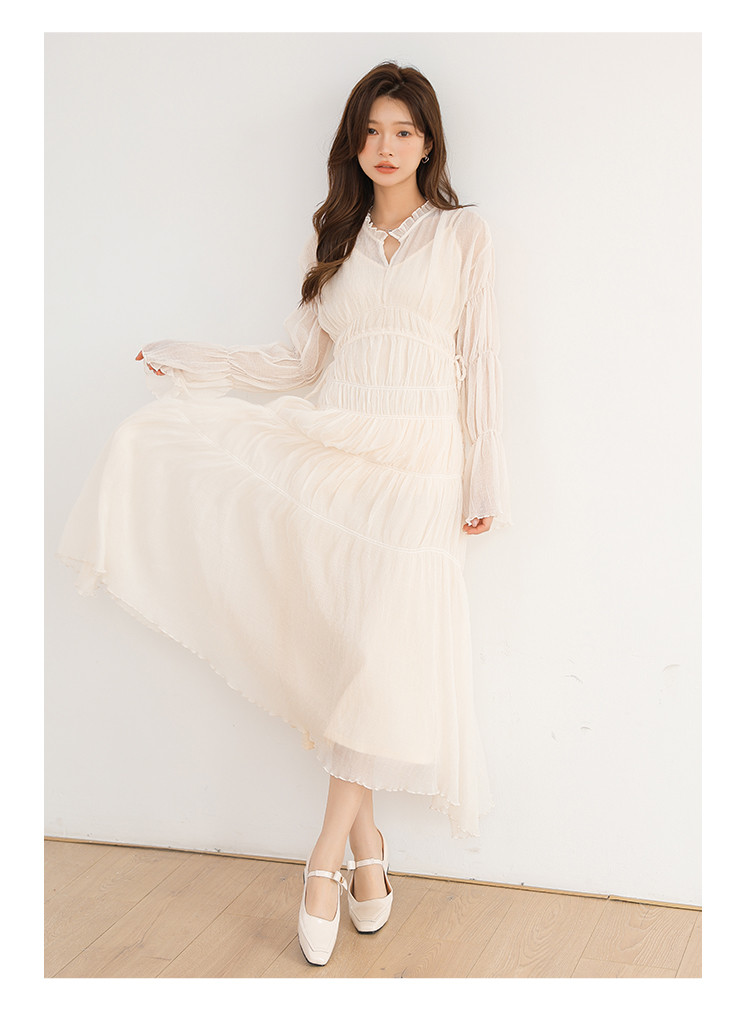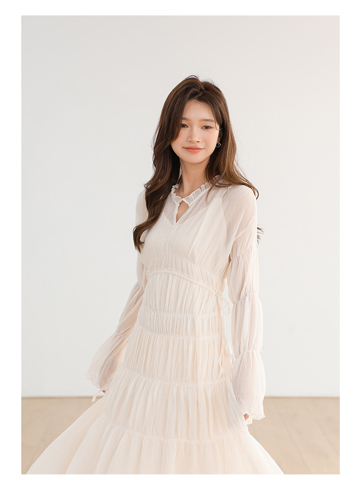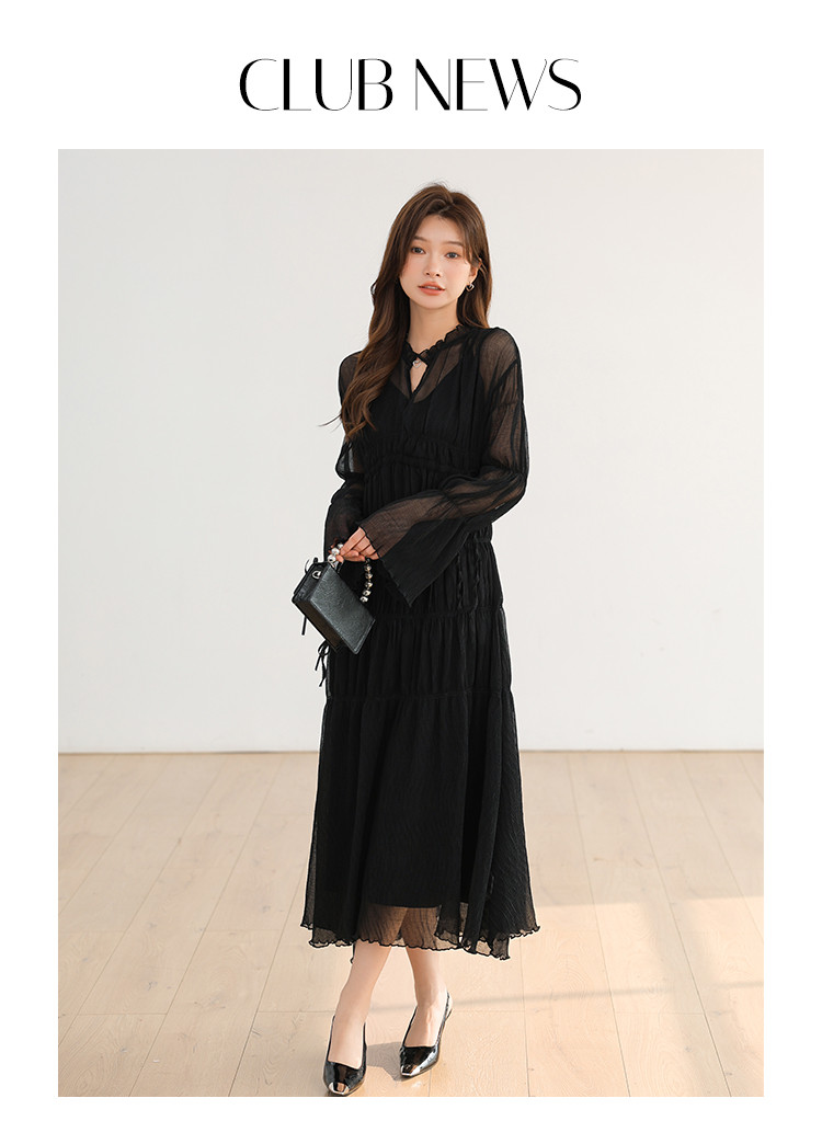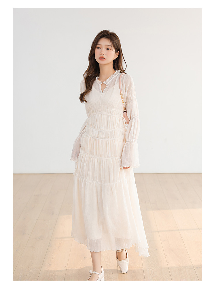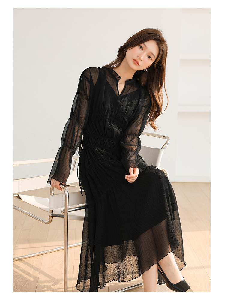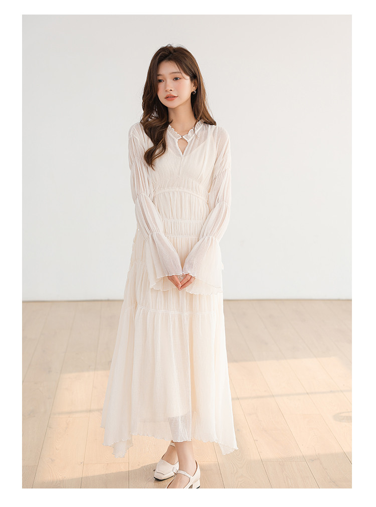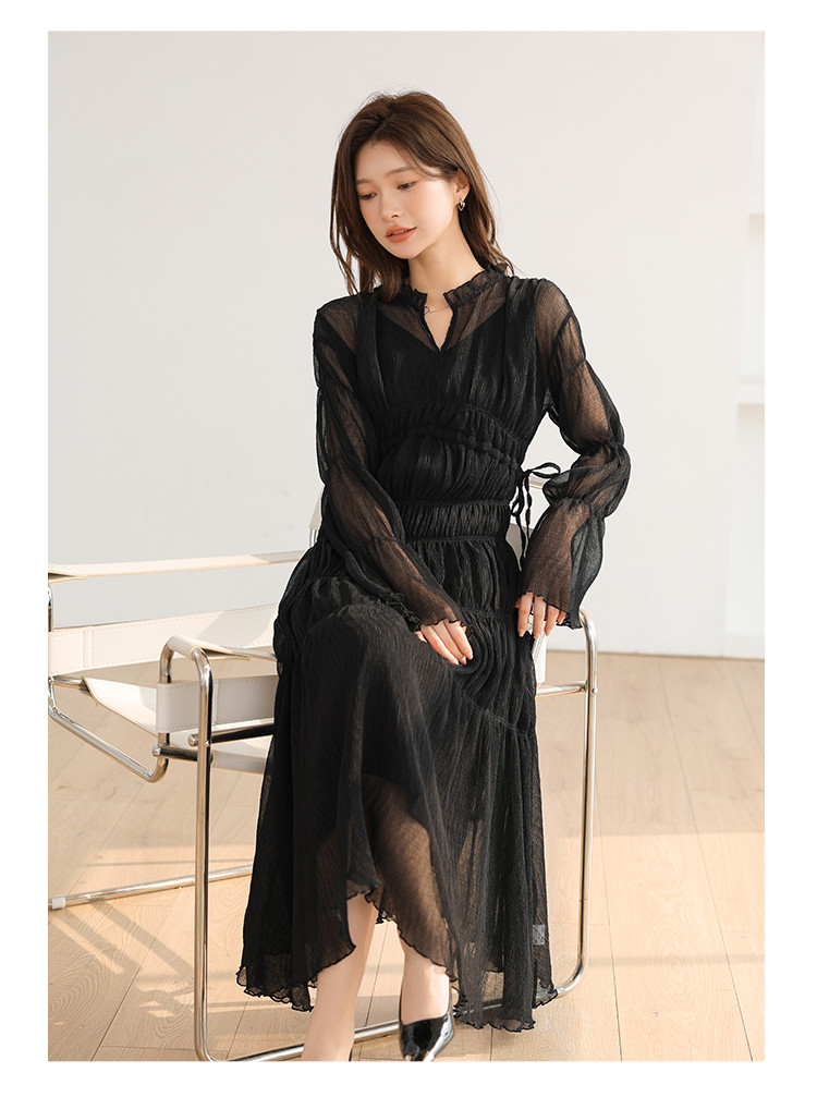温柔风法式V领长袖雪纺连衣裙女设计感小众气质长裙女 509699