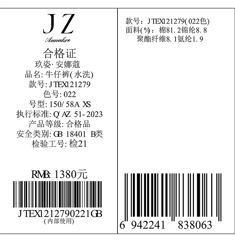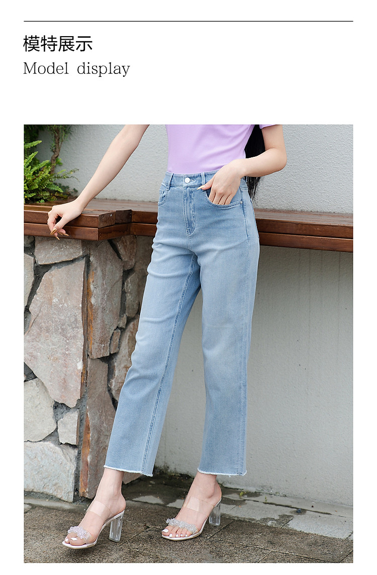商品名称:玖姿旗下安娜蔻系列复古休闲老钱风基础款直筒牛仔裤女装夏季 807820