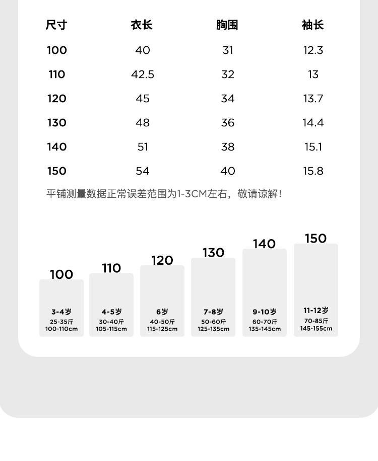 | 尺码 | 衣长(cm) | 肩宽(cm) | 身高(cm) | 袖长(cm) | 适合年龄 | 胸围(cm) | 号型 |