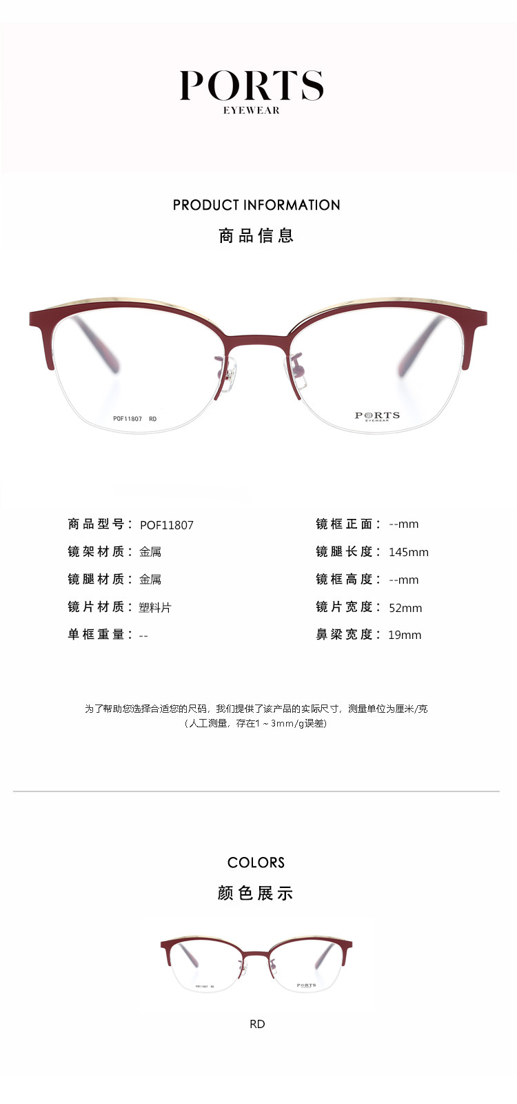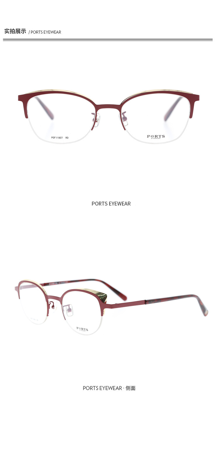 商品名称:PORTS女款日常半框个性休闲金属眼镜架POF11807 873034