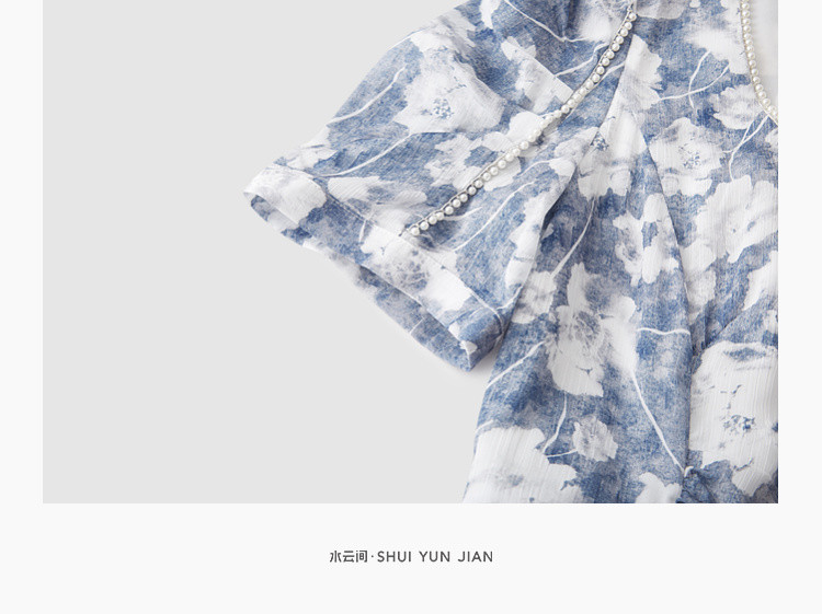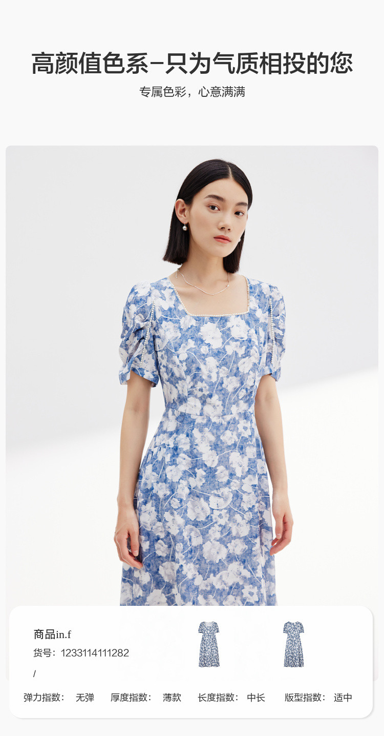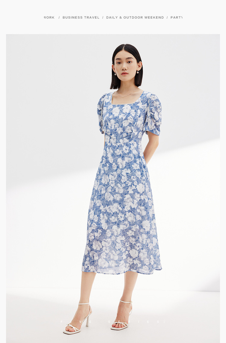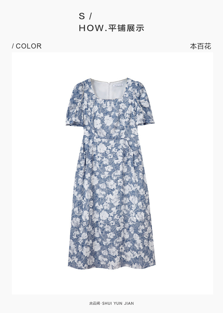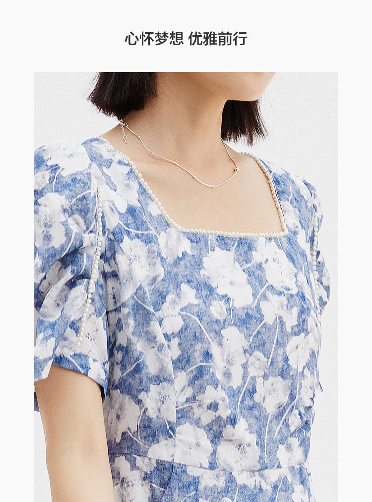 商品名称:法式气质方领碎花连衣裙女夏季浪漫气质钉珠雪纺收腰A字裙子女 679171