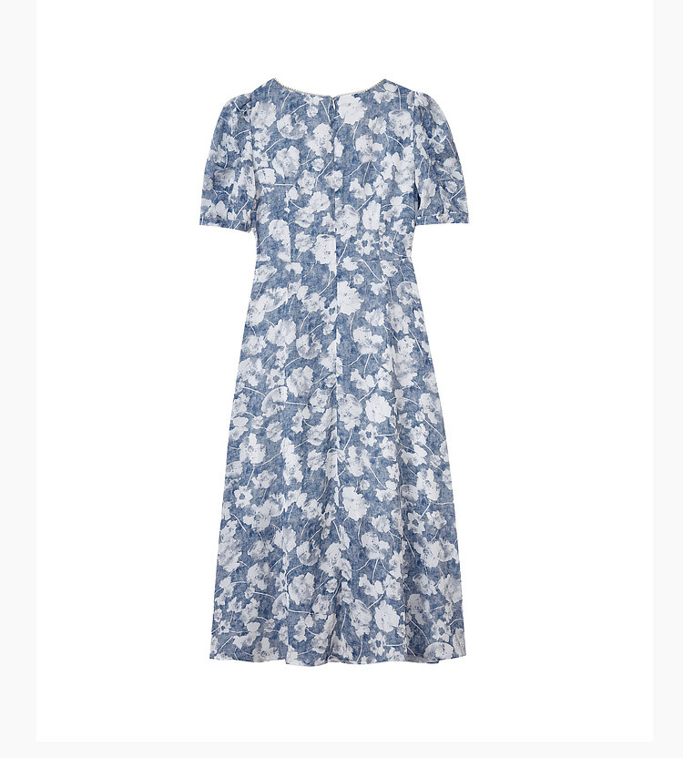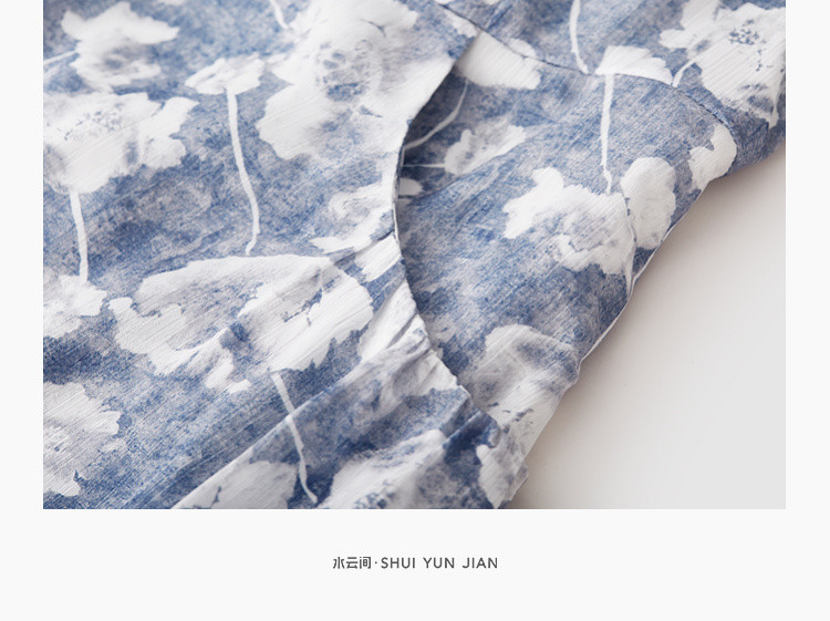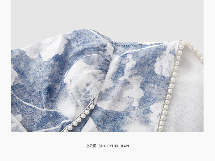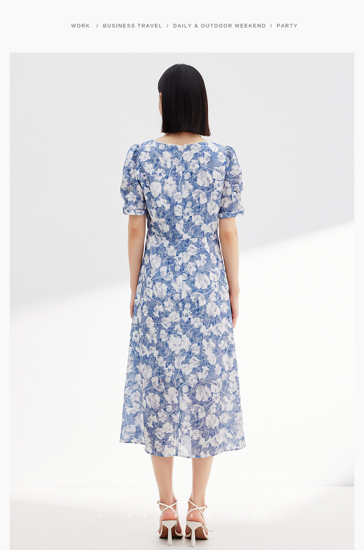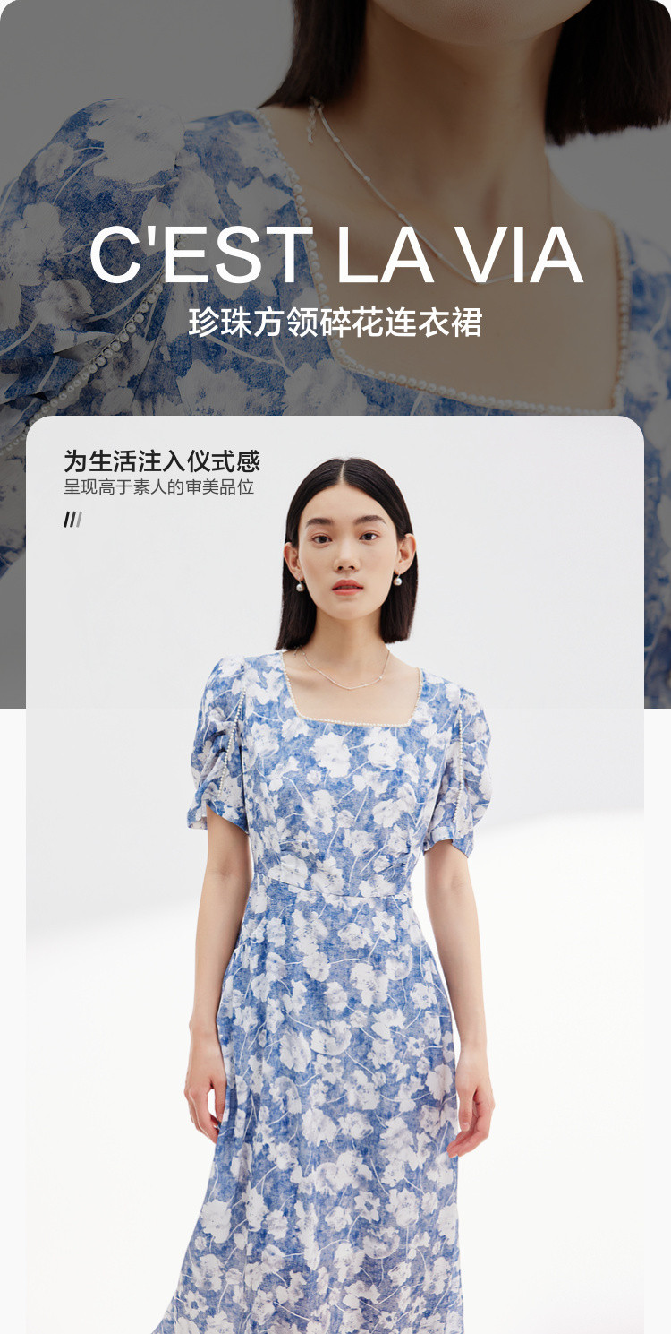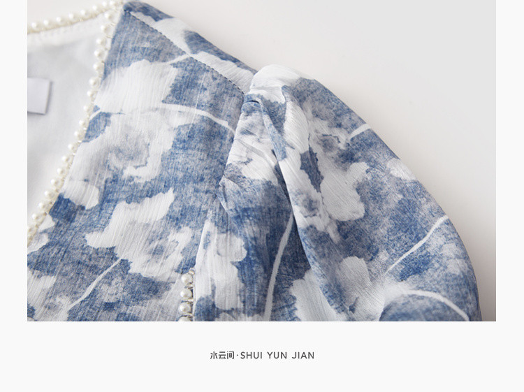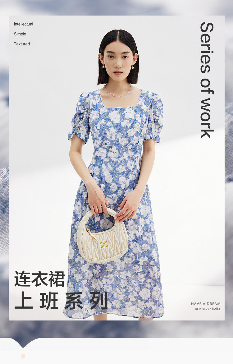 商品名称:法式气质方领碎花连衣裙女夏季浪漫气质钉珠雪纺收腰A字裙子女 679171
