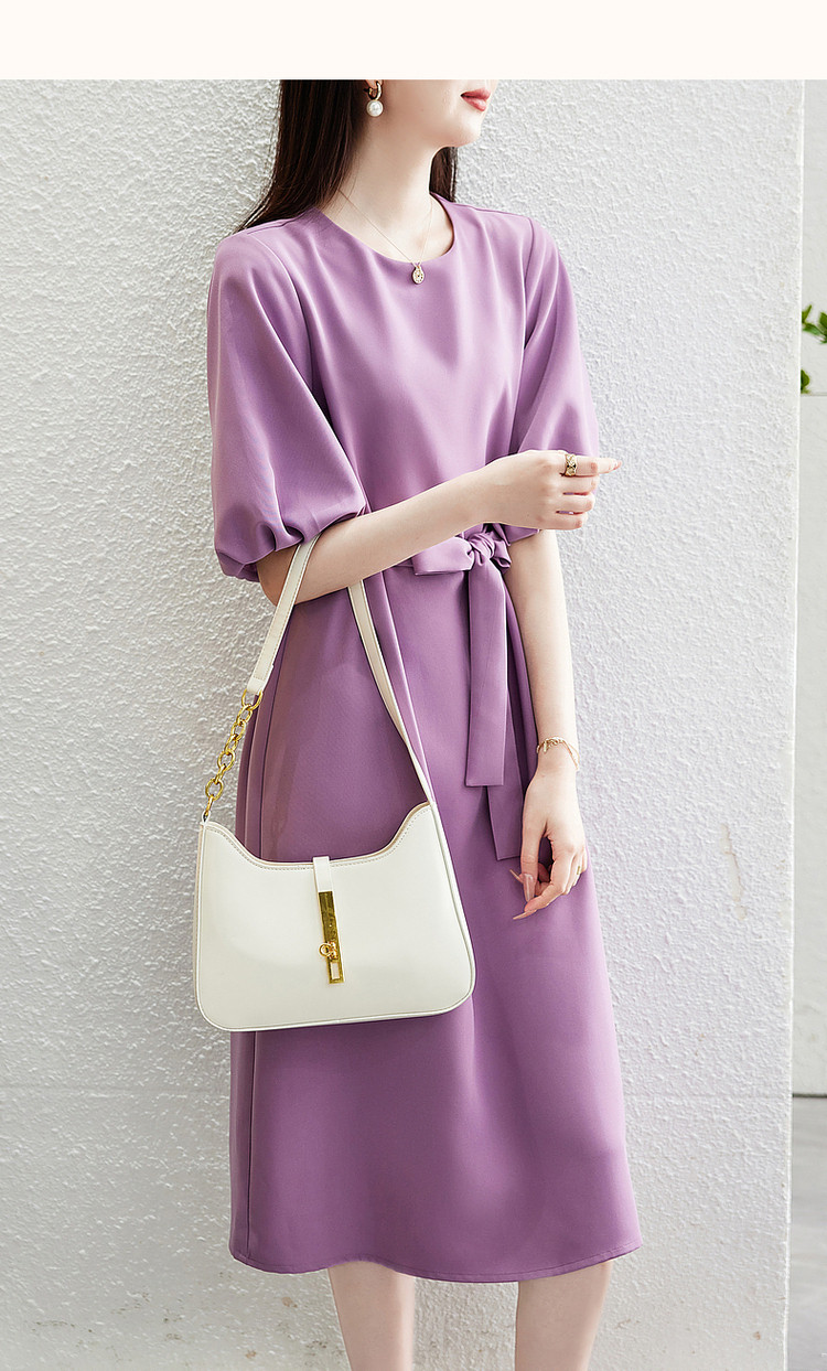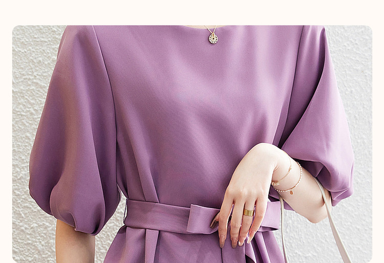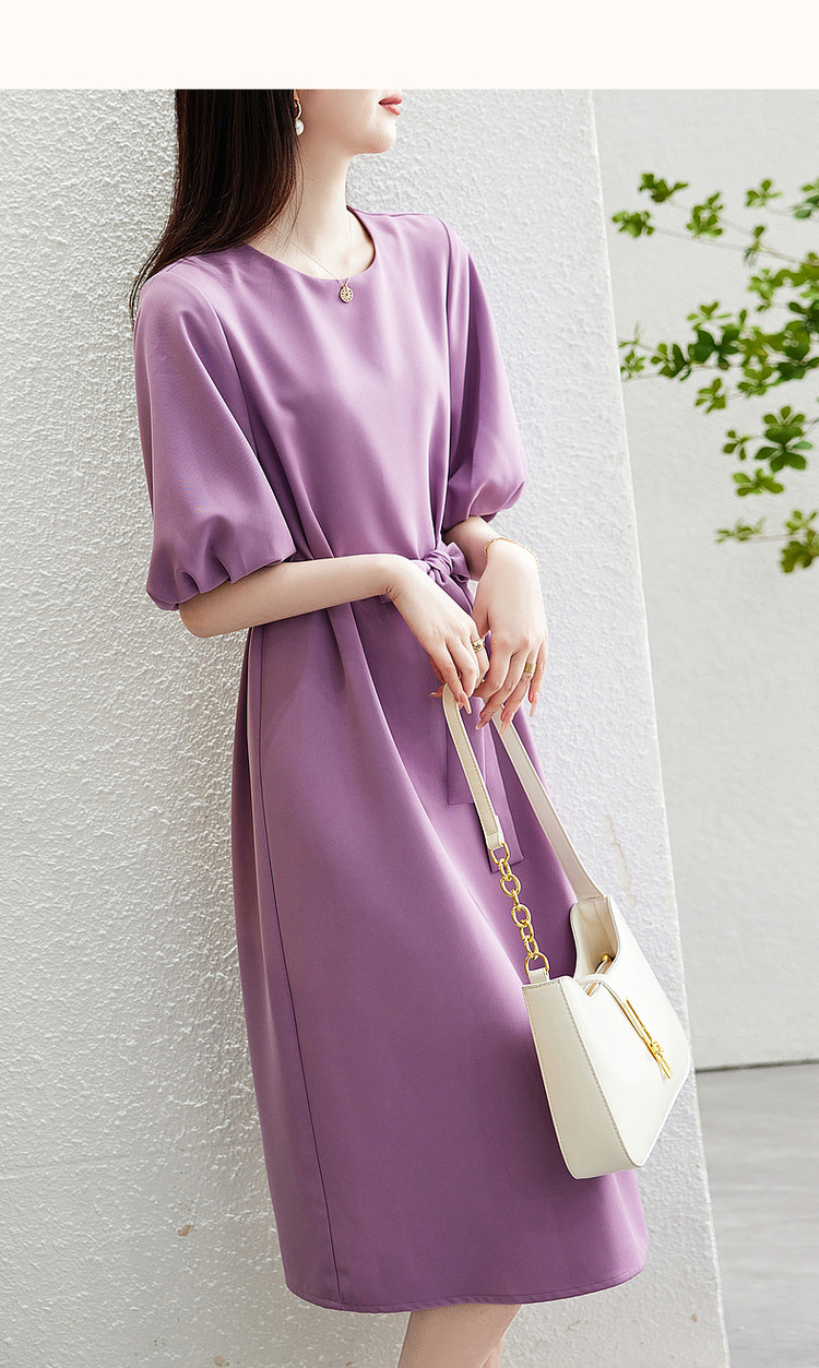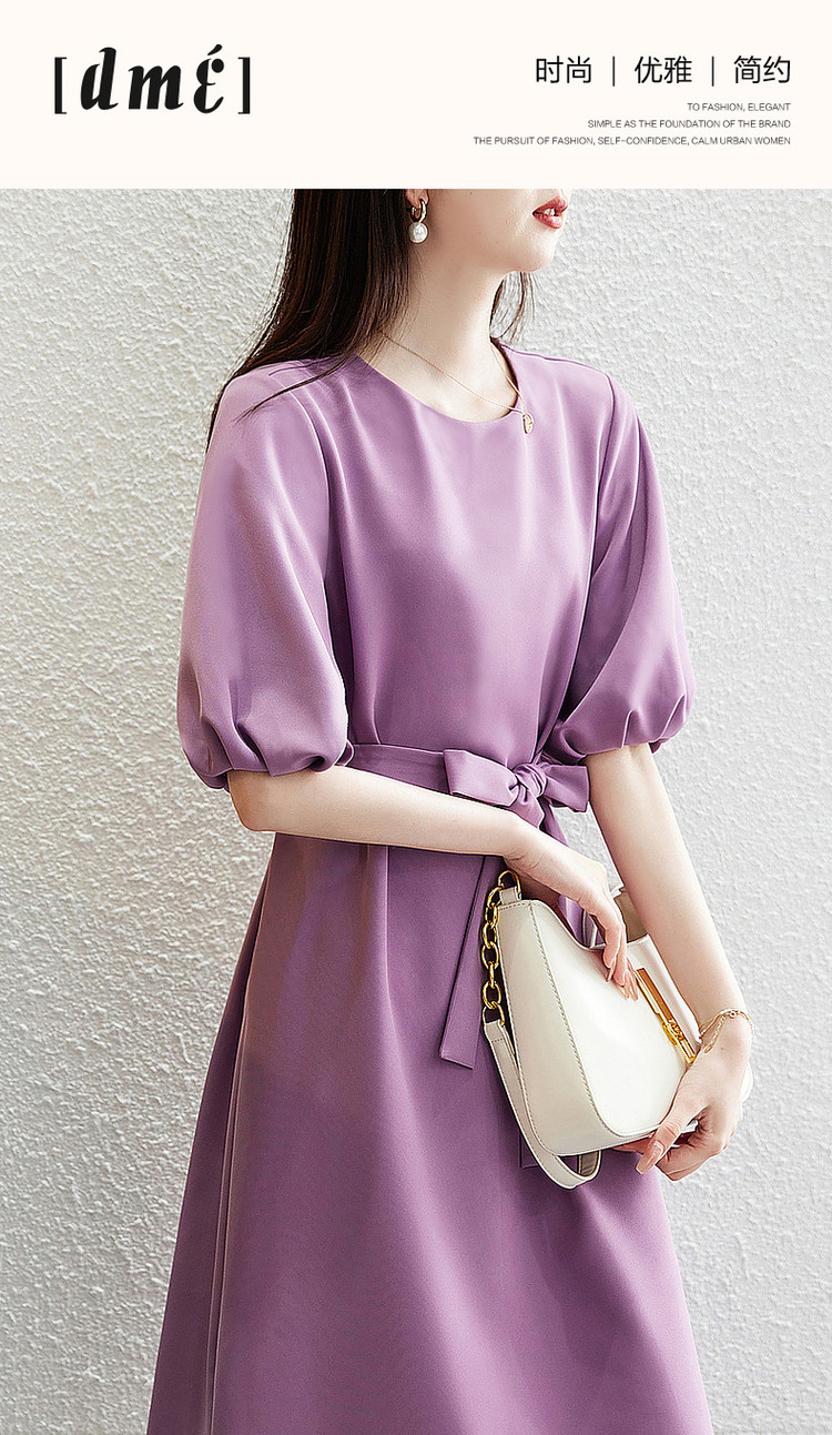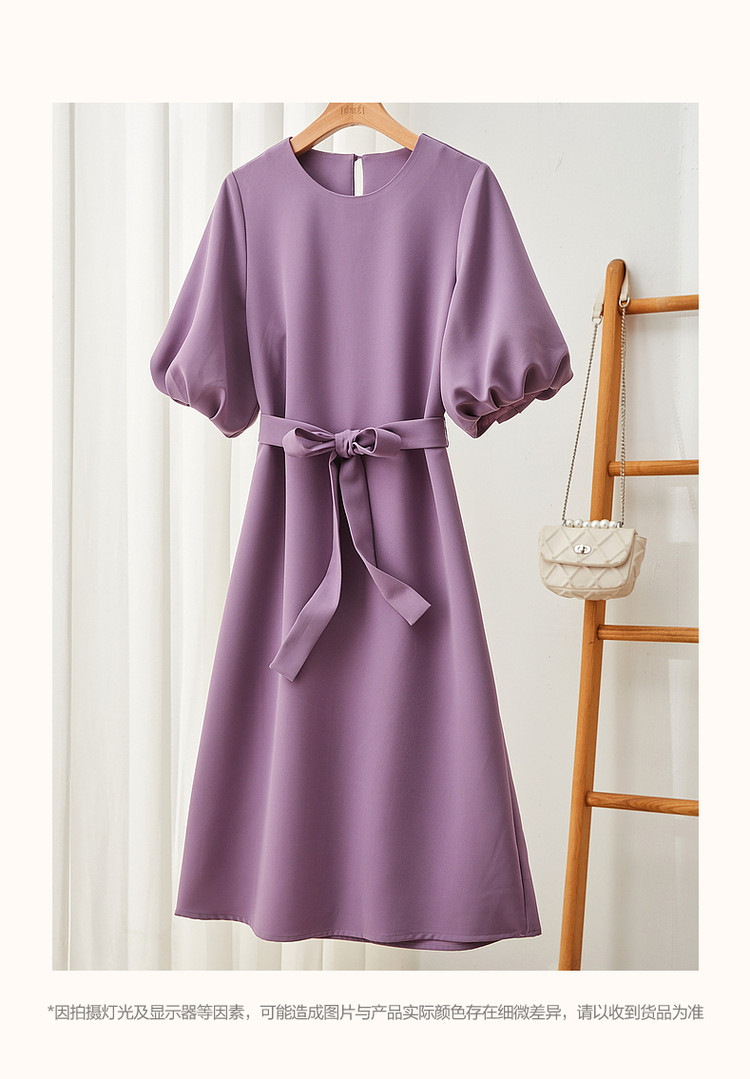 【绑带泡泡袖针织伞裙】春秋圆领短袖连衣裙女中长款 849089