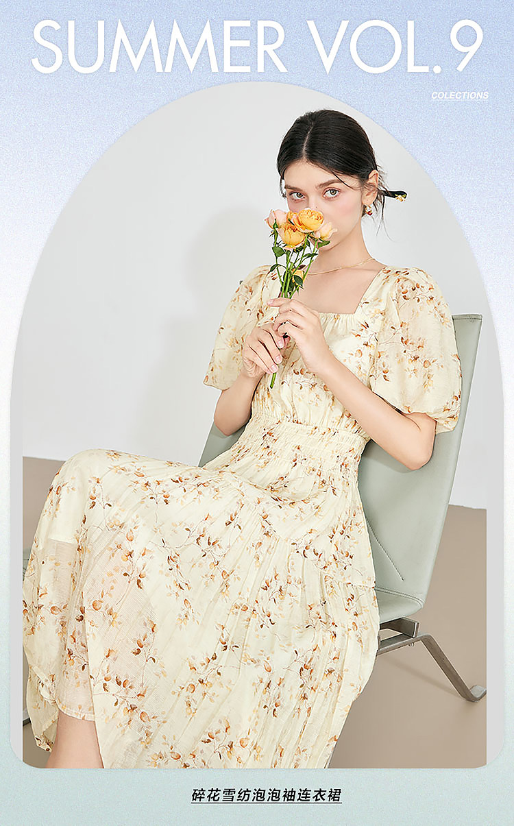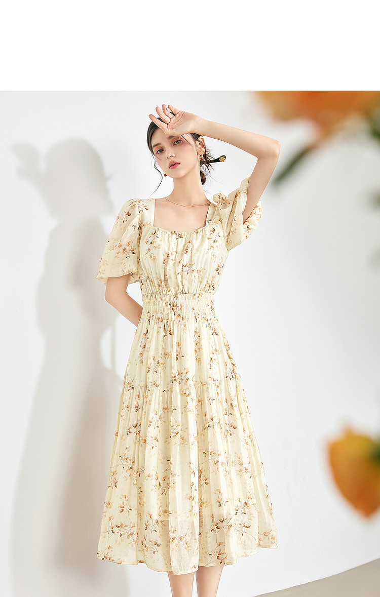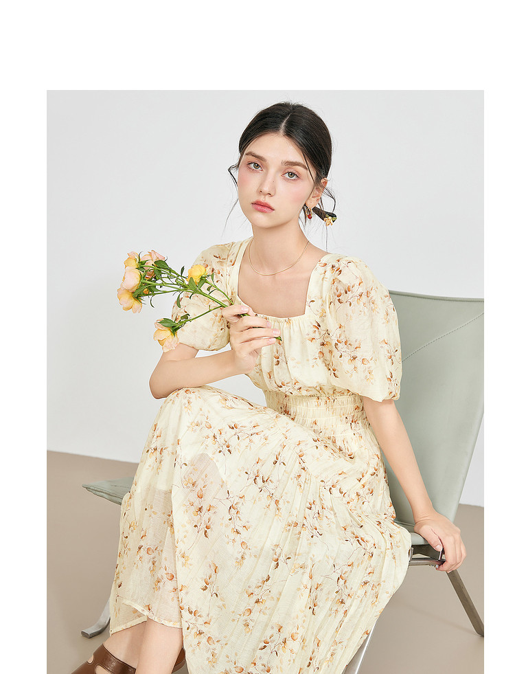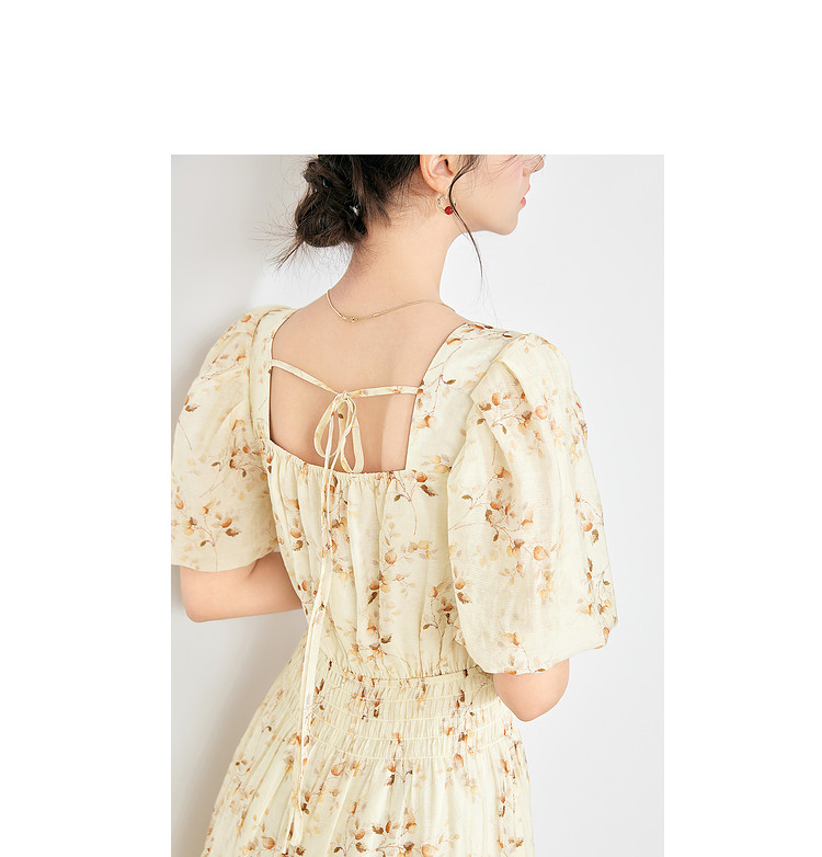 【2024夏季】优雅碎花雪纺连衣裙女松紧收腰方领泡泡袖裙子 097108
