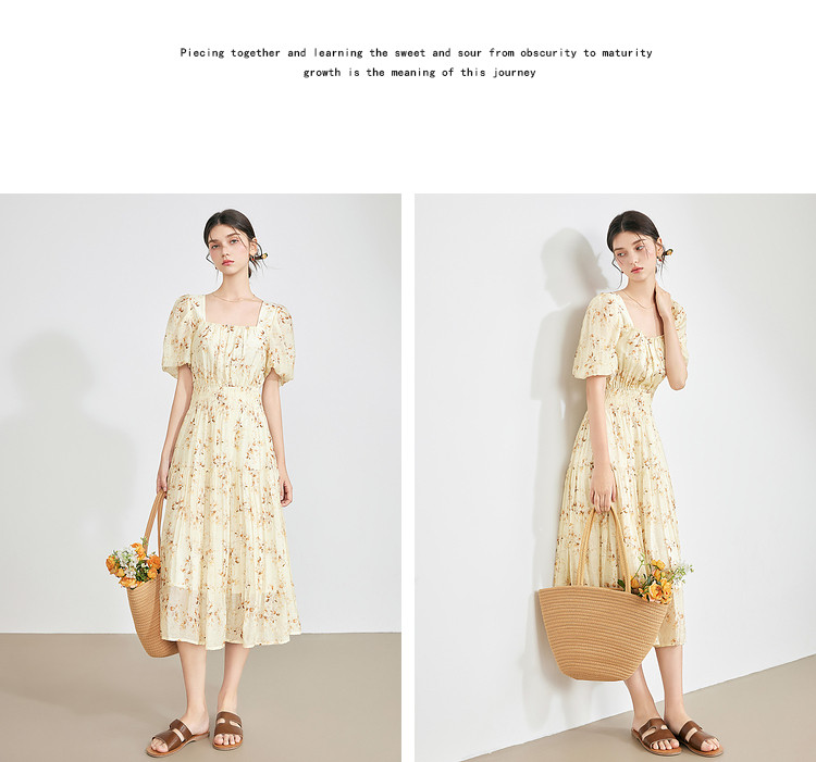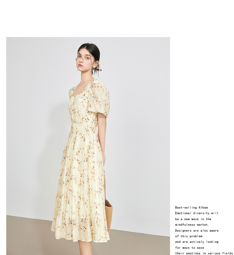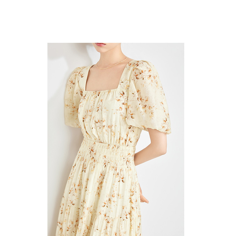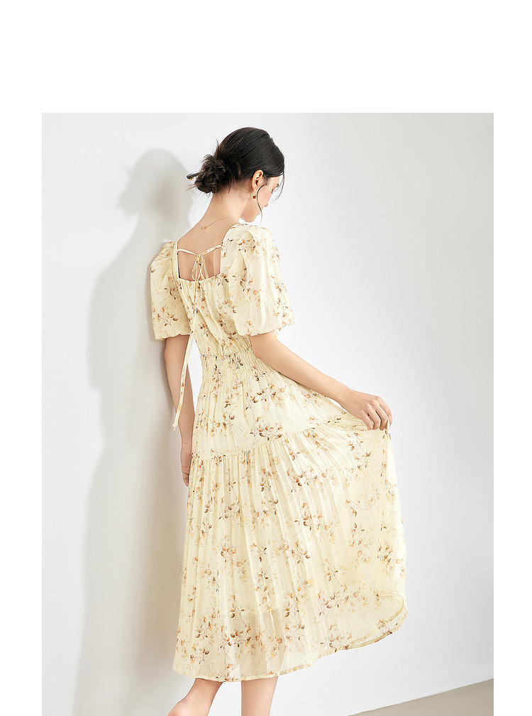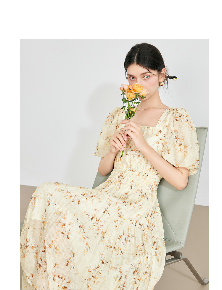 【2024夏季】优雅碎花雪纺连衣裙女松紧收腰方领泡泡袖裙子 097108