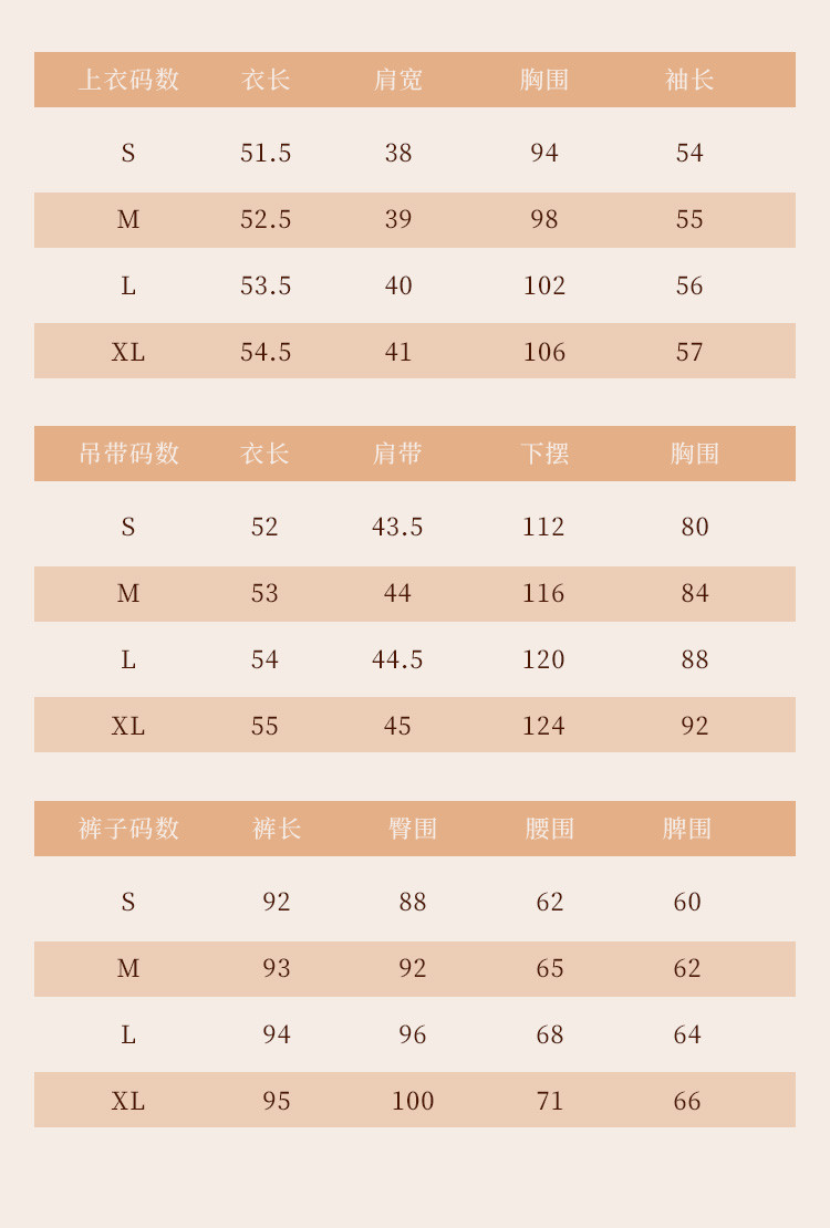 | 尺码 | 肩宽(cm) | 袖长(cm) | 上装号型 | 下装号型 | 衣长(cm) | 腰围(cm) | 裤长(cm) | 臀围(cm) | 胸围(cm) | 号型 |