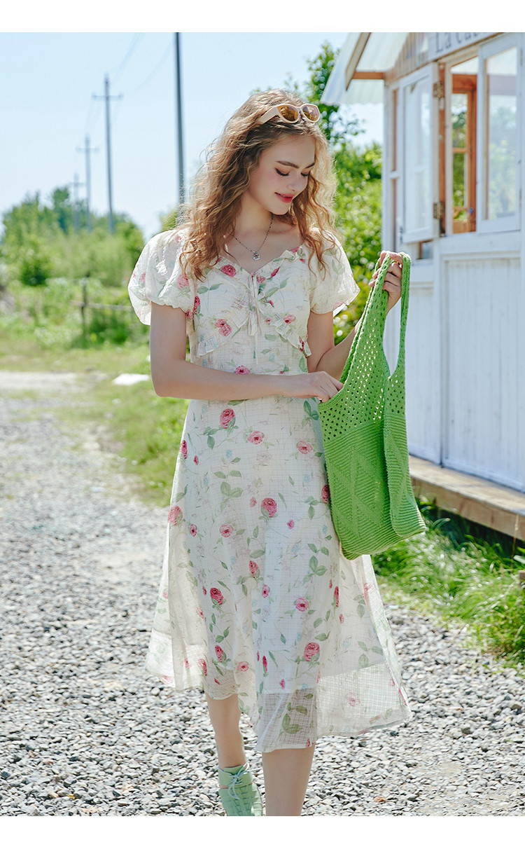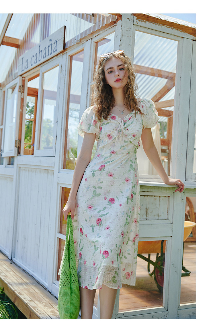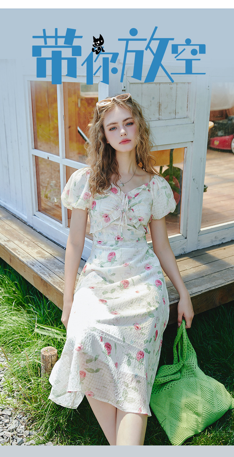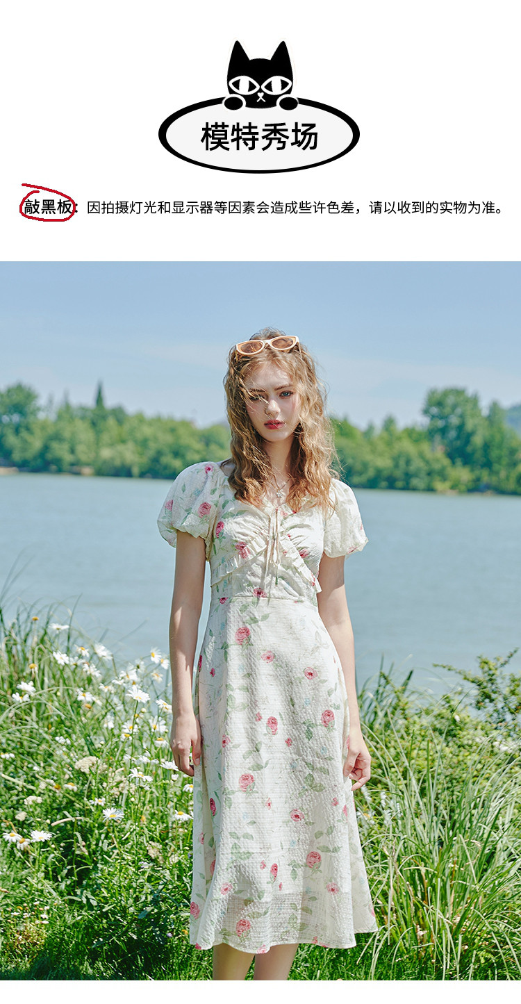 商品名称:V领小清新泡泡袖系带设计感连衣裙夏季休闲气质碎花裙 256093