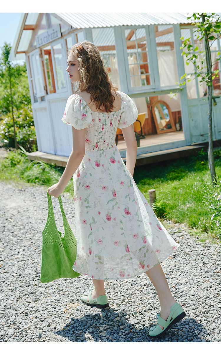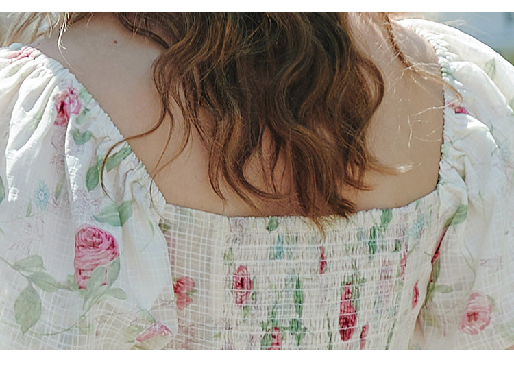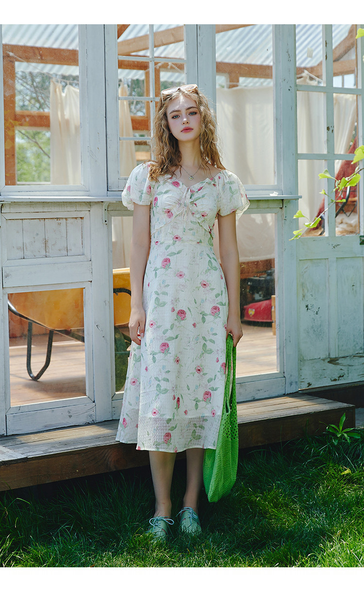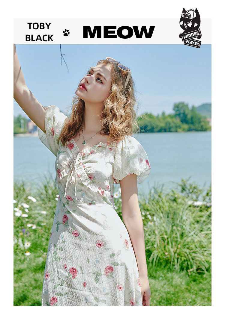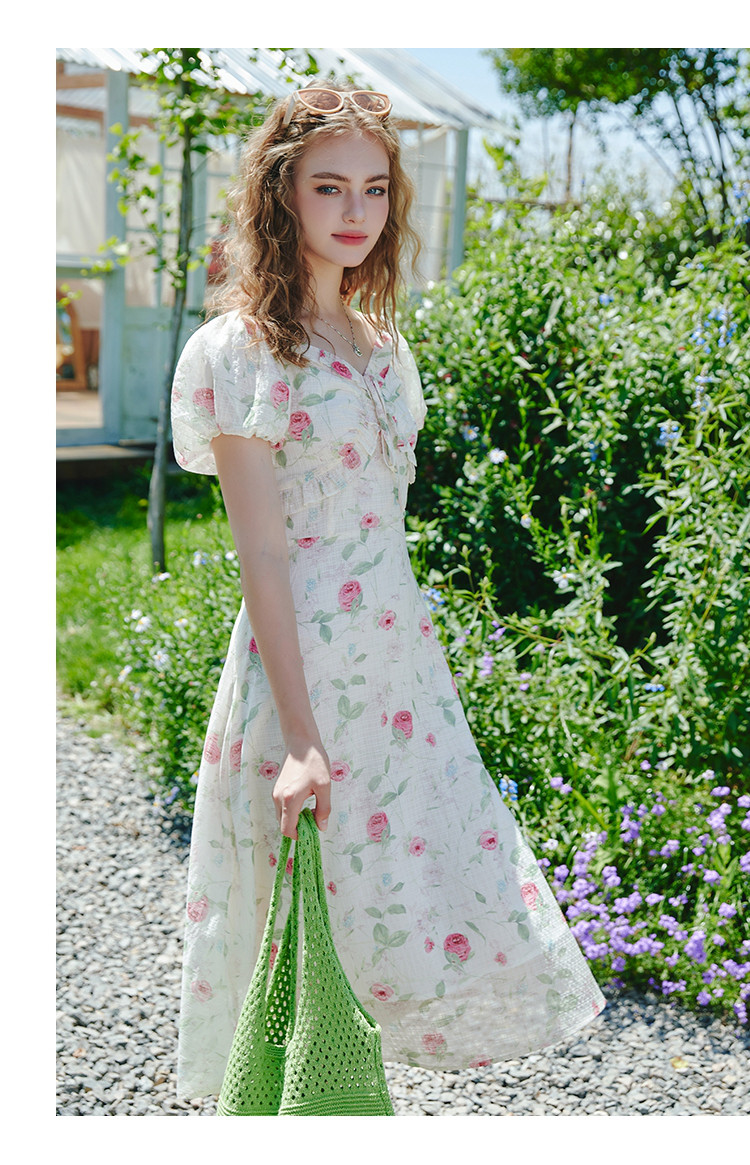 商品名称:V领小清新泡泡袖系带设计感连衣裙夏季休闲气质碎花裙 256093