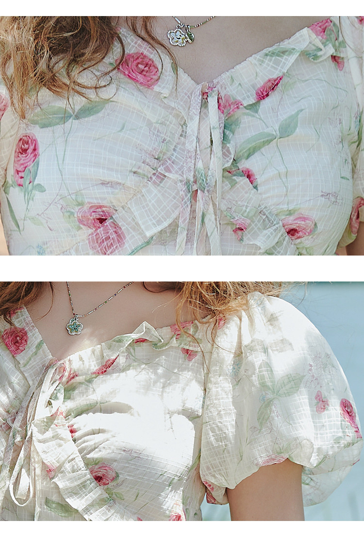 V领小清新泡泡袖系带设计感连衣裙夏季休闲气质碎花裙 256093