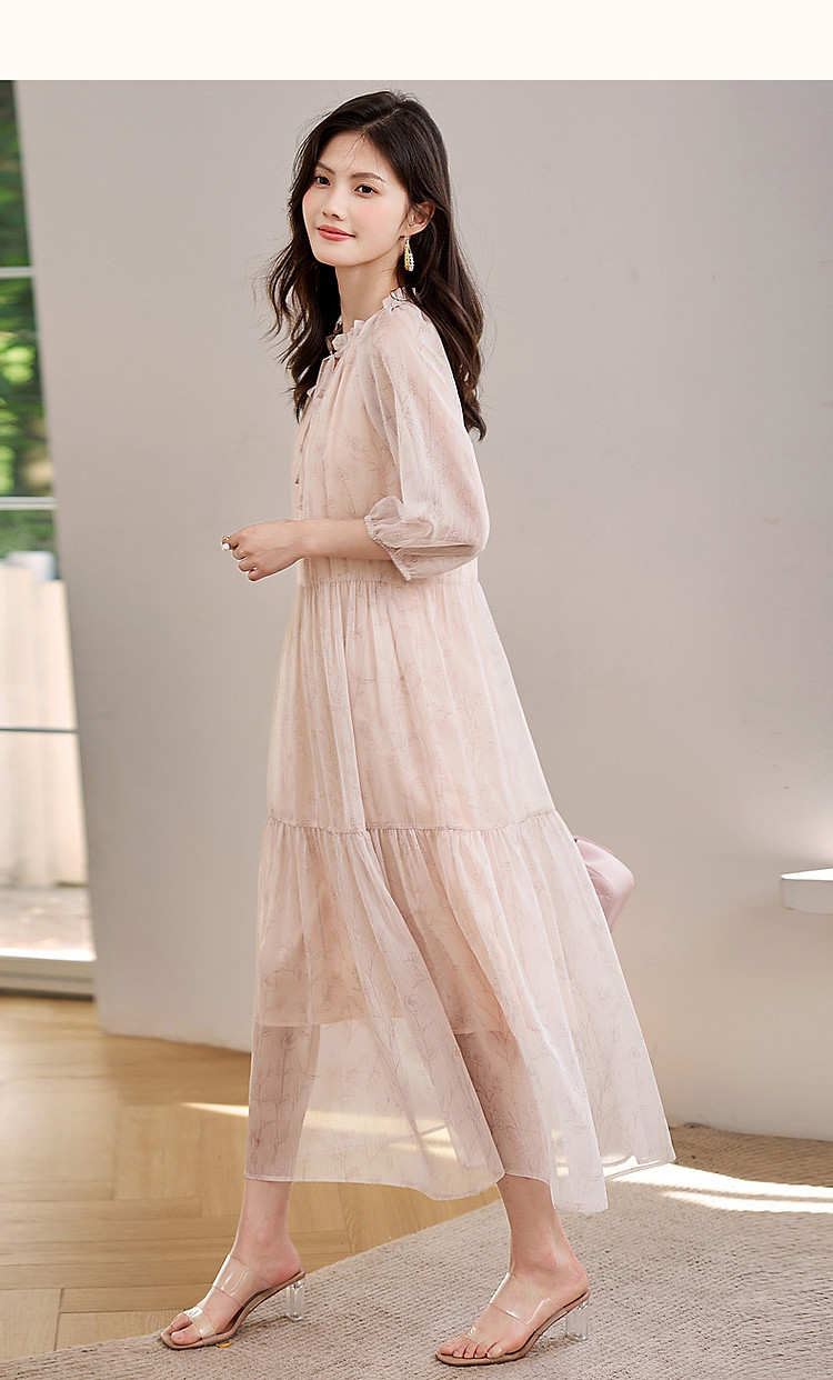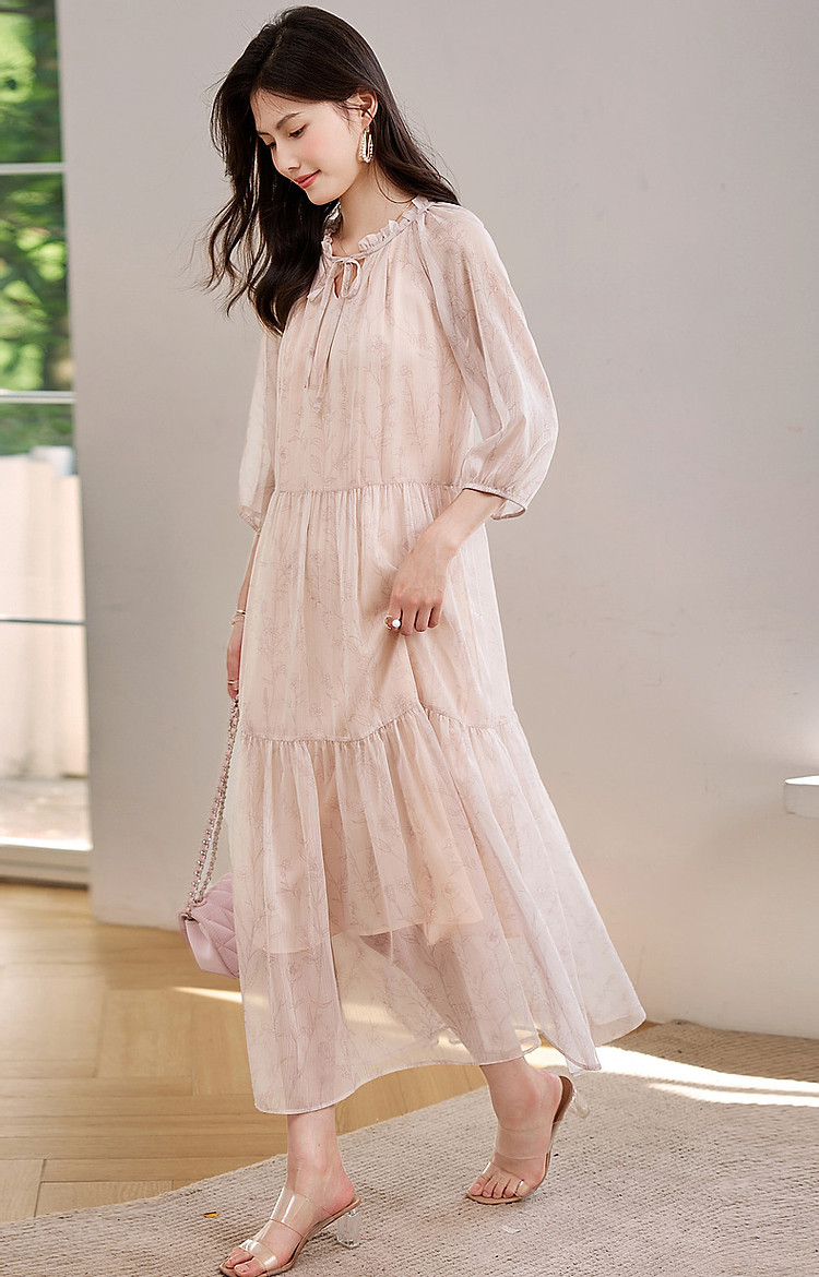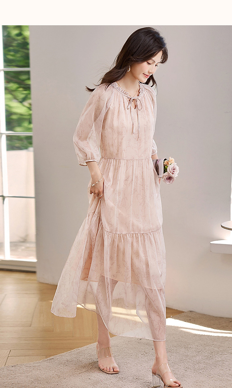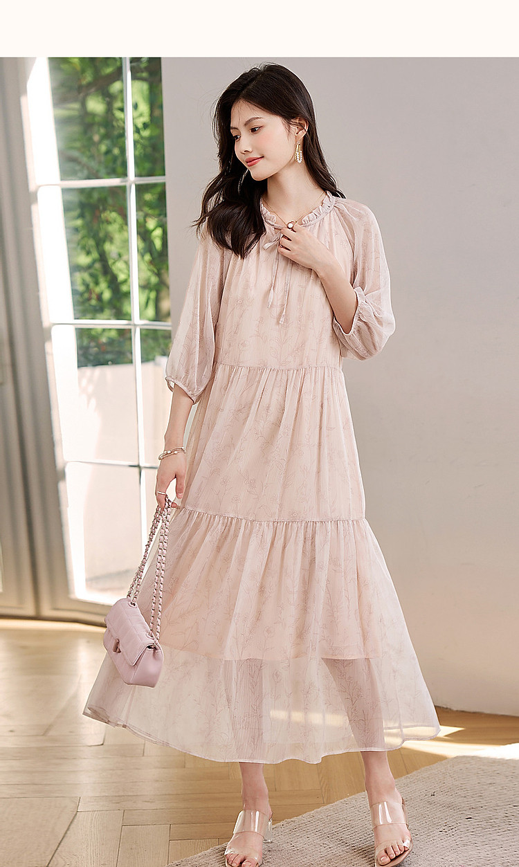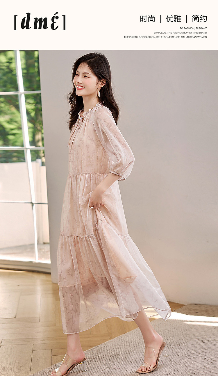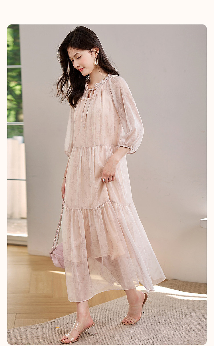 【暗香浮动】夏国风新中式度假淑女系带领雪纺印花七分袖连衣裙女 252417