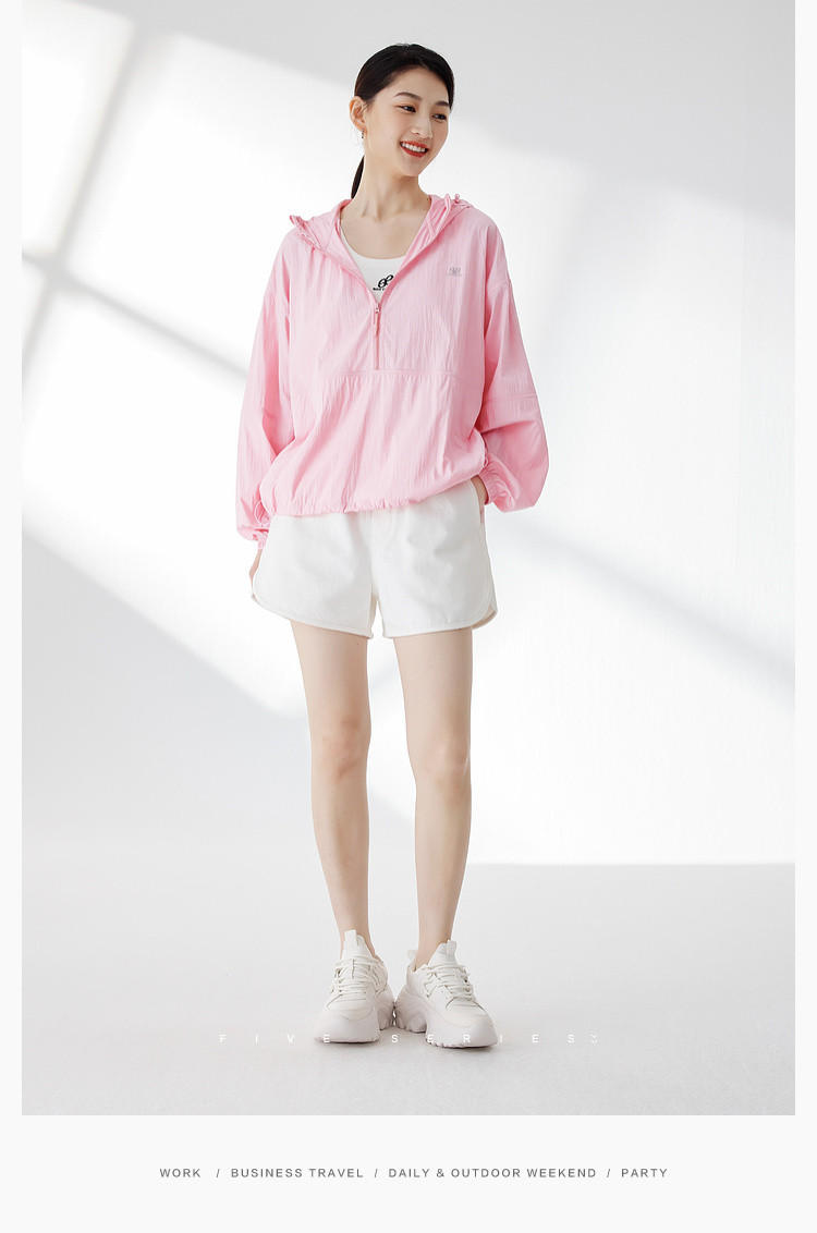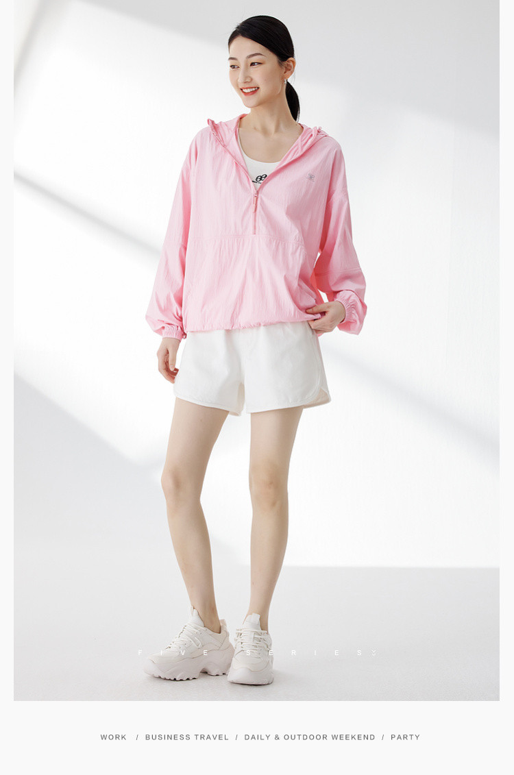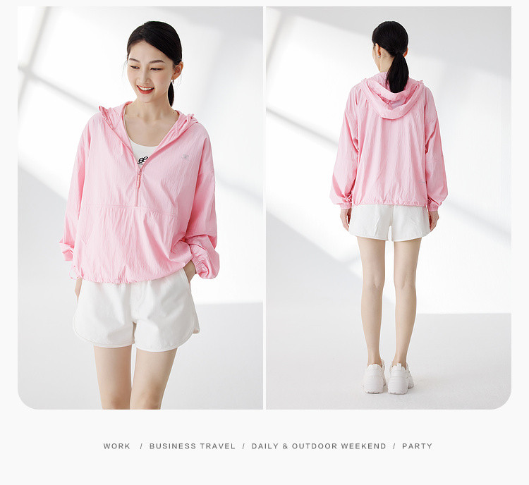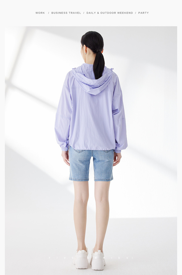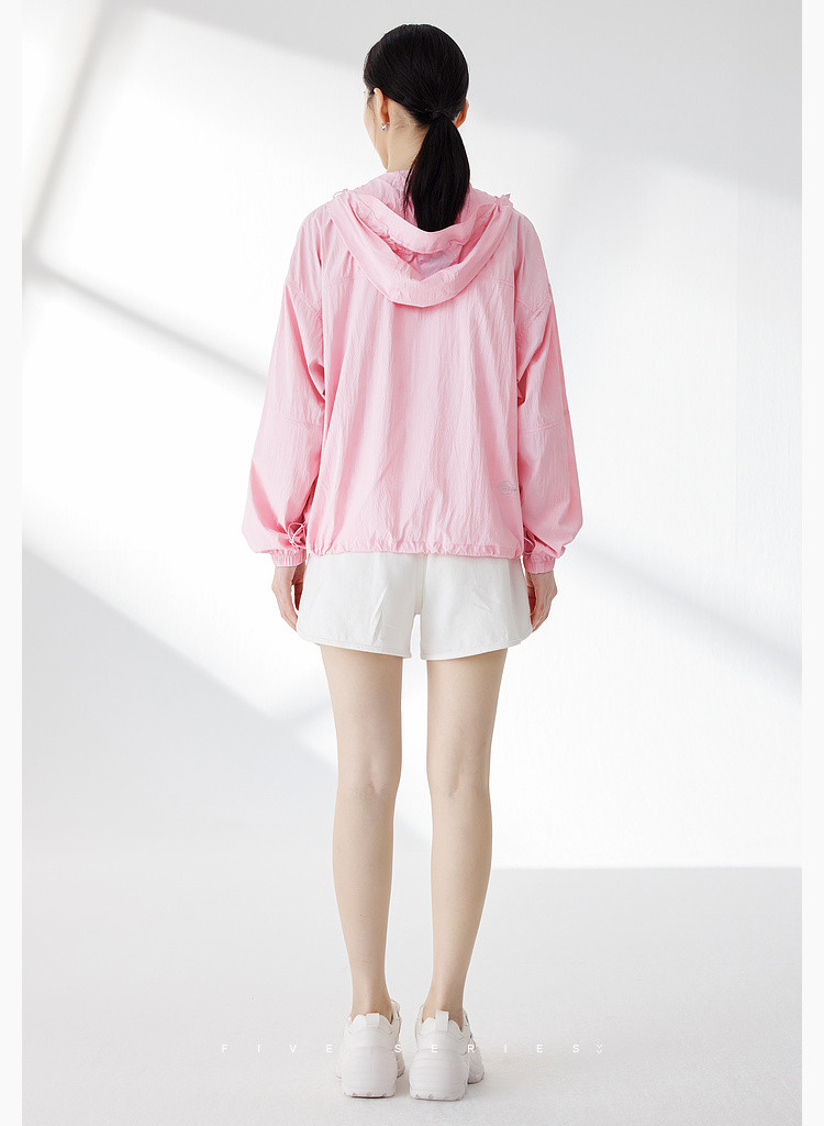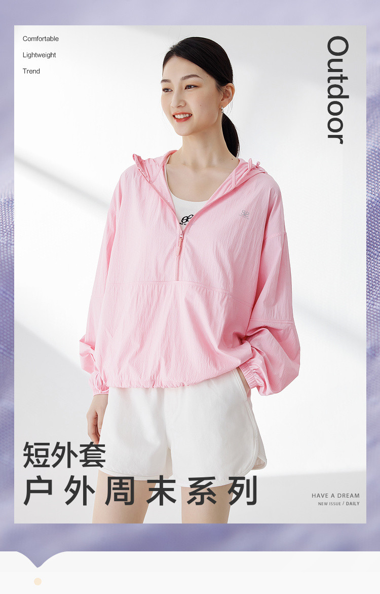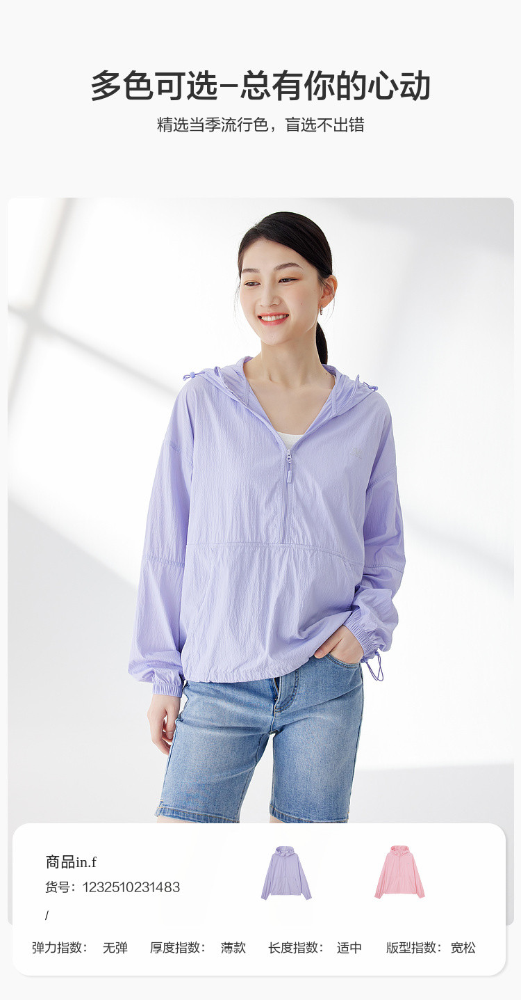 商品名称:户外运动纯色连帽轻薄外套女春夏季宽松时尚休闲百搭防护小衫女 932419