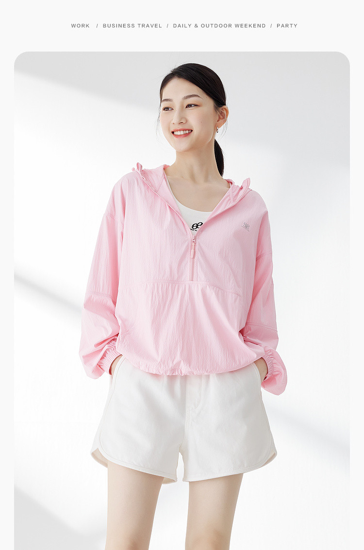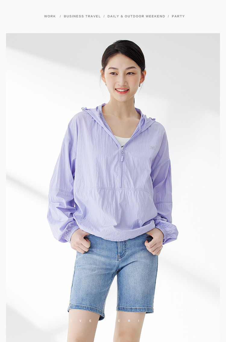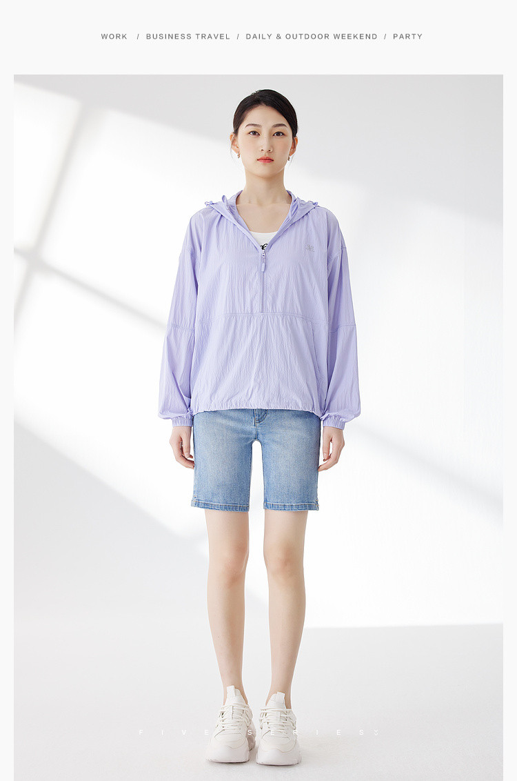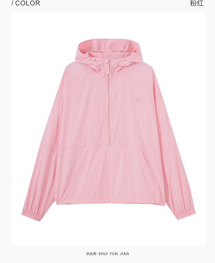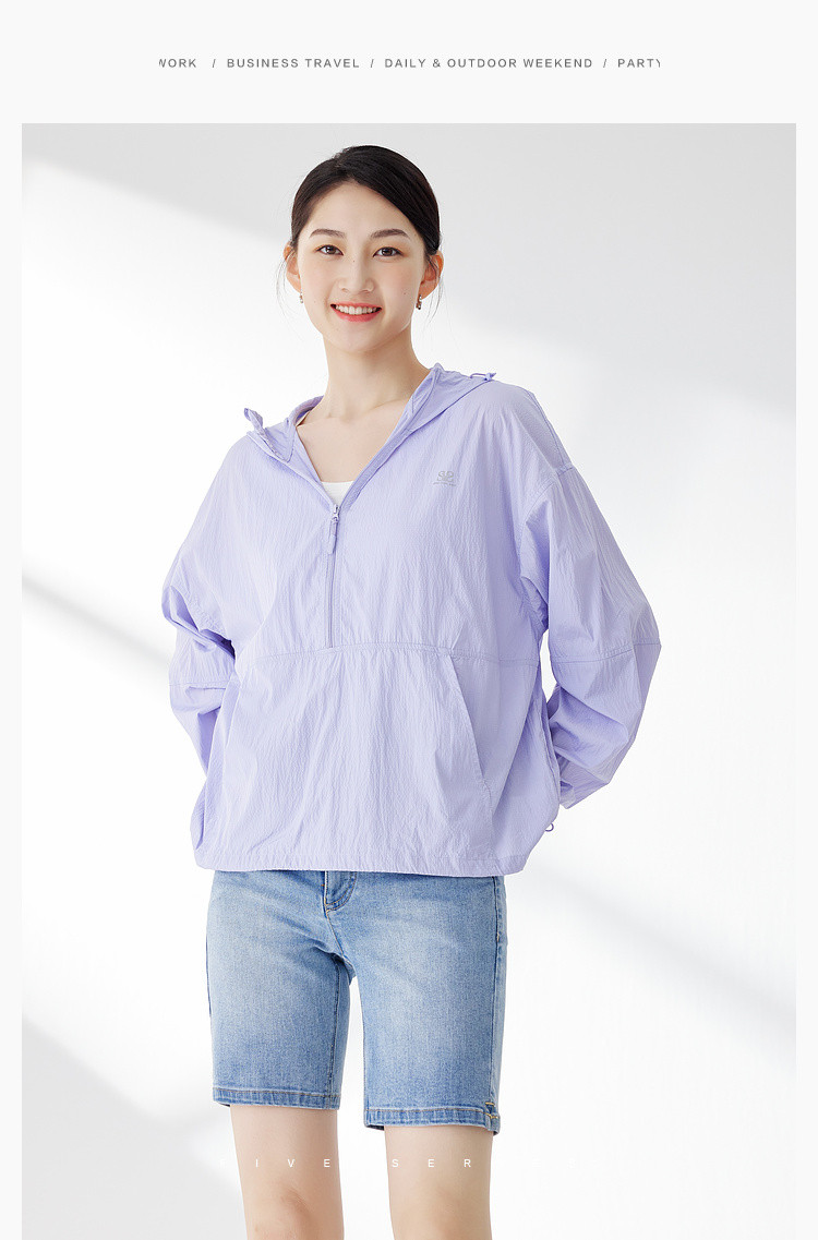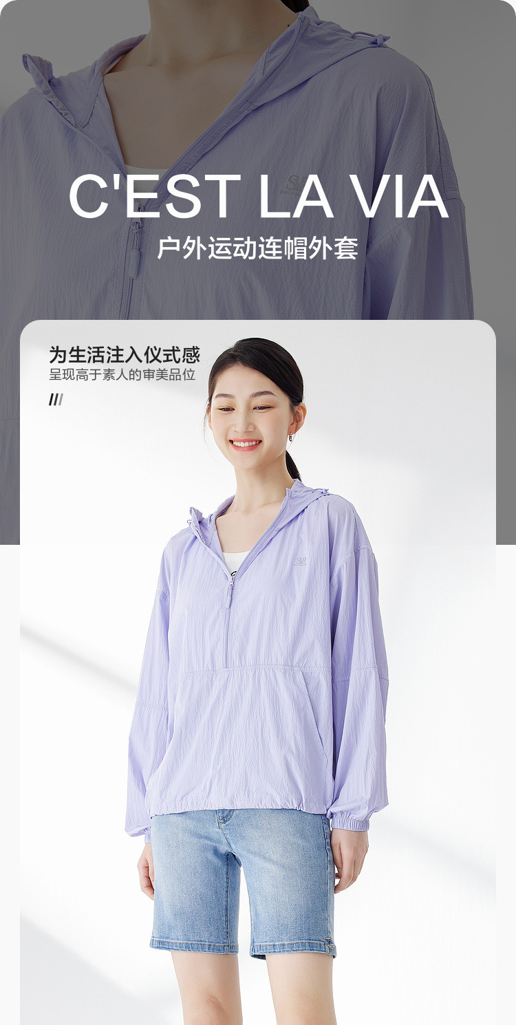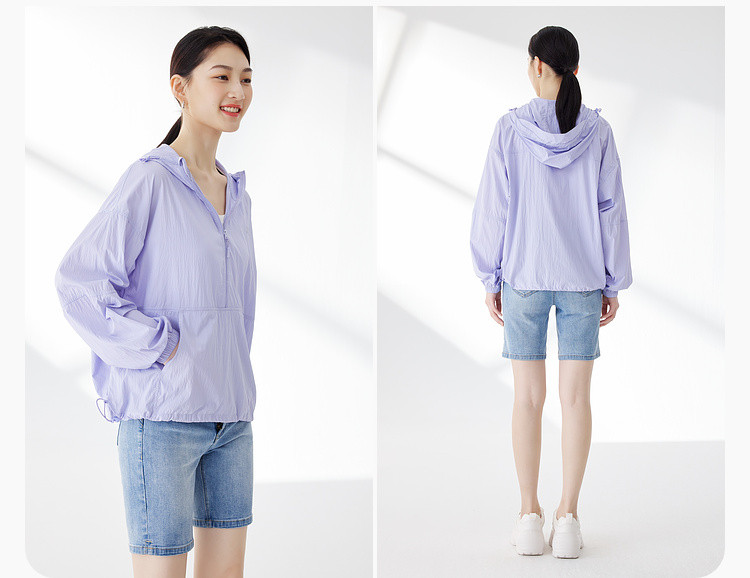 商品名称:户外运动纯色连帽轻薄外套女春夏季宽松时尚休闲百搭防护小衫女 932419