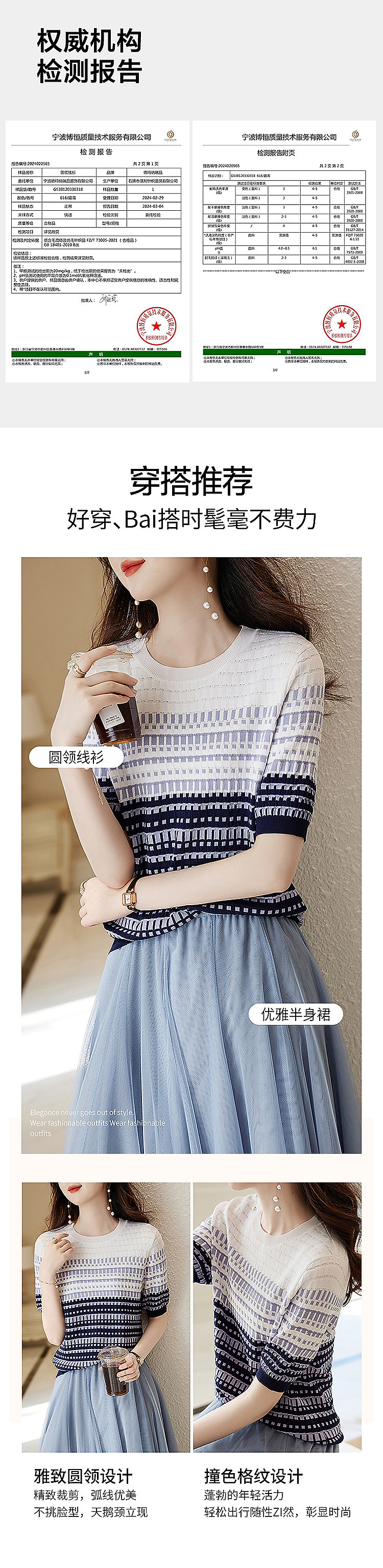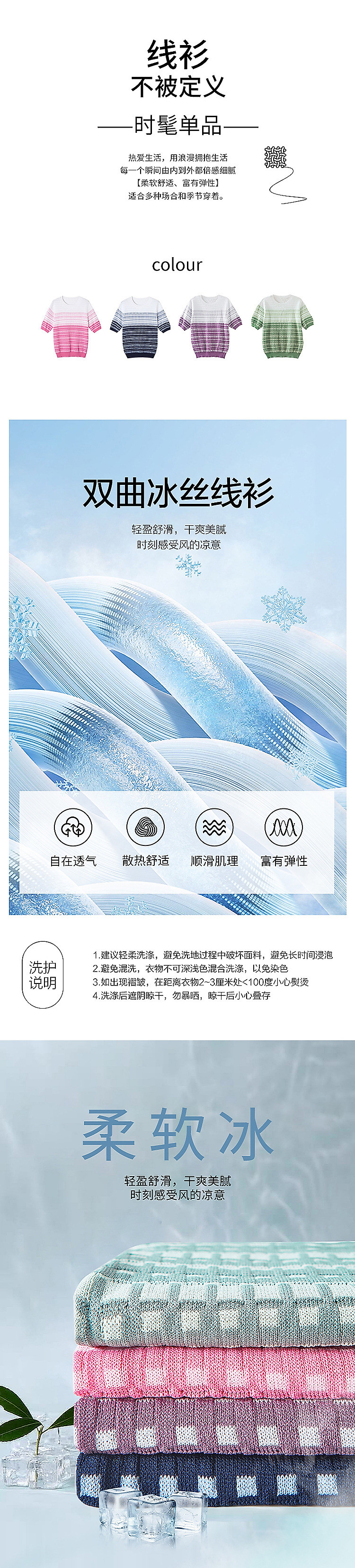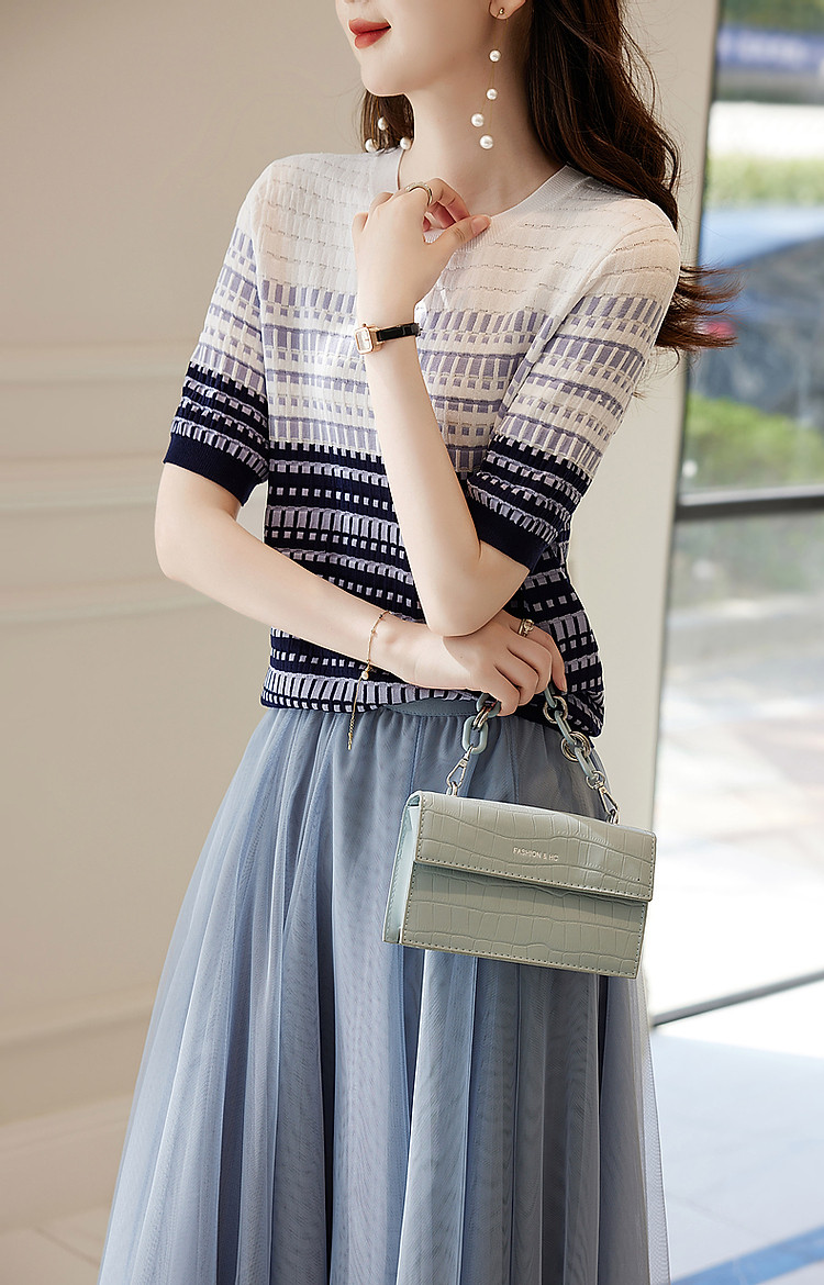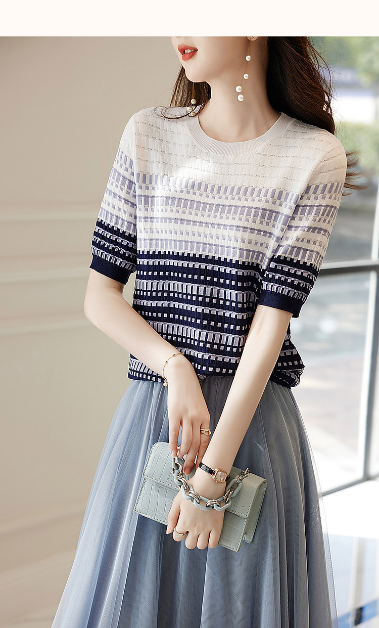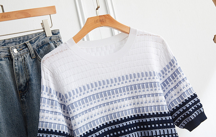 商品名称:【冰川玫瑰】夏季双曲冰麻线衫圆领撞色提花小个子针织衫女上衣 620737