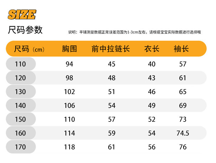 | 尺码 | 衣长(cm) | 身高(cm) | 袖长(cm) | 适合年龄 | 胸围(cm) | 号型 |