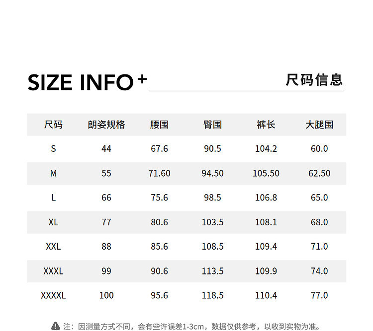 | 尺码 | 大腿围(cm) | 腰围(cm) | 裤长(cm) | 臀围(cm) | 号型 |