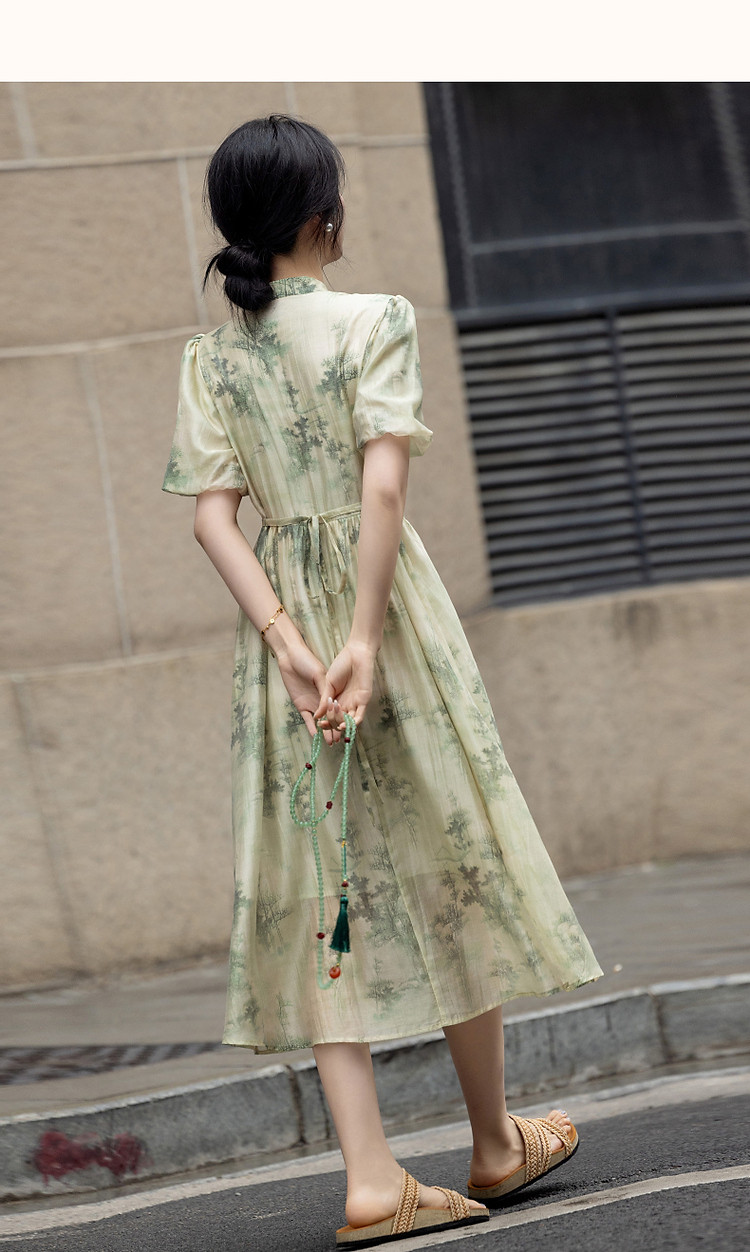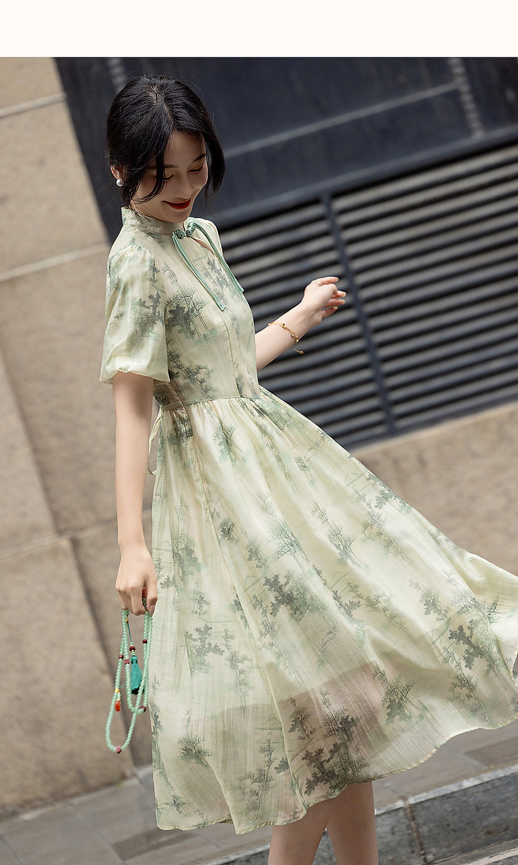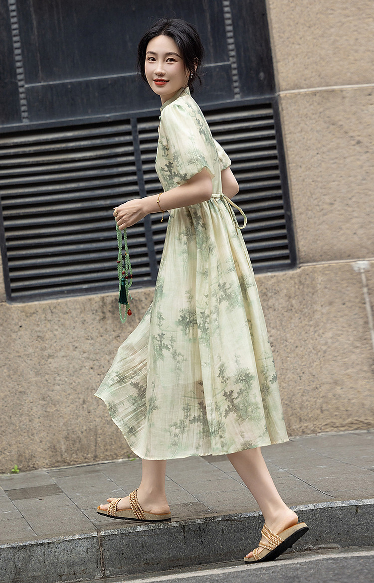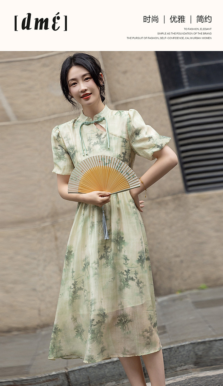 【亚麻莱赛尔混纺】夏季国风新中式立领盘扣印花女式旗袍连衣裙 649729