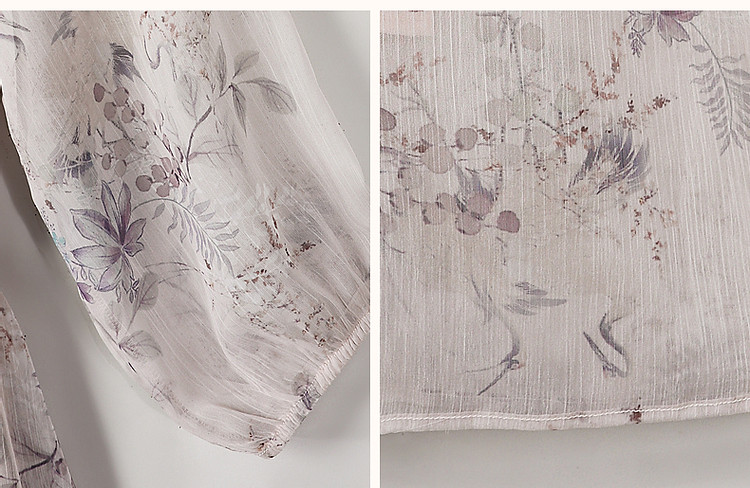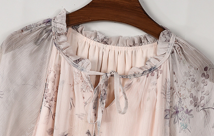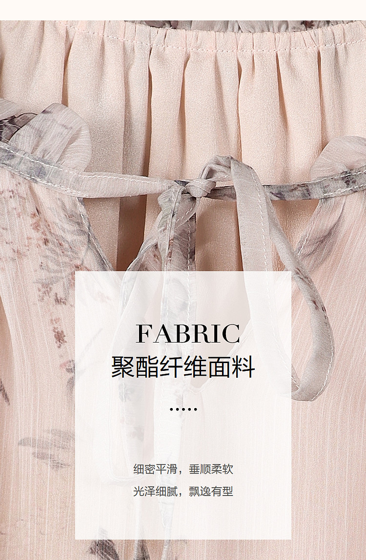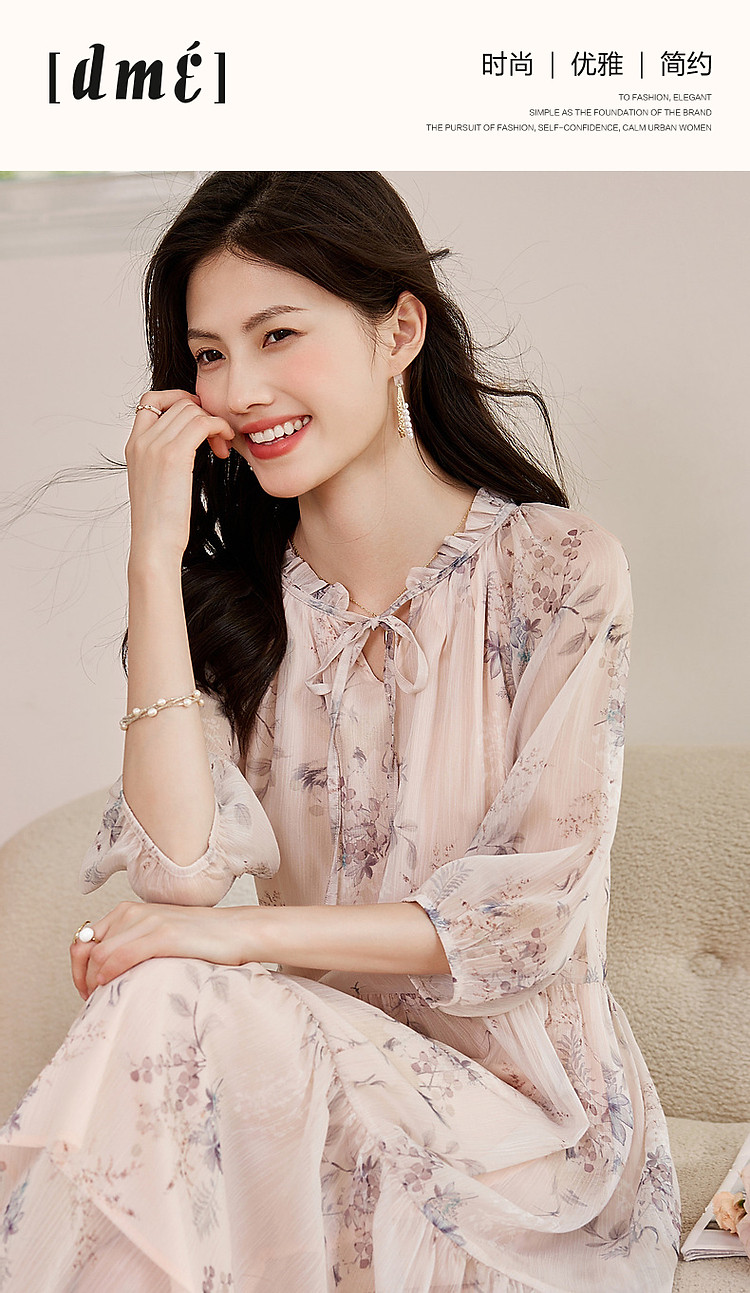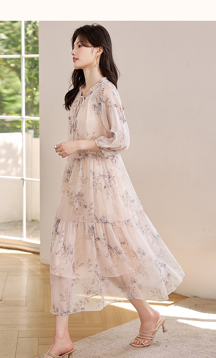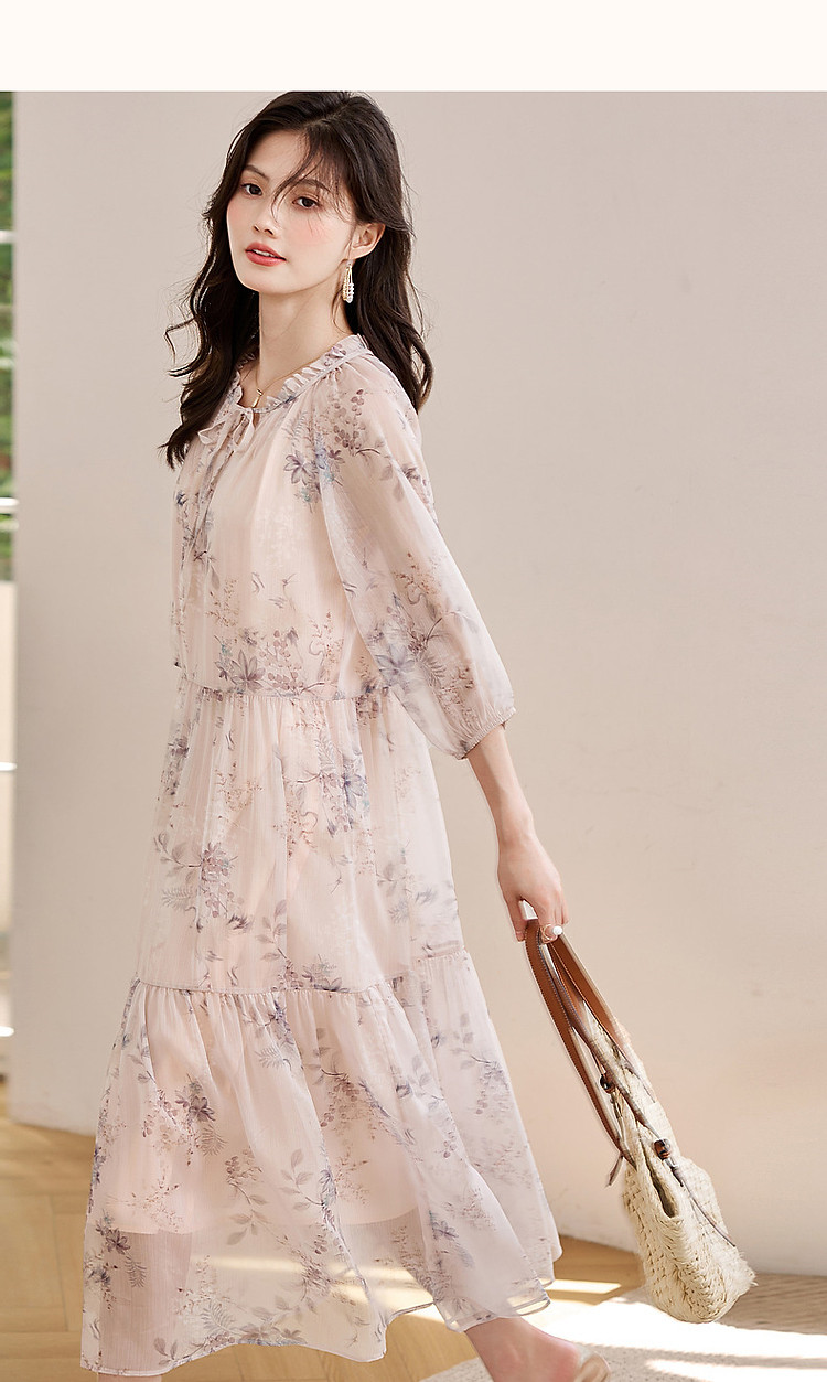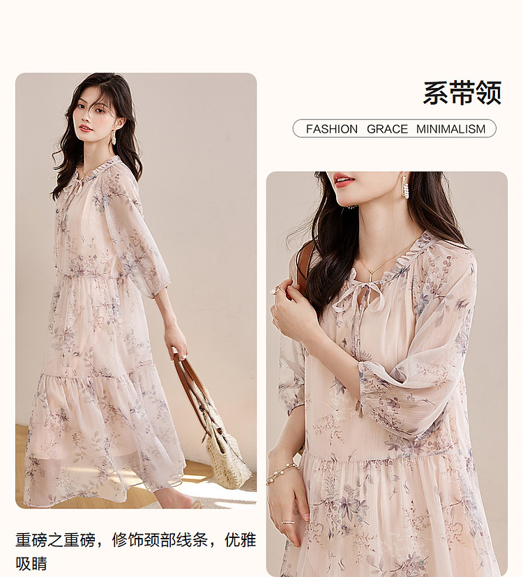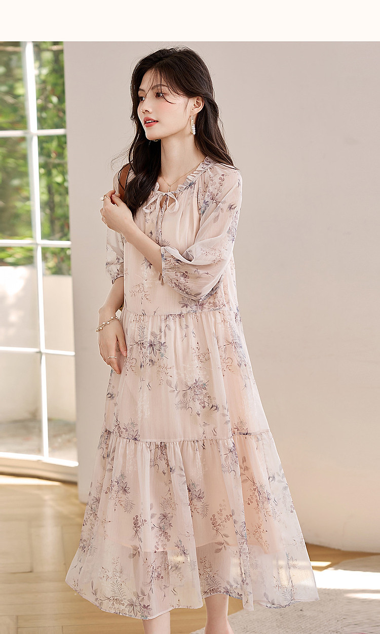 商品名称:【花间令系列】夏国风新中式度假淑女系带领雪纺印花七分袖连衣裙 743937