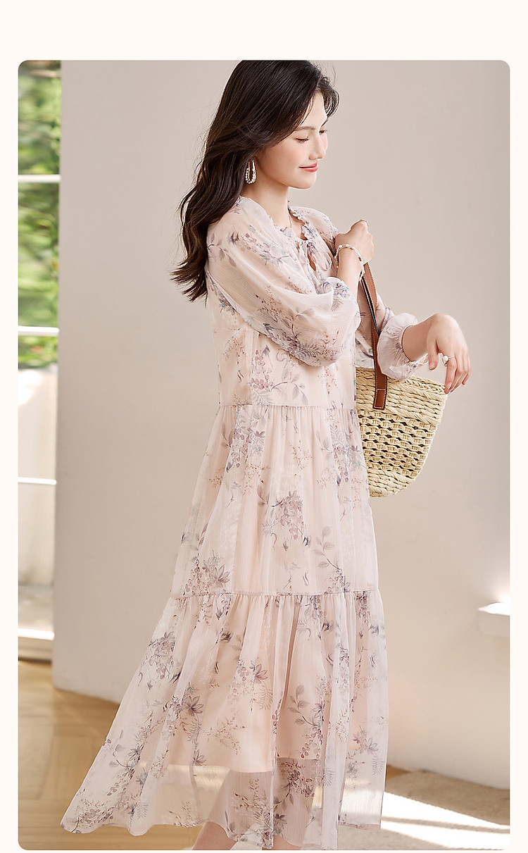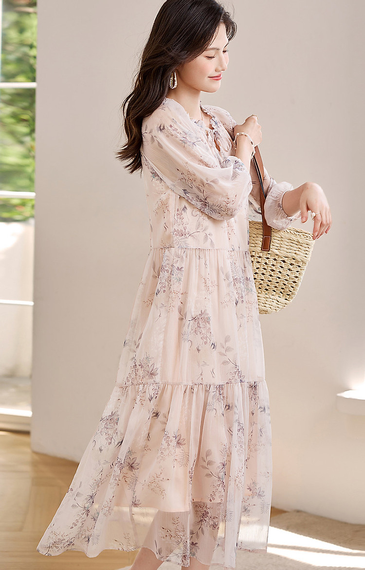 【花间令系列】夏国风新中式度假淑女系带领雪纺印花七分袖连衣裙 743937