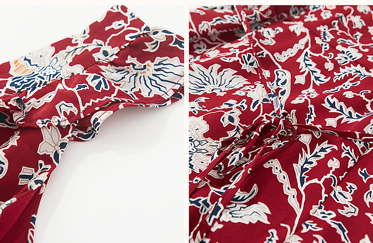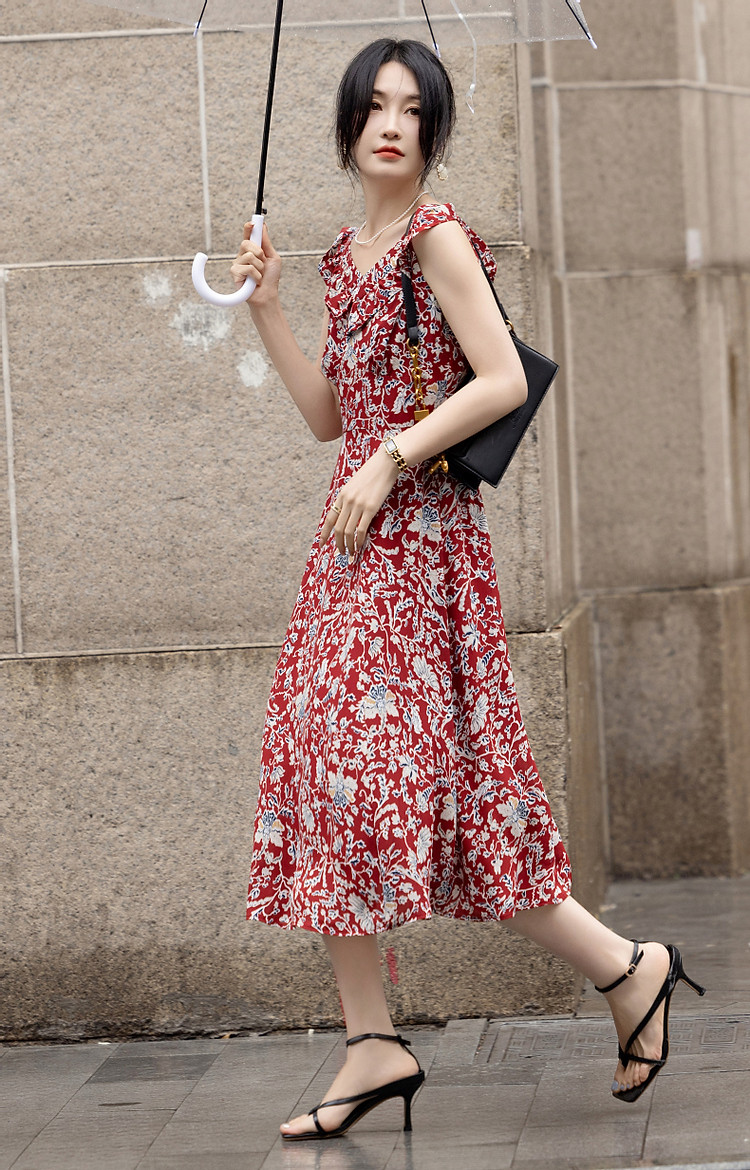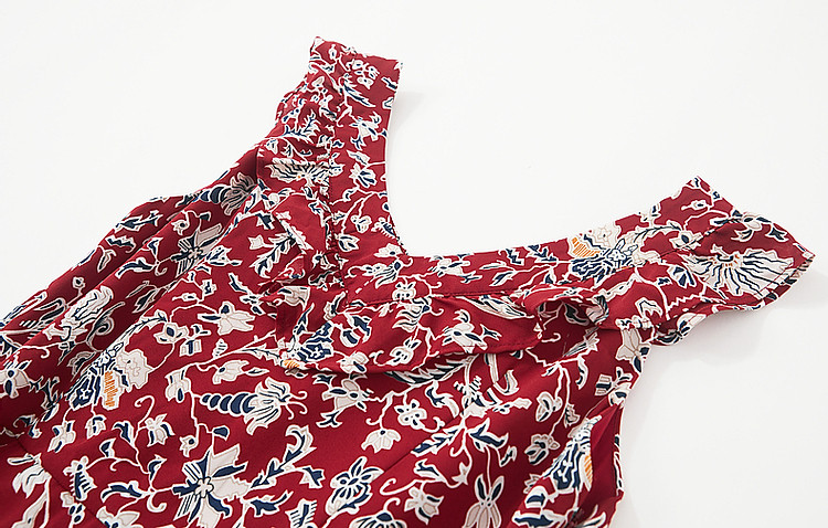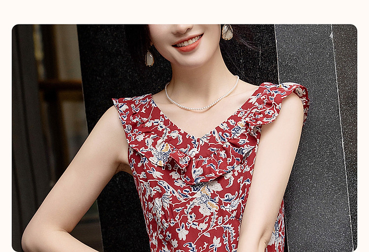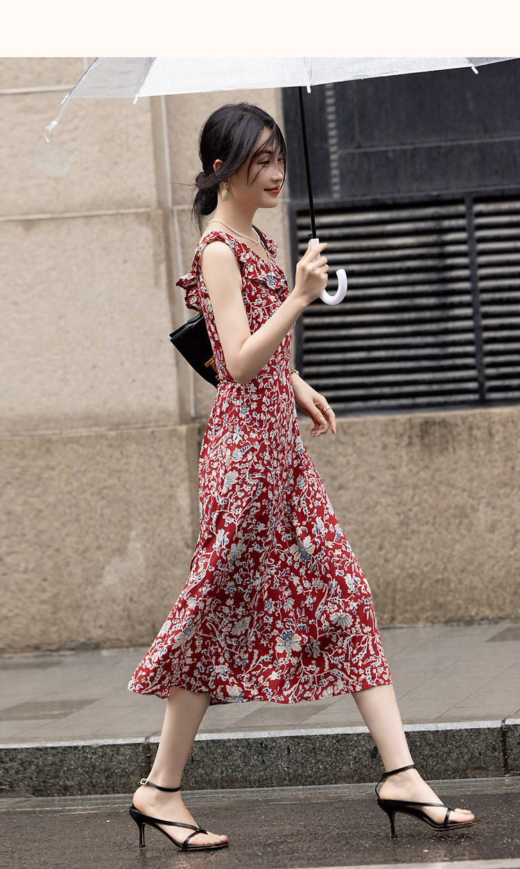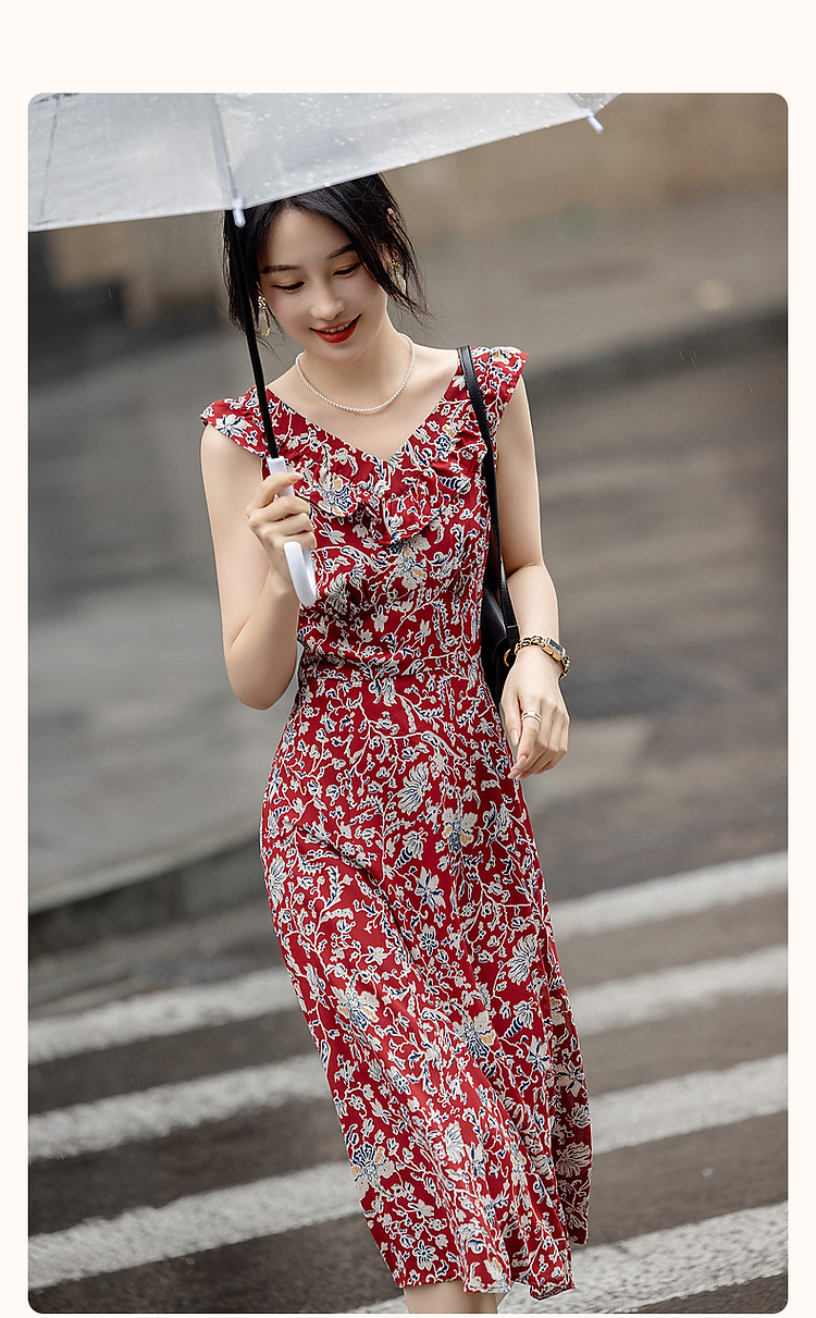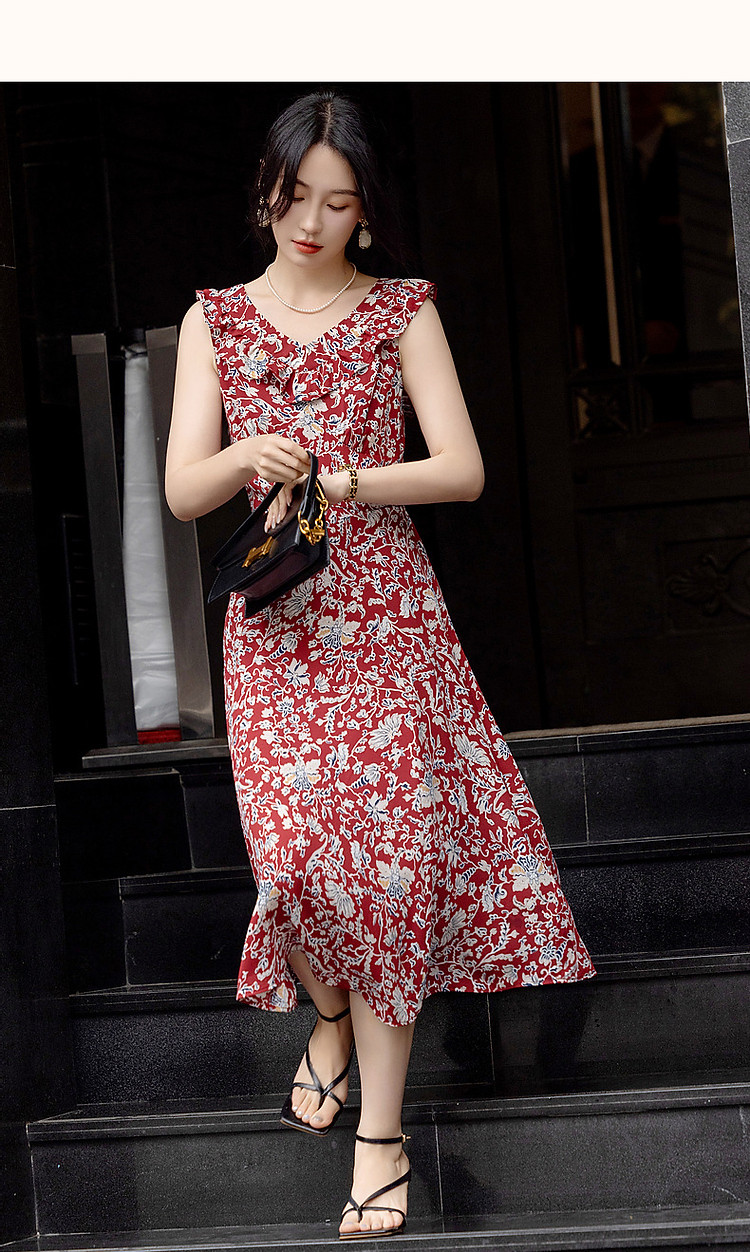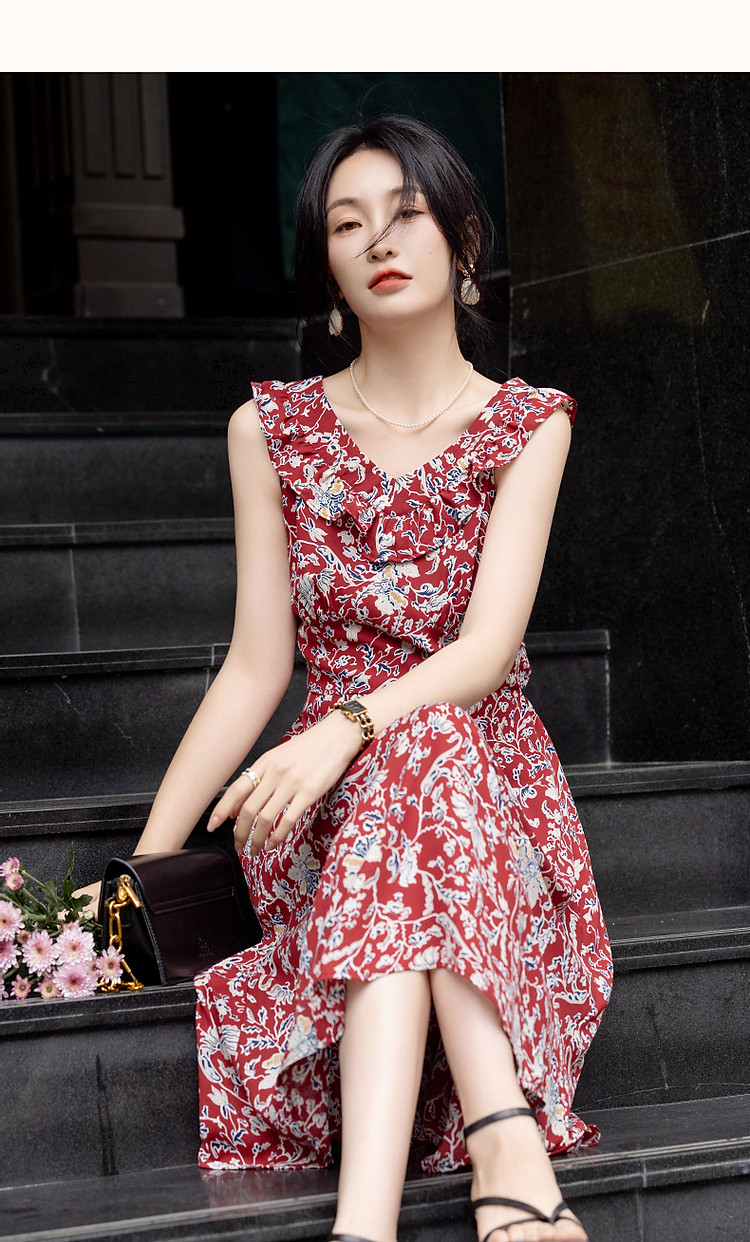 商品名称:【东方绮梦系列】夏国风新中式V领木耳边背心裙植物印花连衣裙女 612865