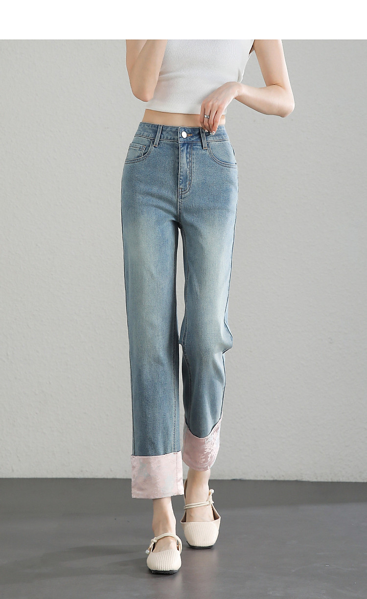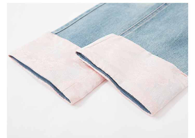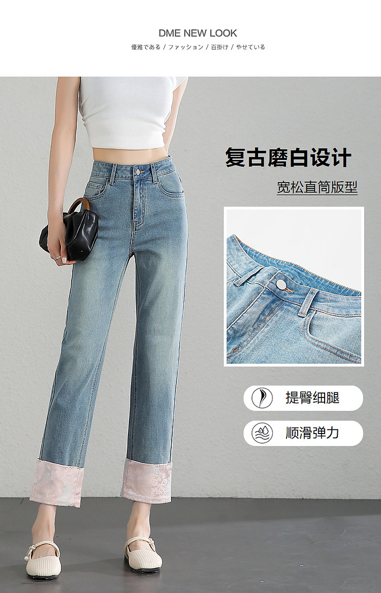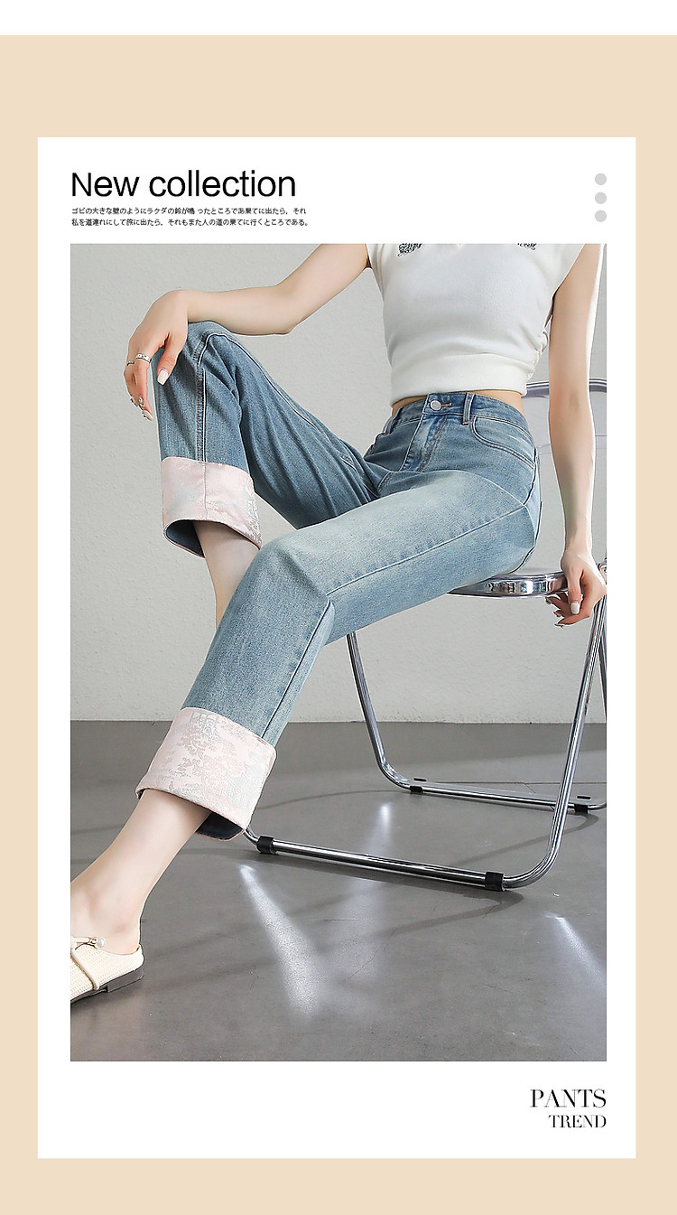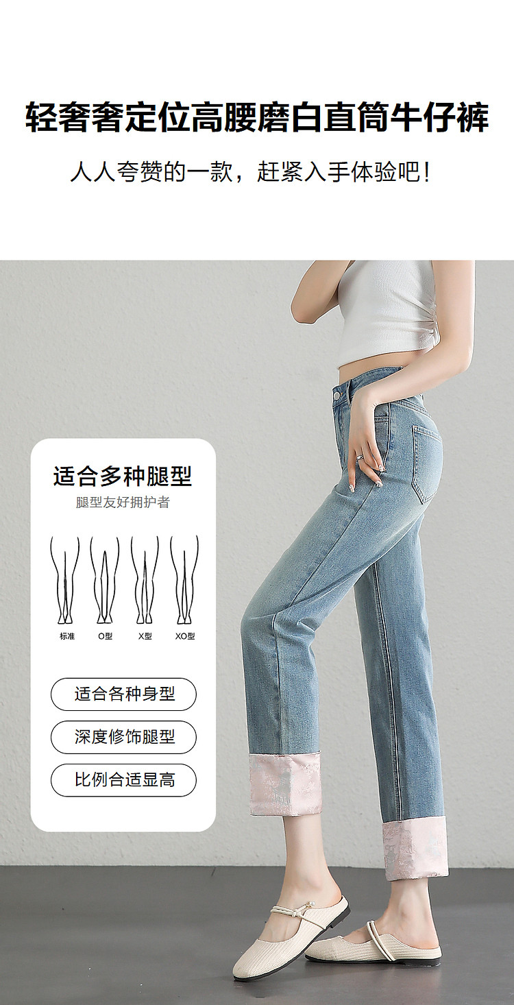 商品名称:【筷子腿系列】夏高腰显瘦做旧磨白拼接国风提花直筒九分牛仔裤 268801