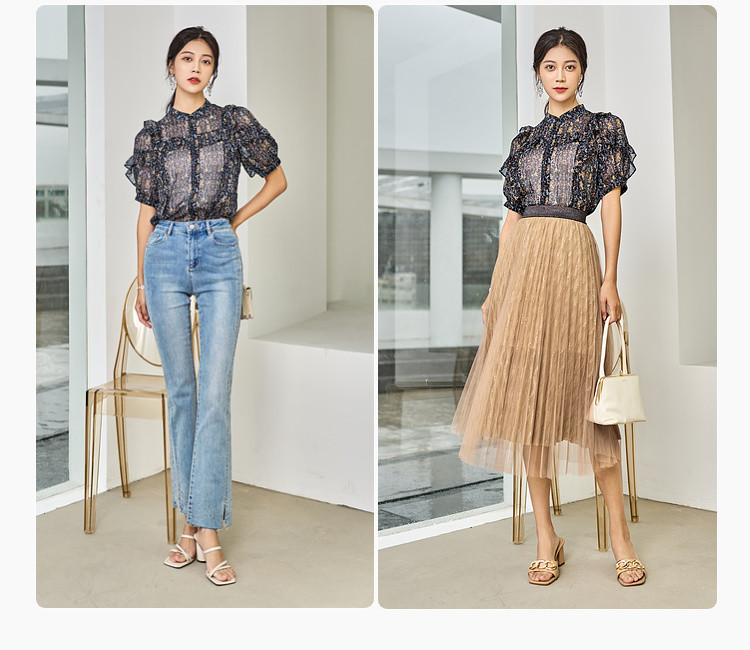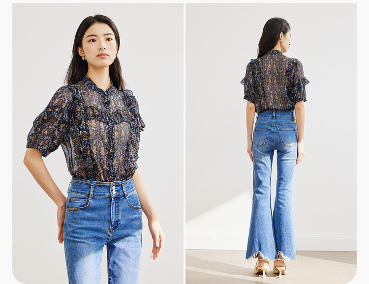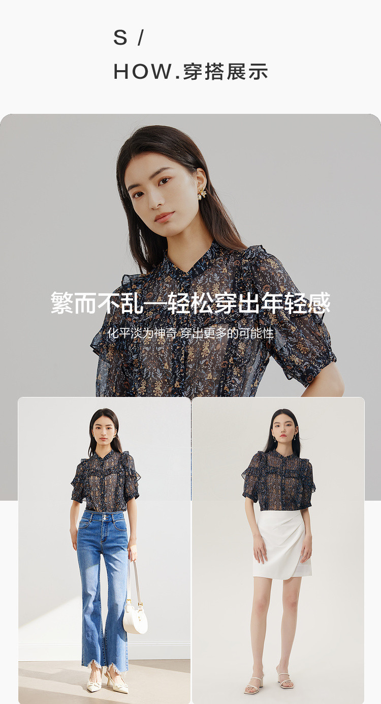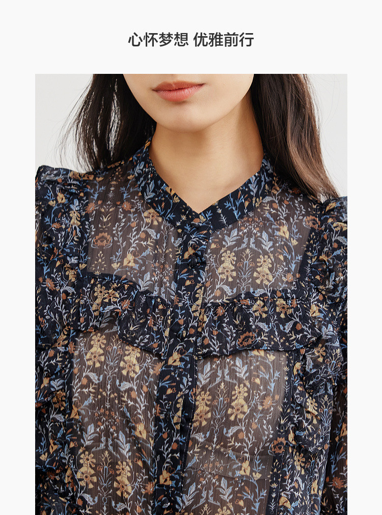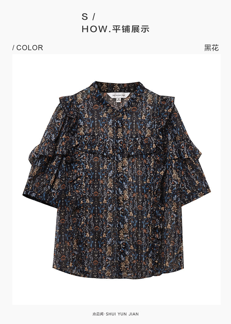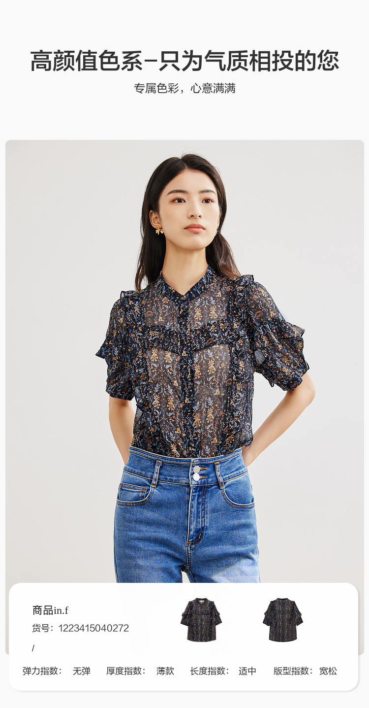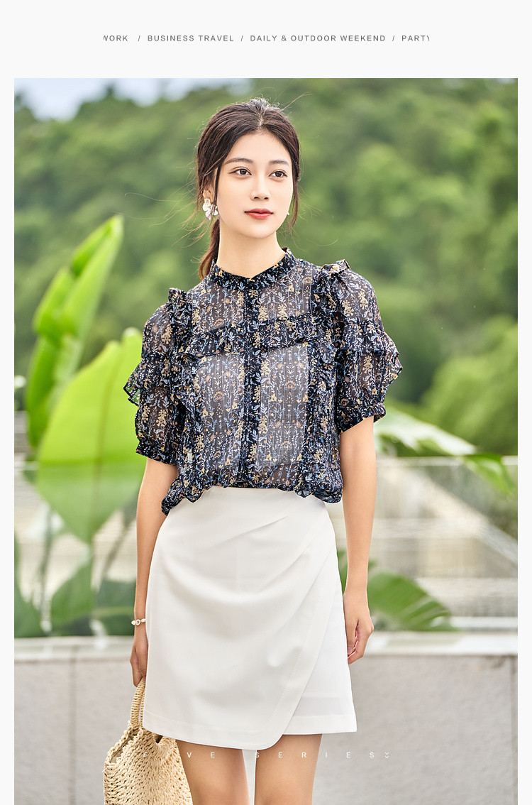商品名称:设计感复古碎花雪纺衫女夏季荷叶边拼接气质设计感通勤立领上衣女 793859