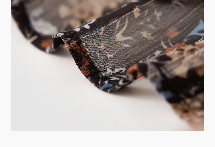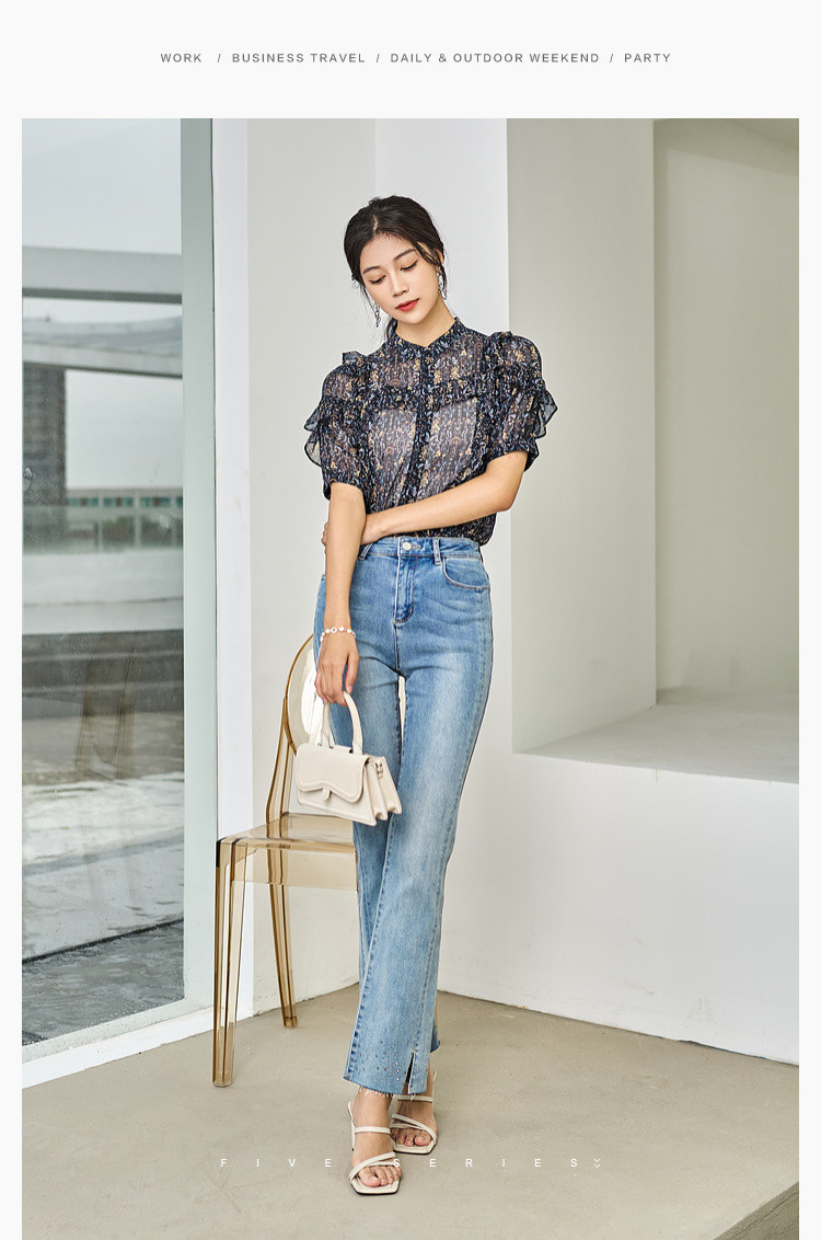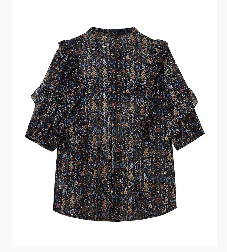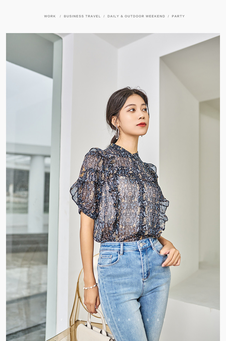设计感复古碎花雪纺衫女夏季荷叶边拼接气质设计感通勤立领上衣女 793859