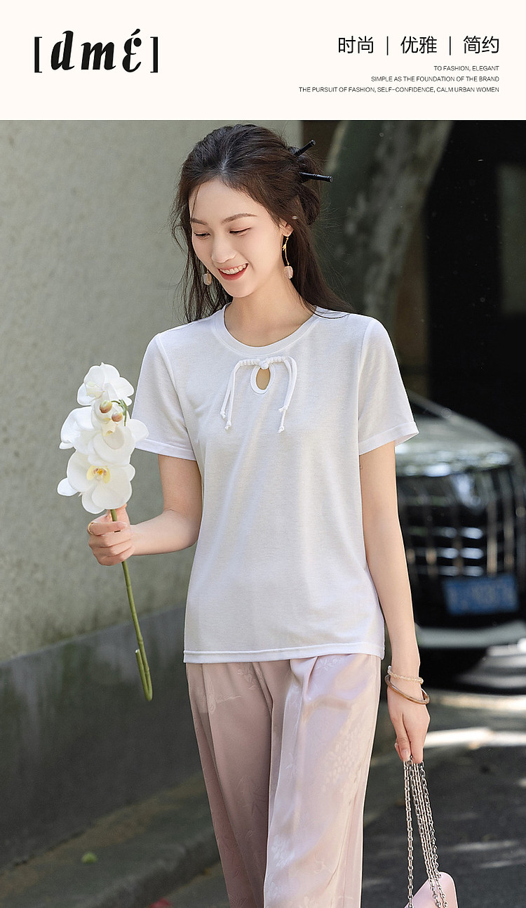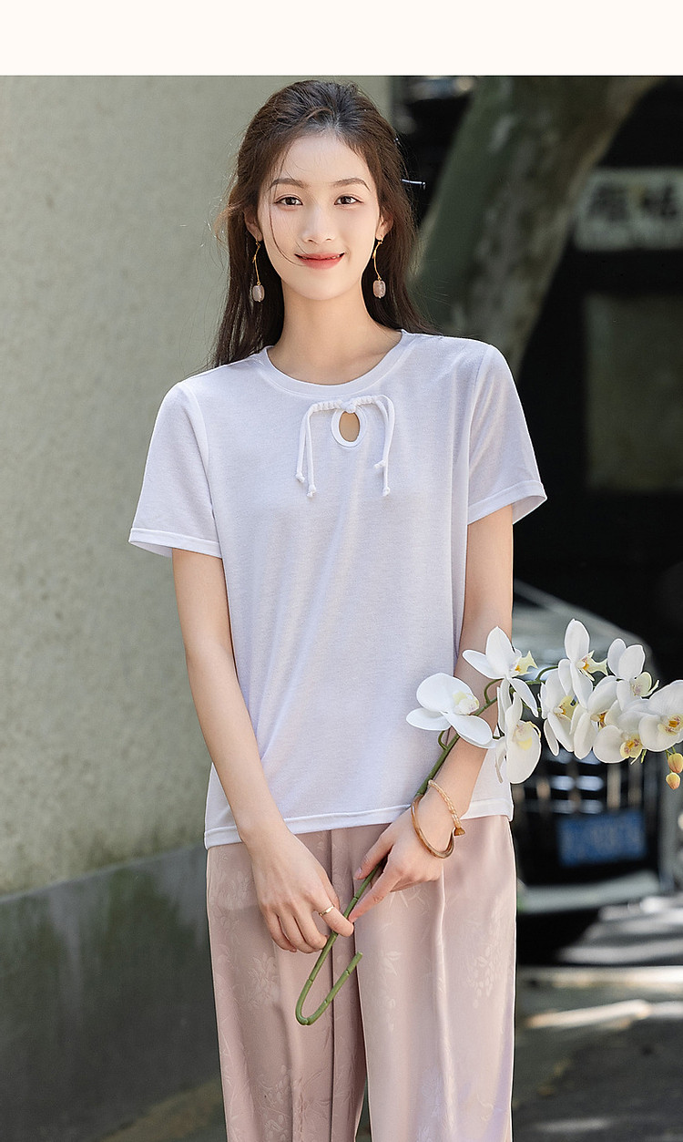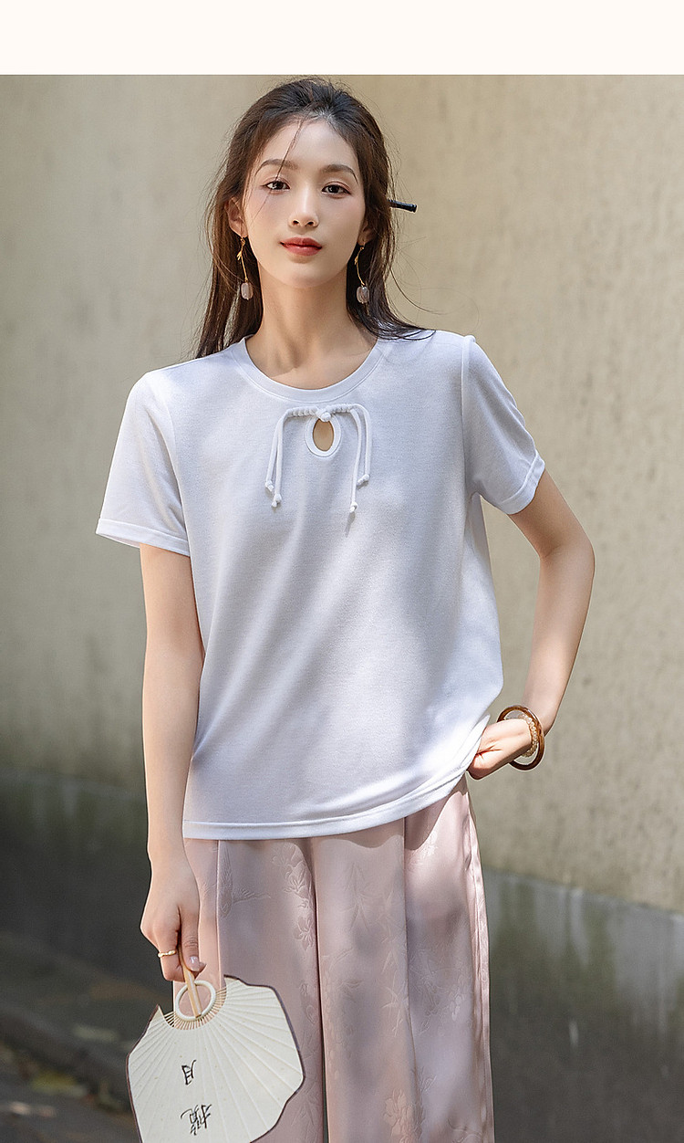商品名称:【薄荷曼波】夏国风新中式雅致圆领盘扣弹力舒适藏肉短袖女式t恤 506369