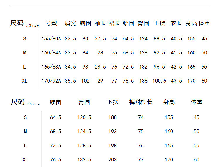 | 尺码 | 裙长(cm) | 肩宽(cm) | 袖长(cm) | 上装号型 | 下装号型 | 衣长(cm) | 腰围(cm) | 臀围(cm) | 胸围(cm) | 号型 |