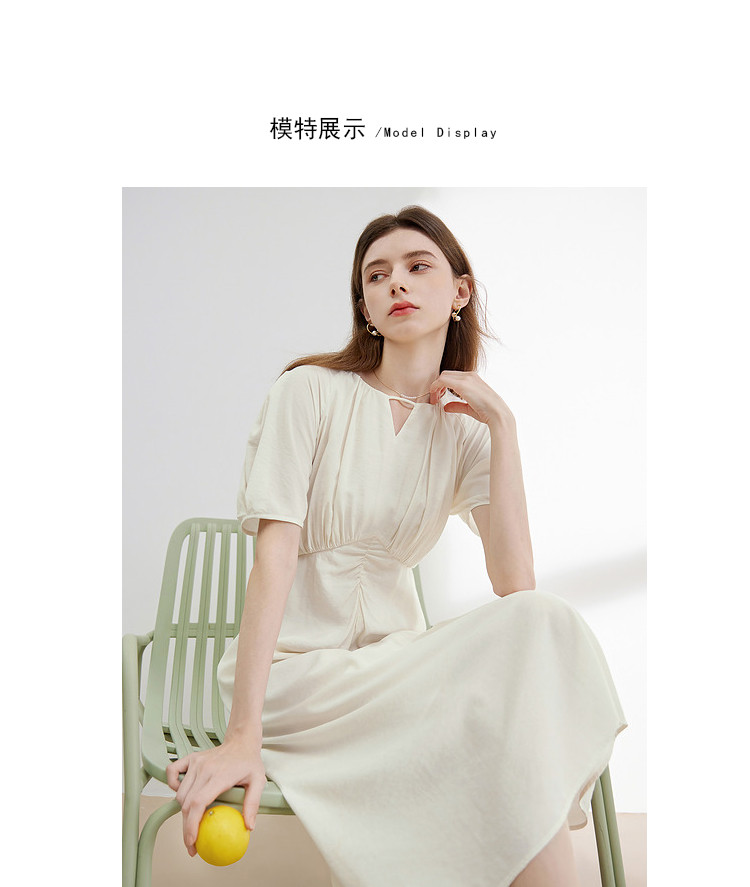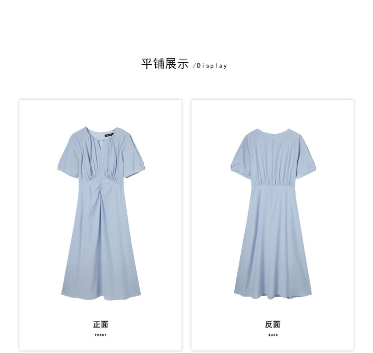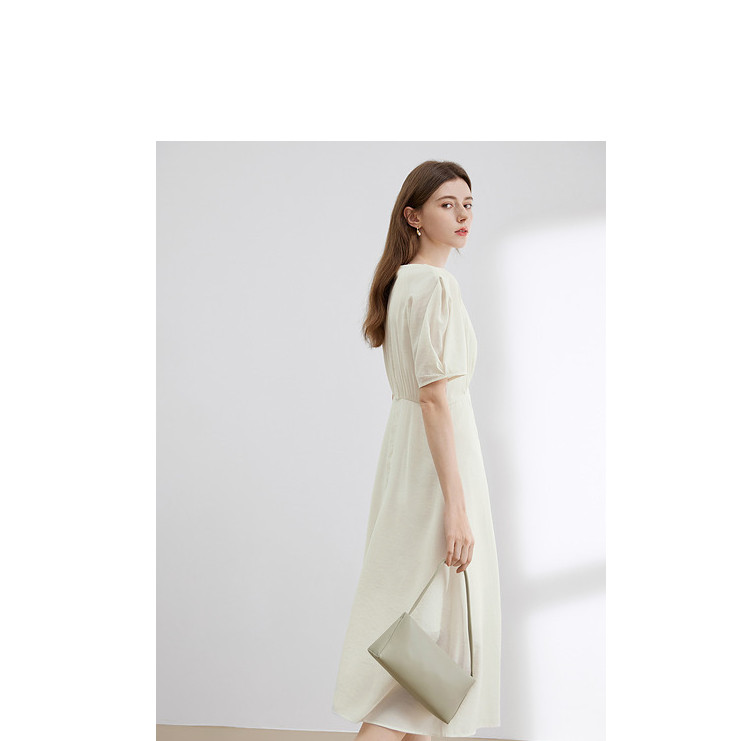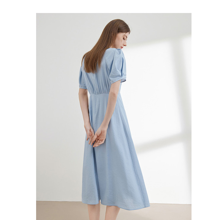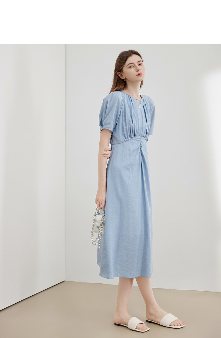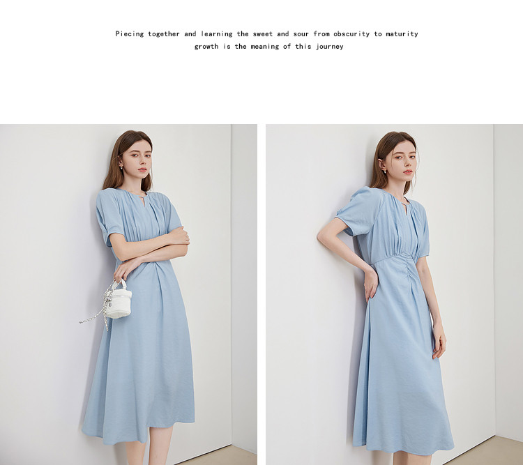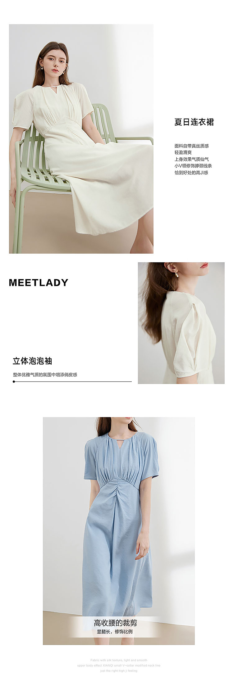 商品名称:【2024夏季】小V领收腰连衣裙女简约泡泡袖通勤风高腰裙子 442772