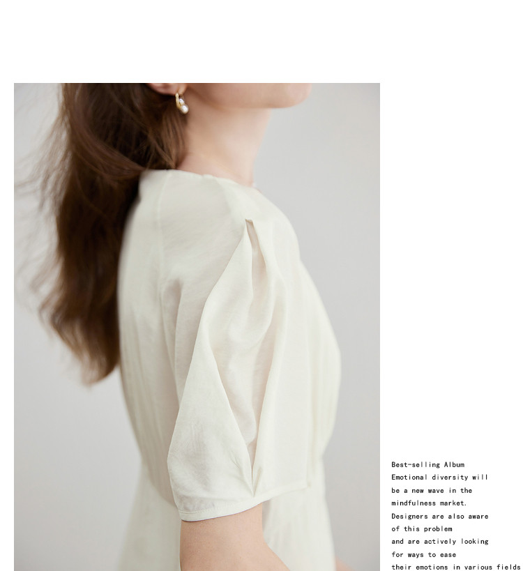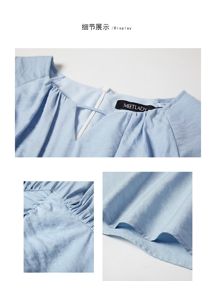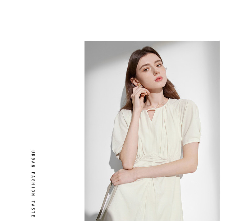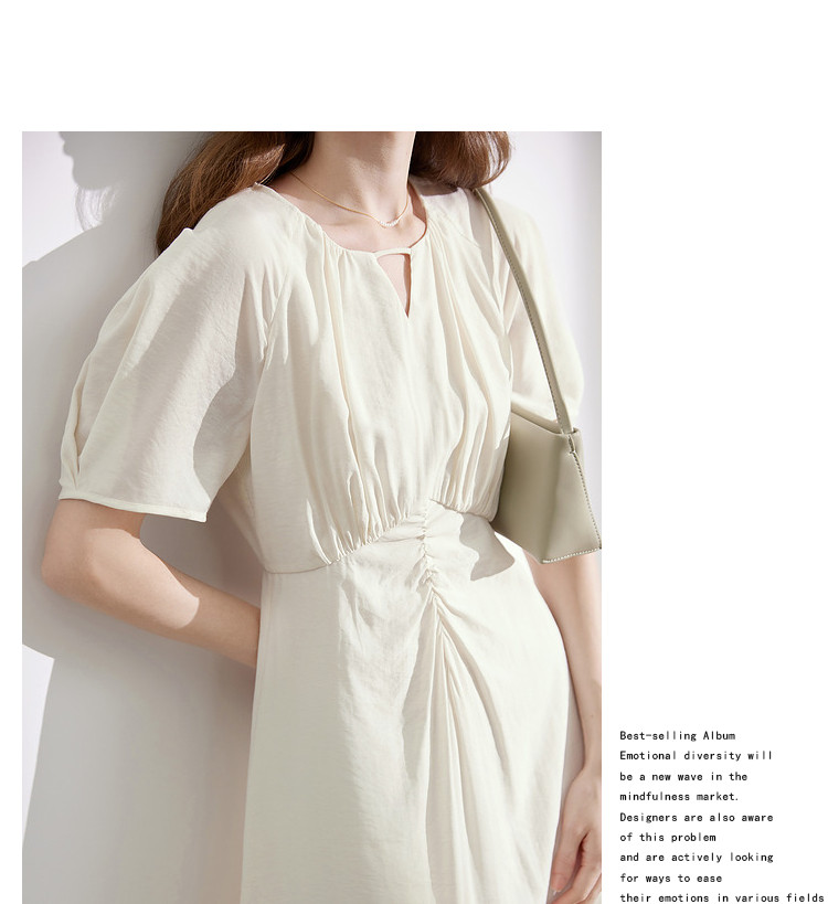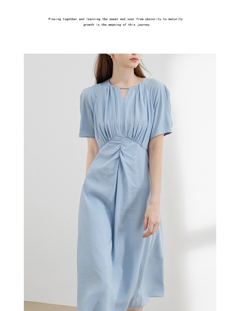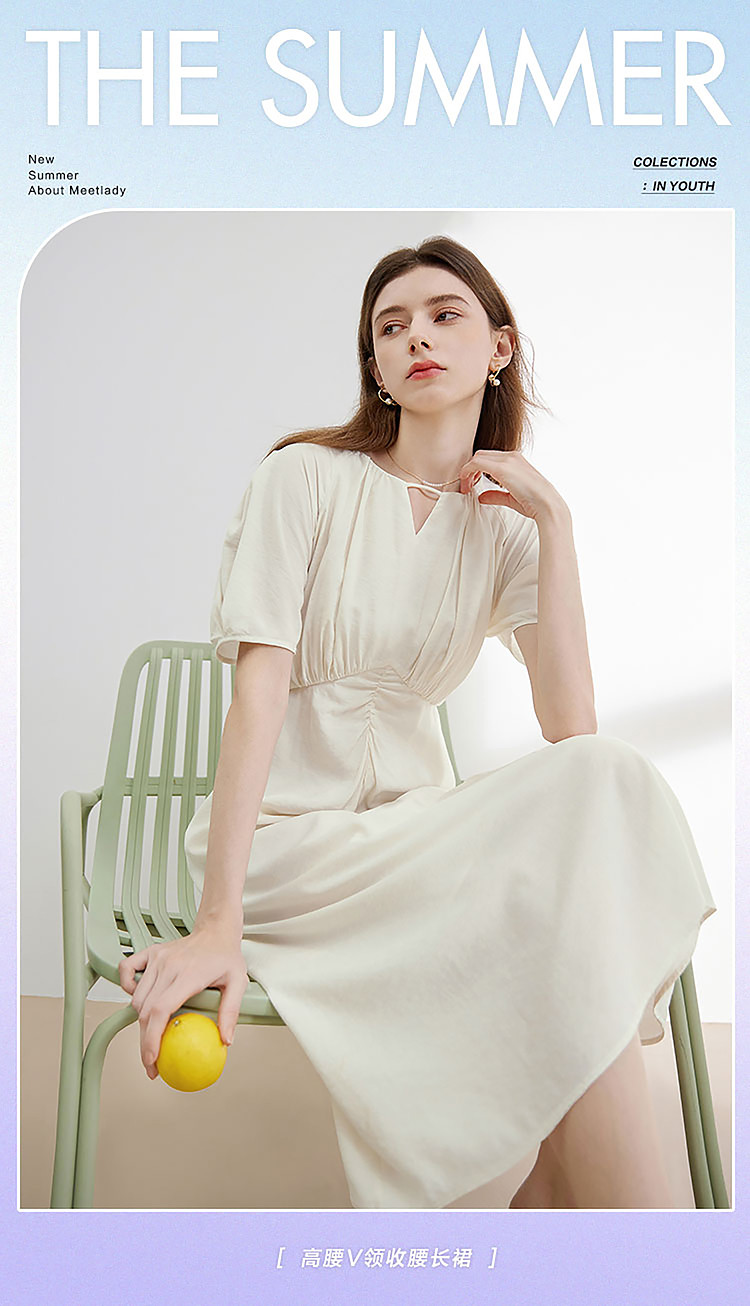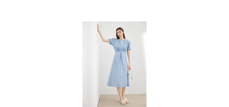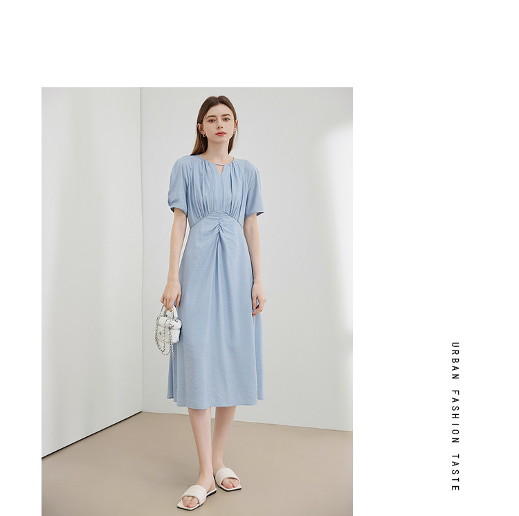 商品名称:【2024夏季】小V领收腰连衣裙女简约泡泡袖通勤风高腰裙子 442772