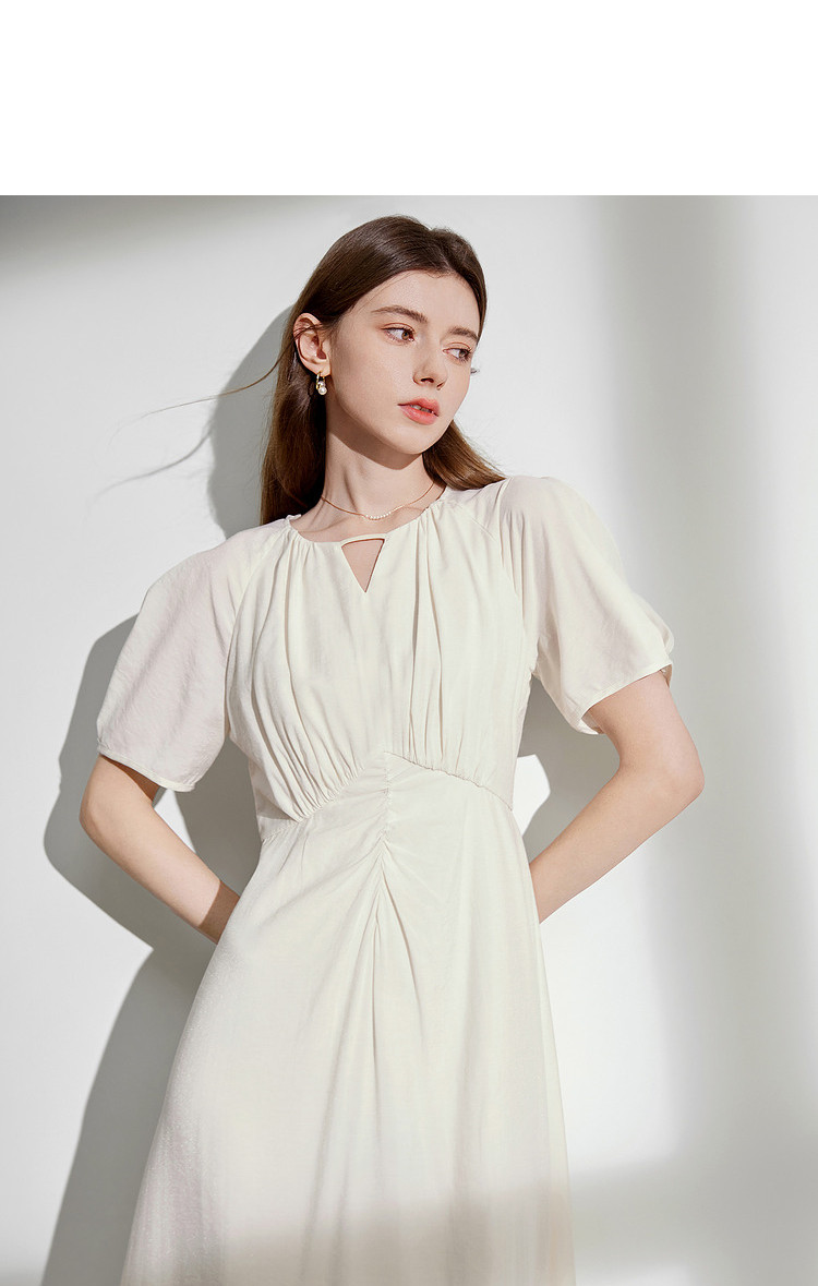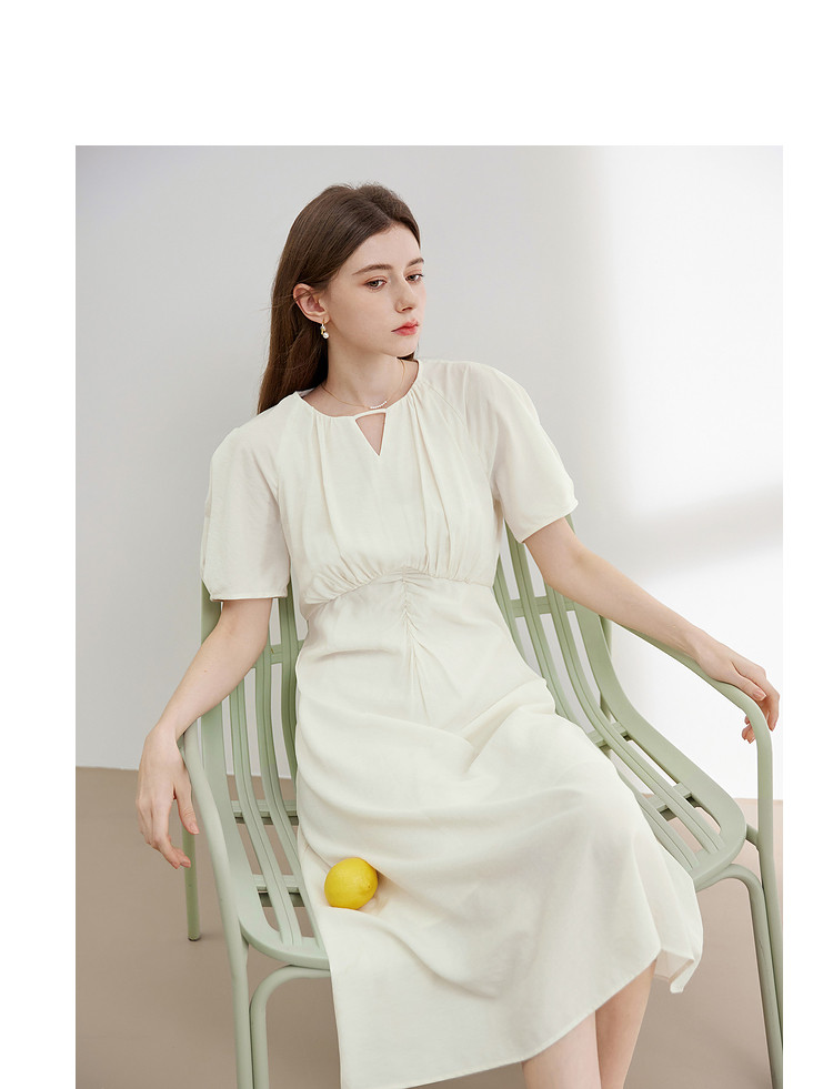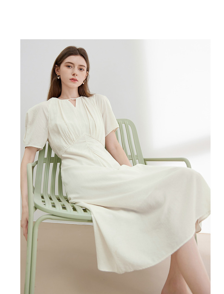 【2024夏季】小V领收腰连衣裙女简约泡泡袖通勤风高腰裙子 442772