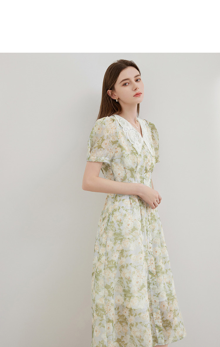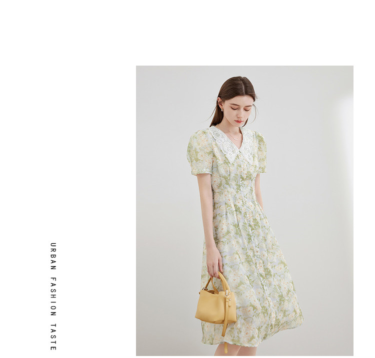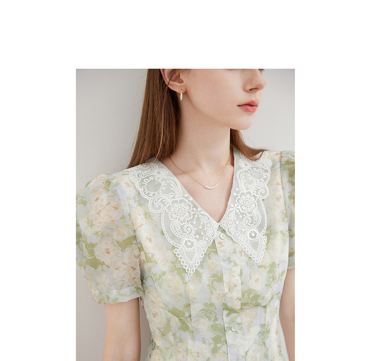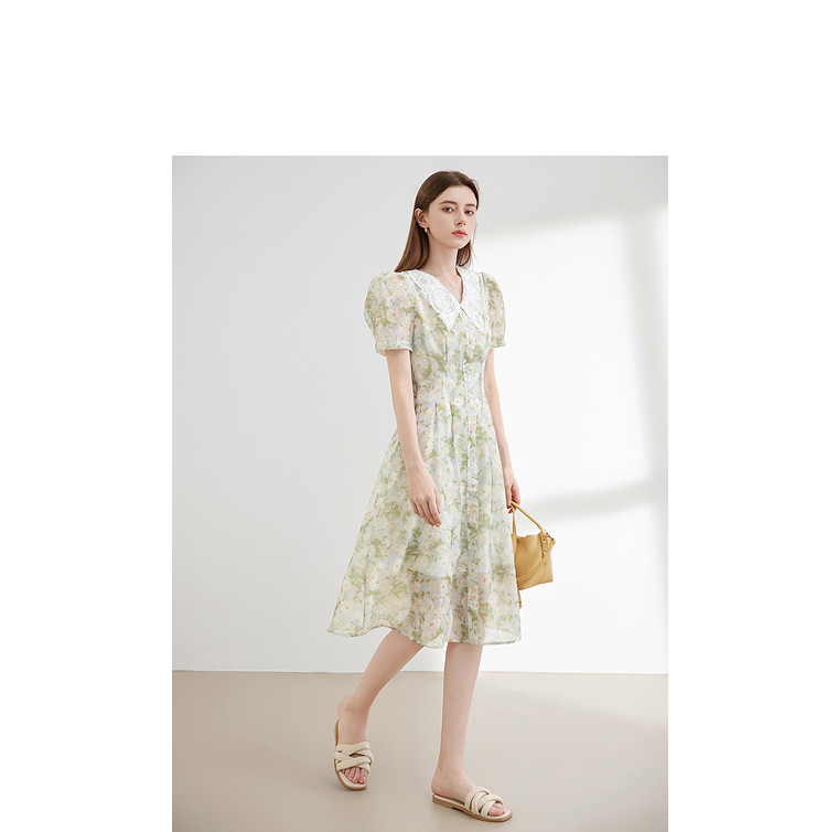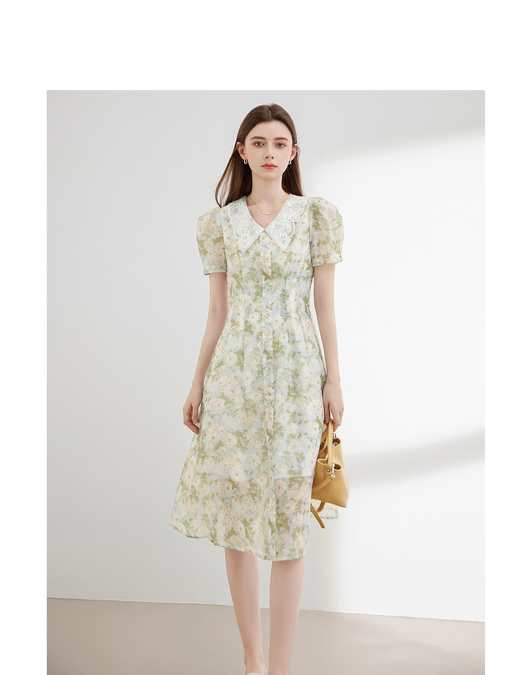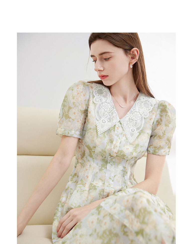 商品名称:【2024夏季】法式绣花领碎花连衣裙女气质收腰泡泡袖长裙 487828