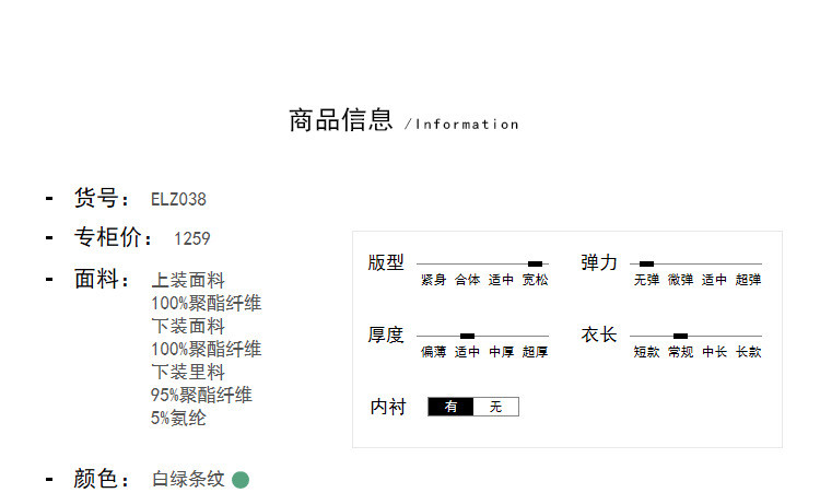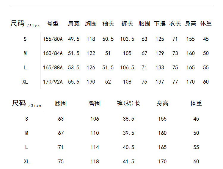 | 尺码 | 肩宽(cm) | 袖长(cm) | 上装号型 | 下装号型 | 衣长(cm) | 腰围(cm) | 裤长(cm) | 臀围(cm) | 胸围(cm) | 号型 |