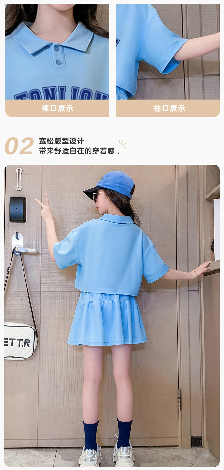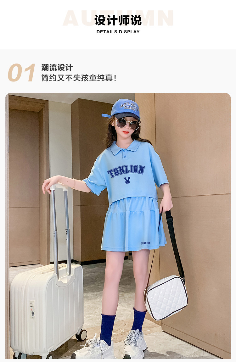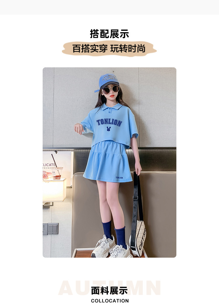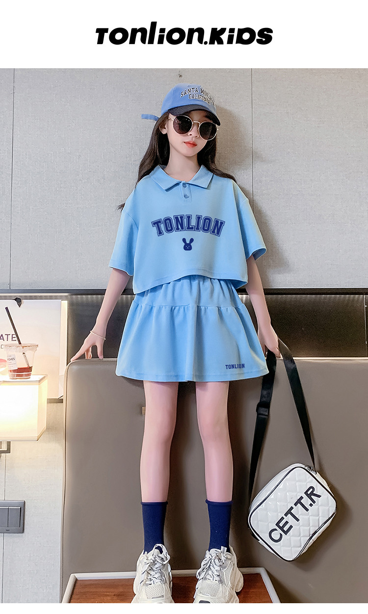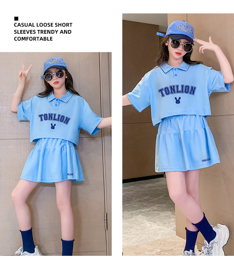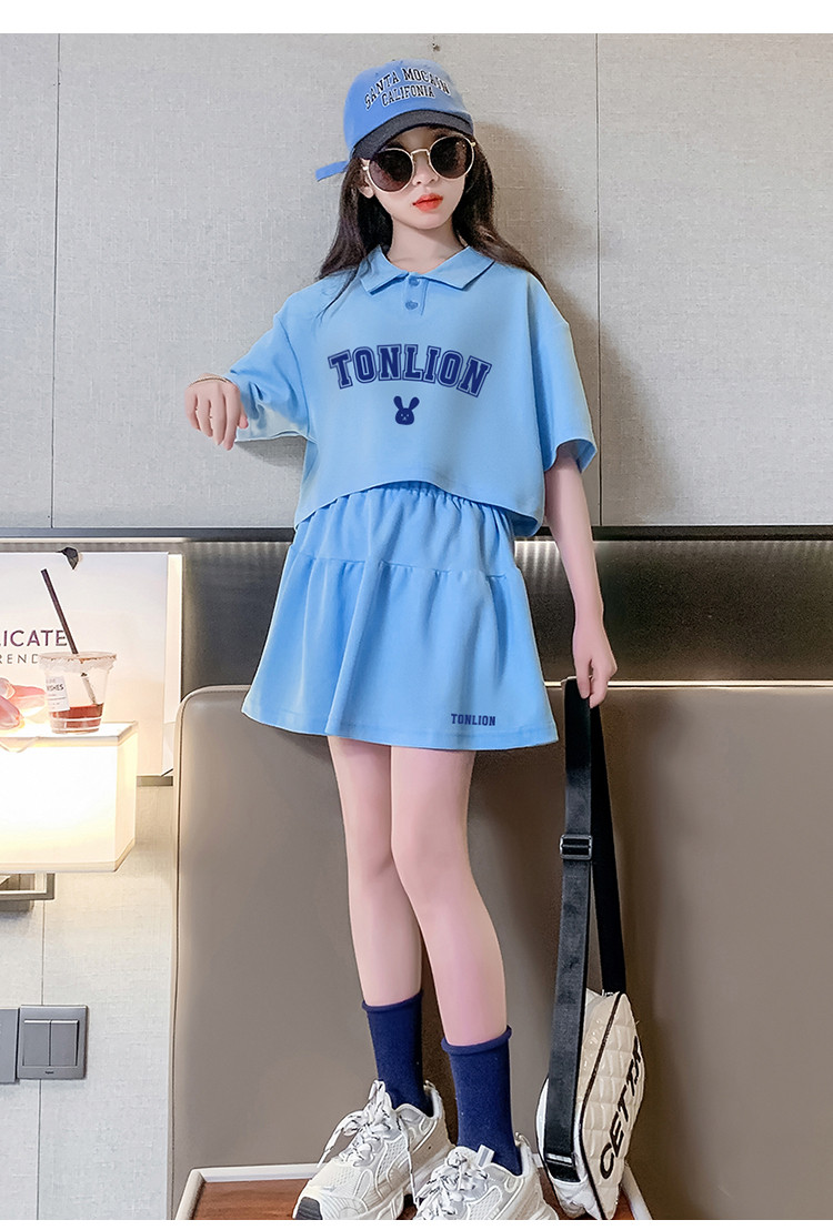 商品名称:春夏款运动风洋气女童套装儿童中大童休闲短袖套装加裙子两件套装 787855