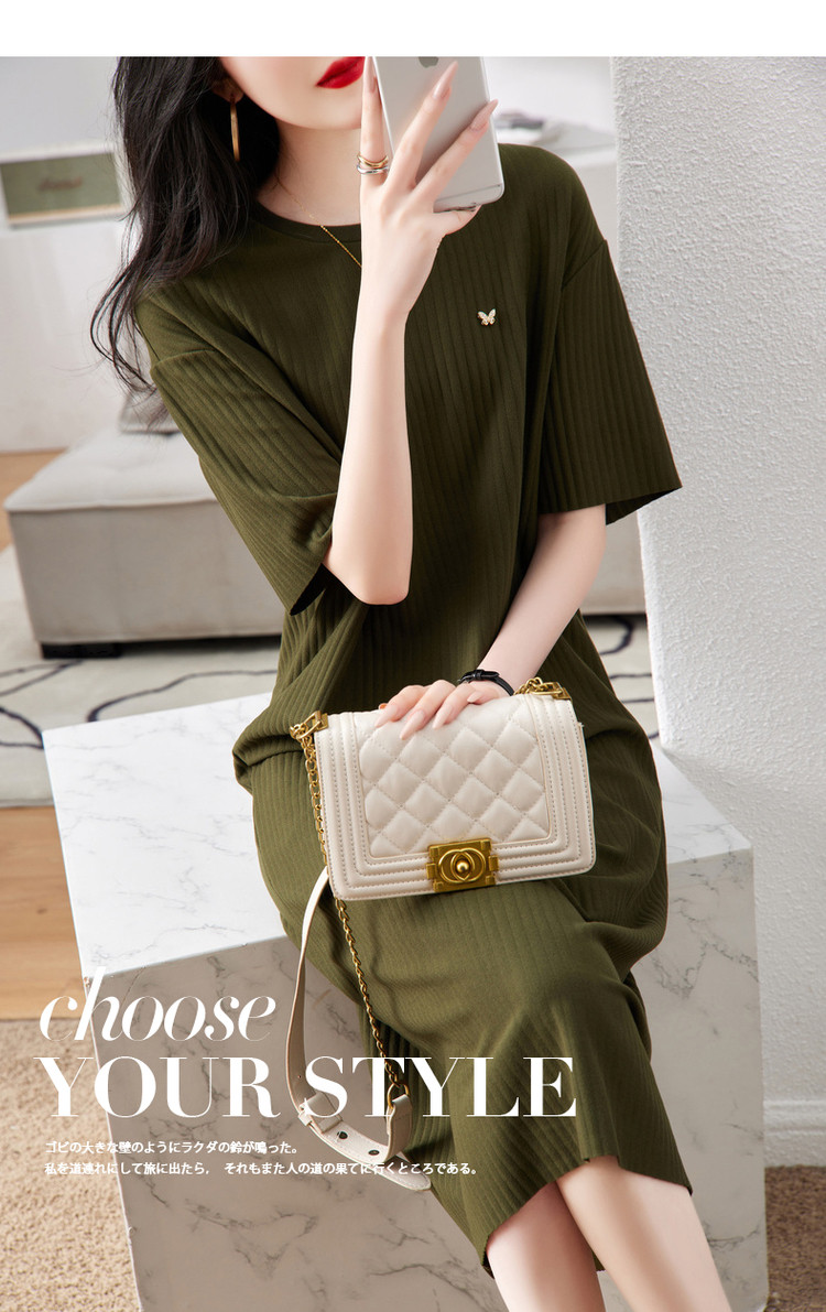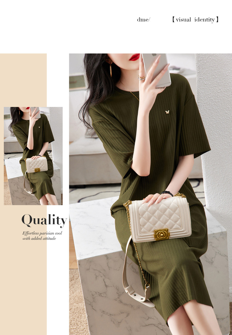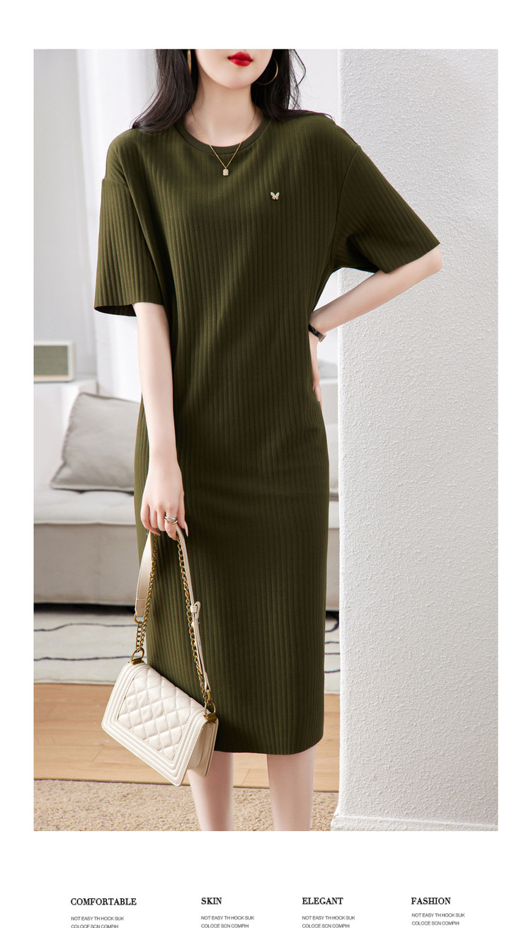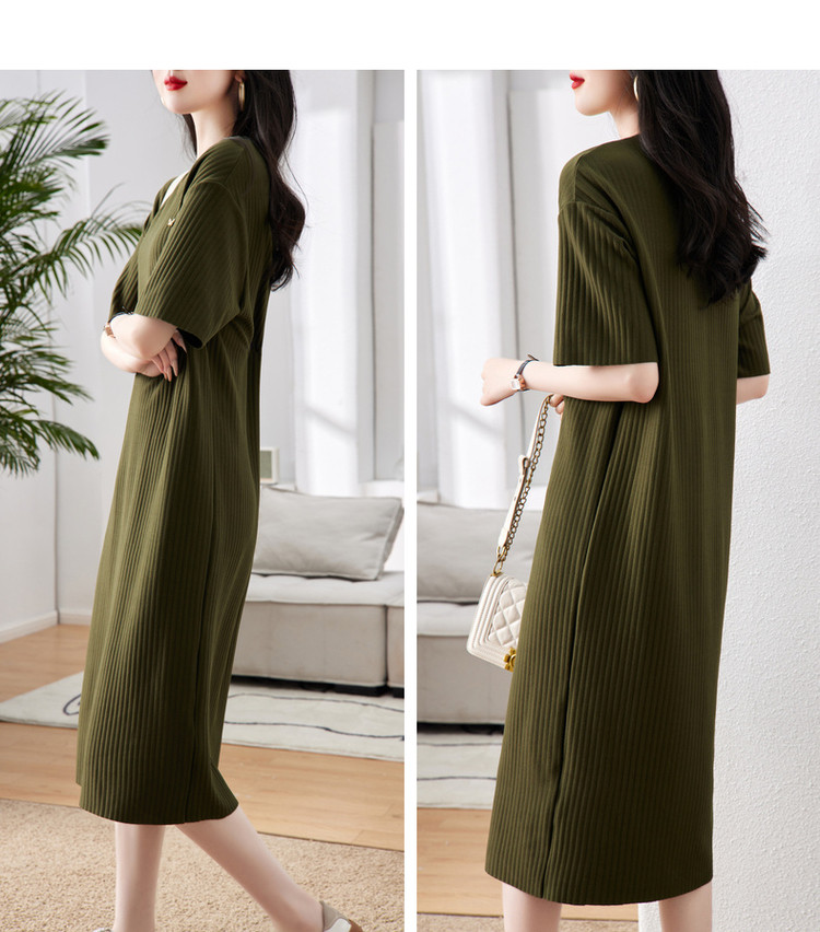 【压皱工艺】春秋通勤圆领直筒中腰短袖连衣裙女中长款 174209