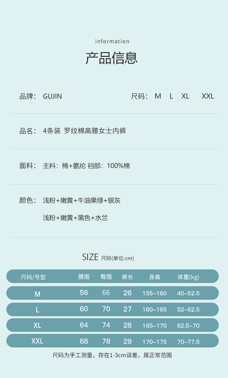 商品名称:【舒适高腰 收腹提臀】4条装简约透气纯棉抑菌里裆内裤女士内裤 335966