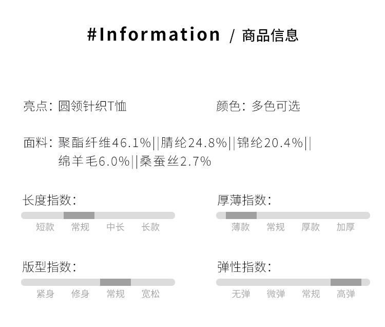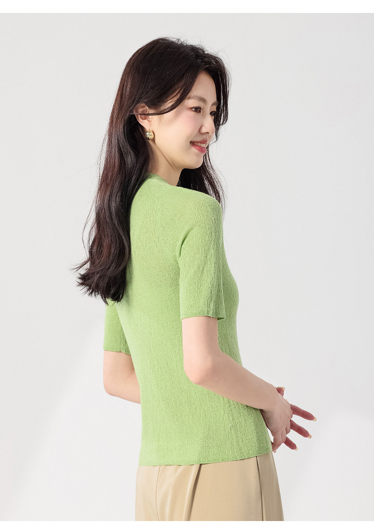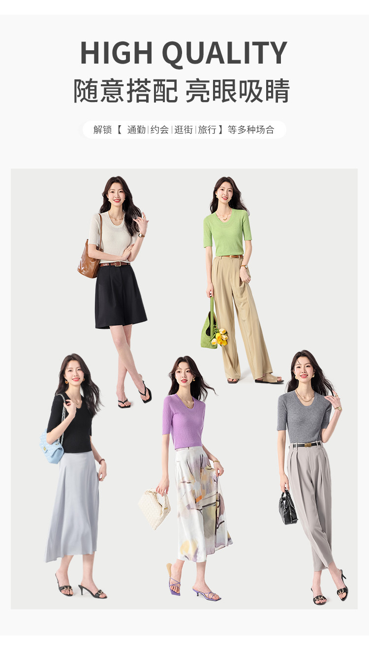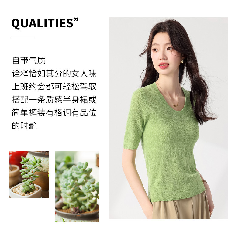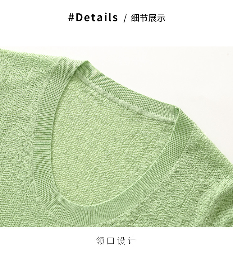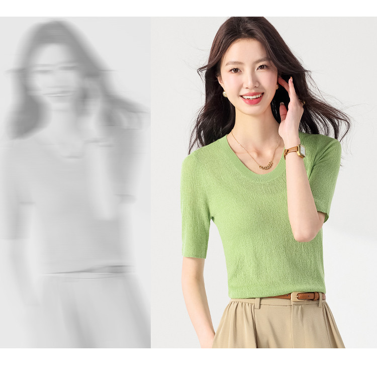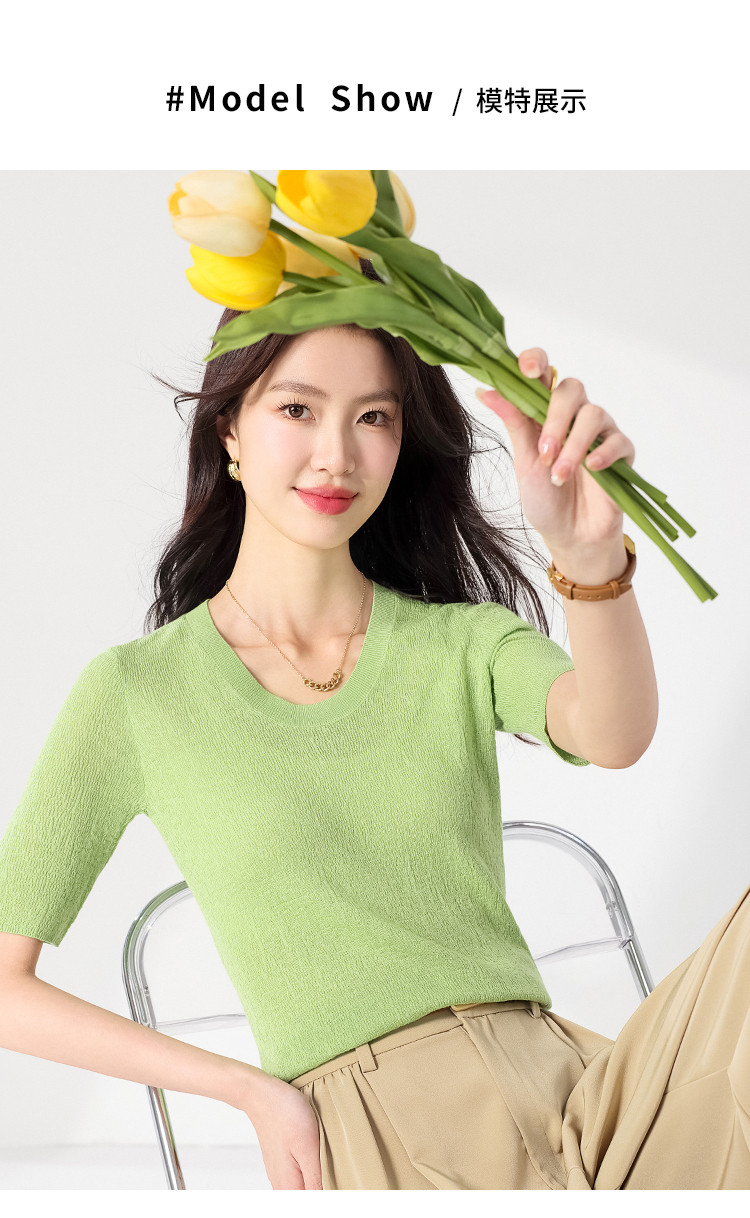 商品名称:春夏轻薄透气简约百搭纯色圆领含桑蚕丝针织打底短袖T恤衫 141139