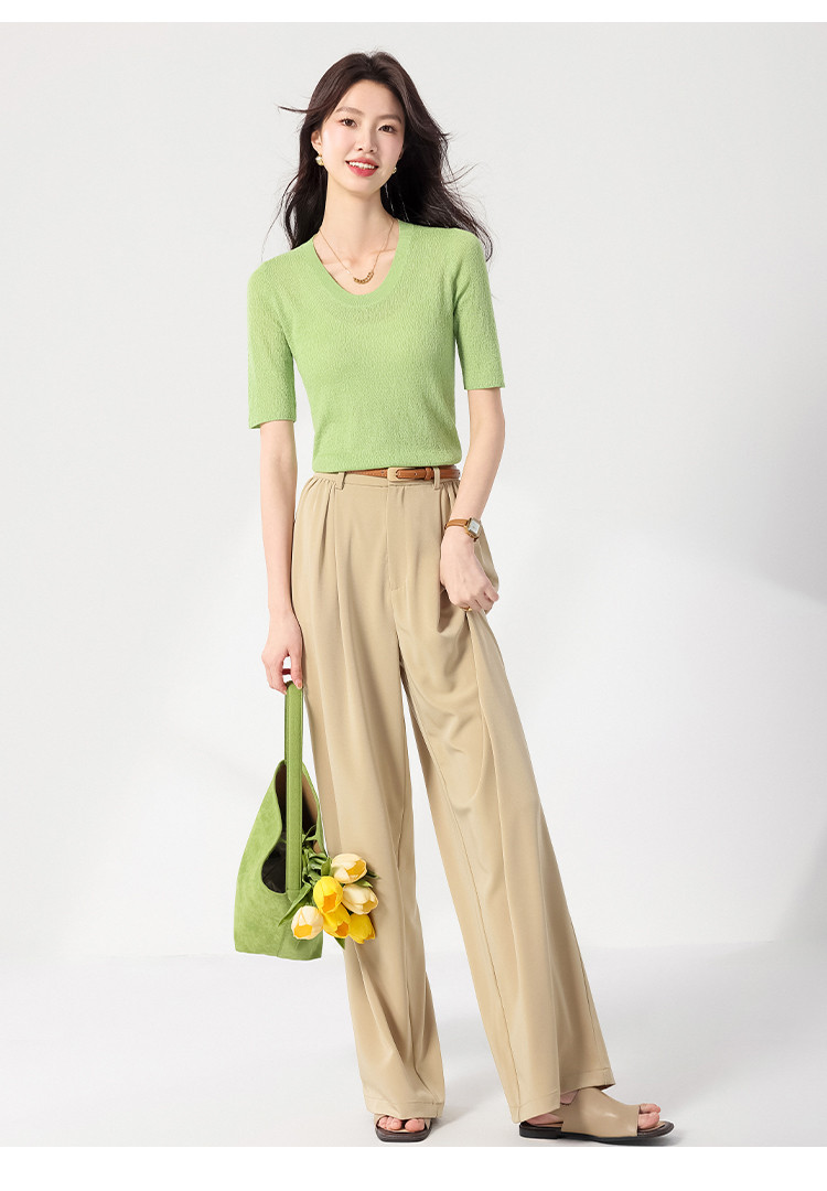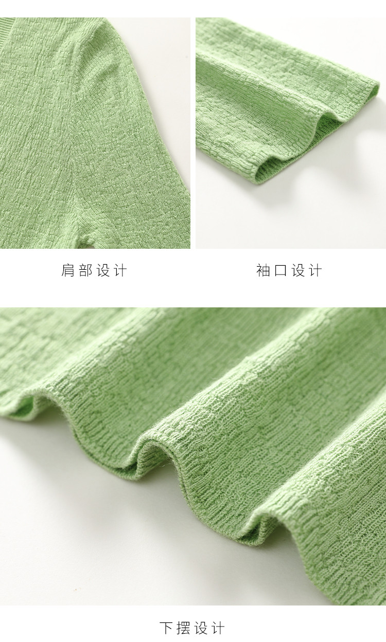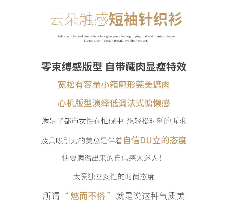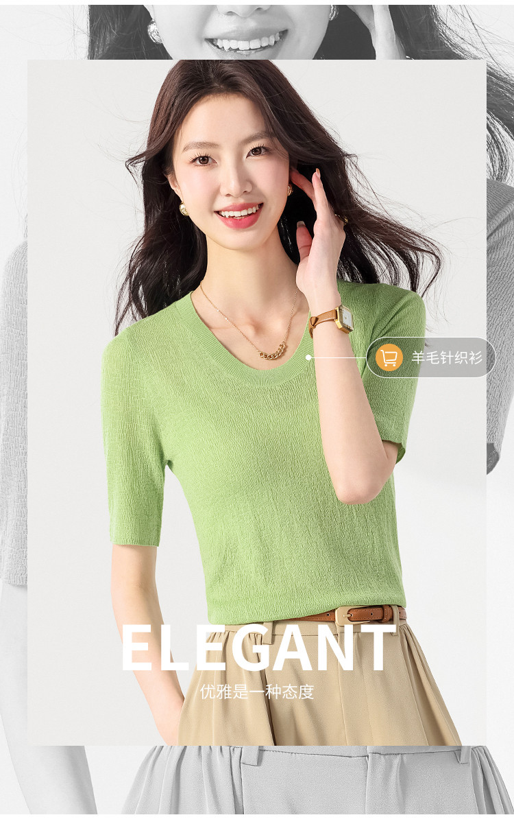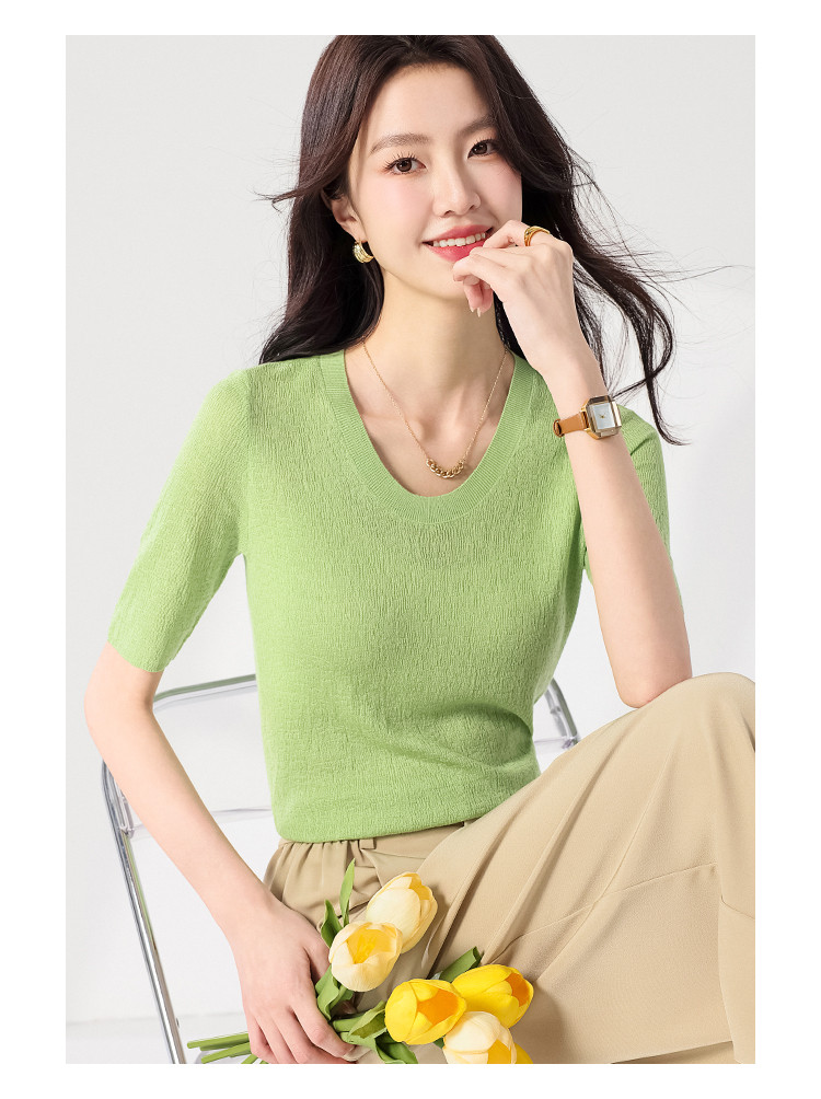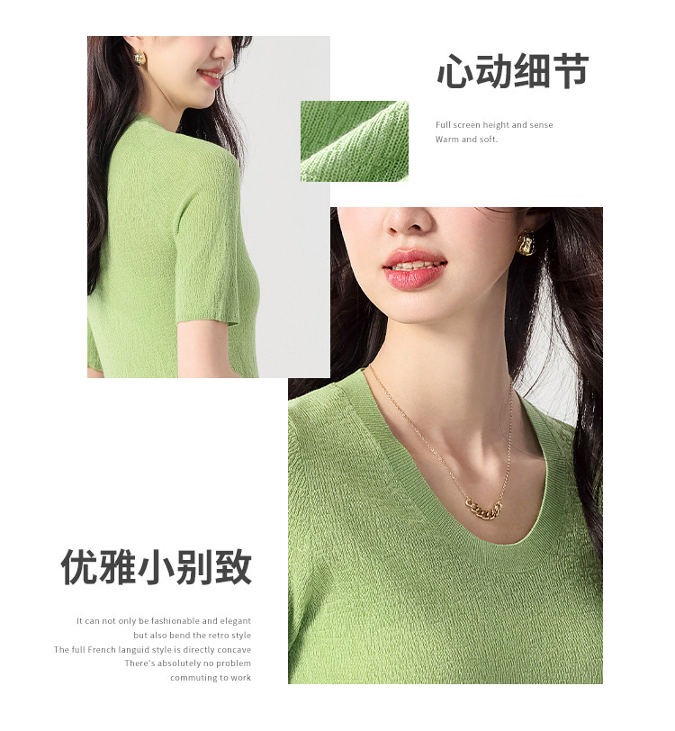 商品名称:春夏轻薄透气简约百搭纯色圆领含桑蚕丝针织打底短袖T恤衫 141139