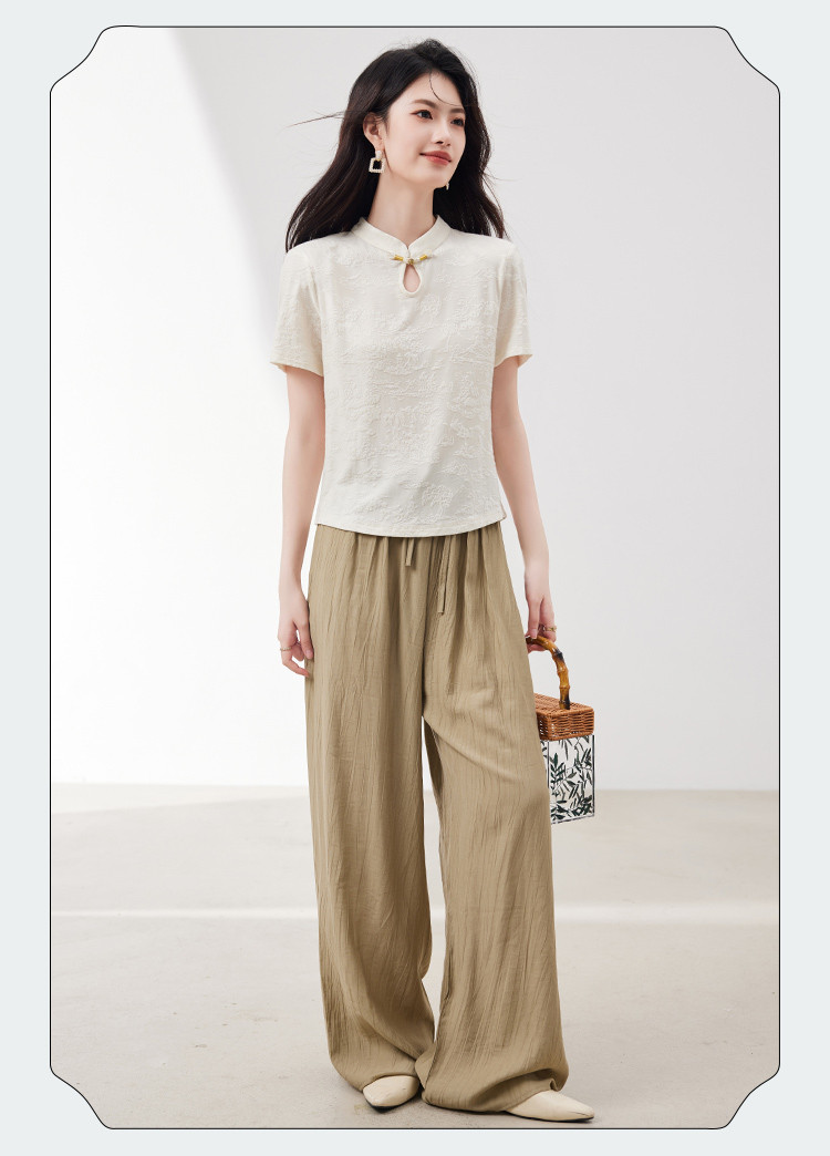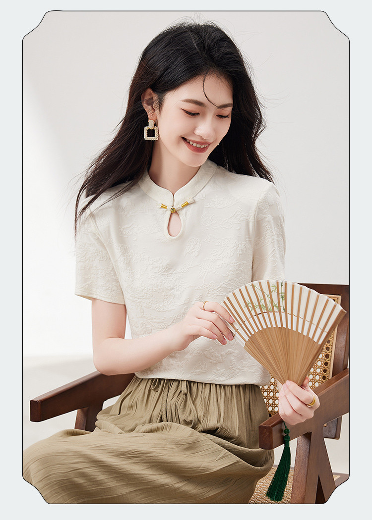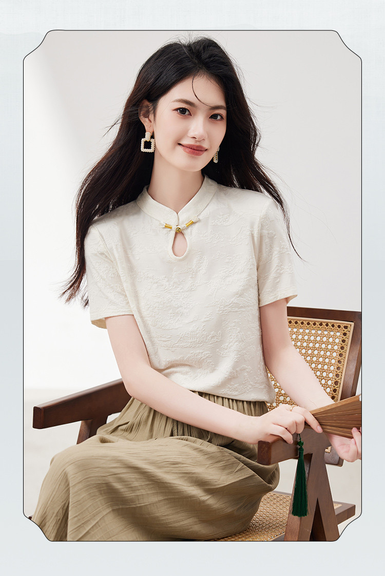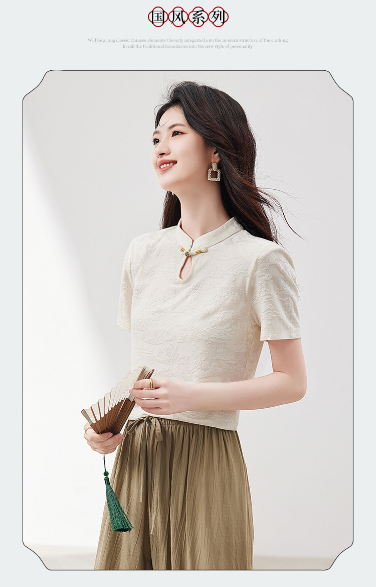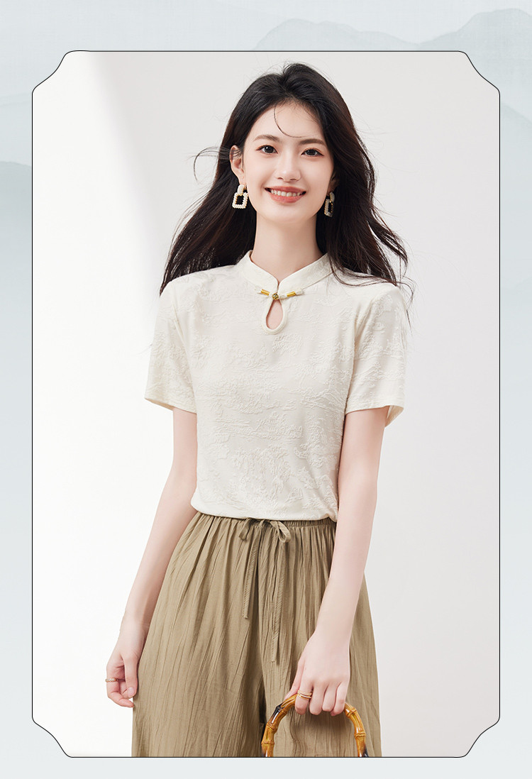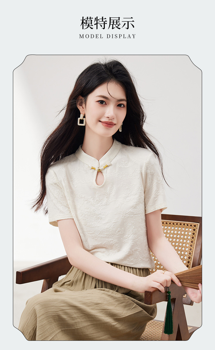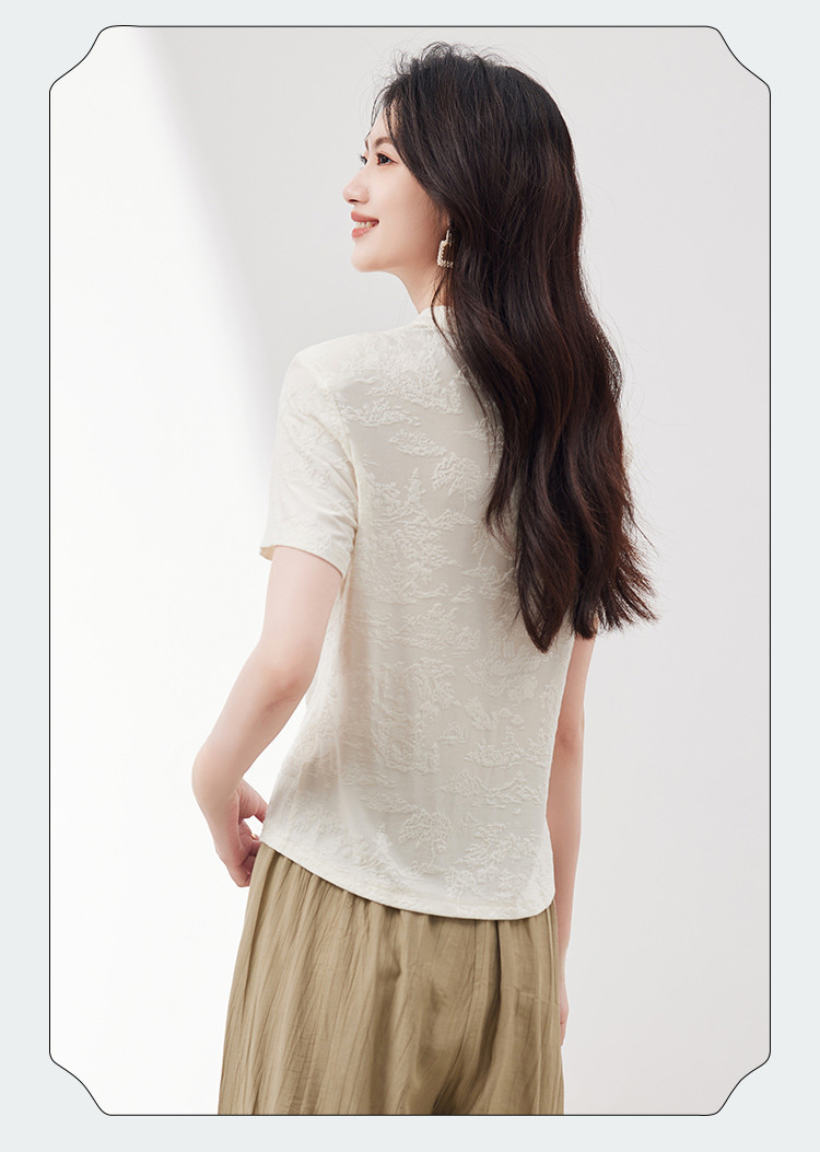 商品名称:正肩短袖女t恤高级感夏季2025新款新中式提花显瘦针织上衣女 017176