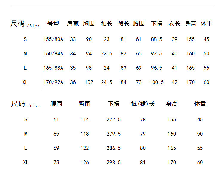 | 尺码 | 裙长(cm) | 肩宽(cm) | 袖长(cm) | 上装号型 | 下装号型 | 衣长(cm) | 腰围(cm) | 臀围(cm) | 胸围(cm) | 号型 |