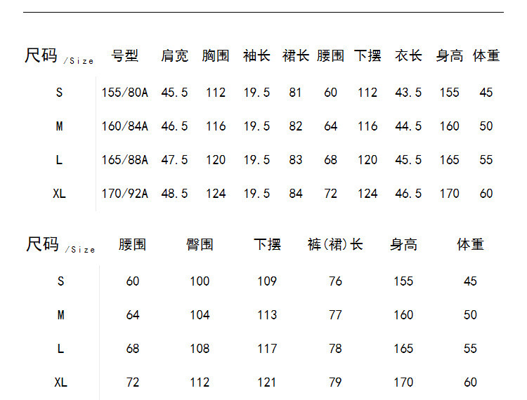 | 尺码 | 裙长(cm) | 肩宽(cm) | 袖长(cm) | 上装号型 | 下装号型 | 衣长(cm) | 腰围(cm) | 臀围(cm) | 胸围(cm) | 号型 |