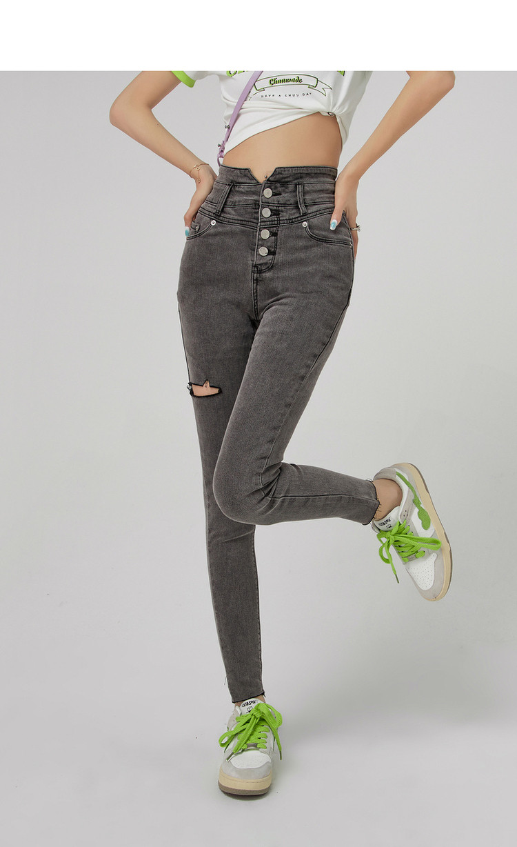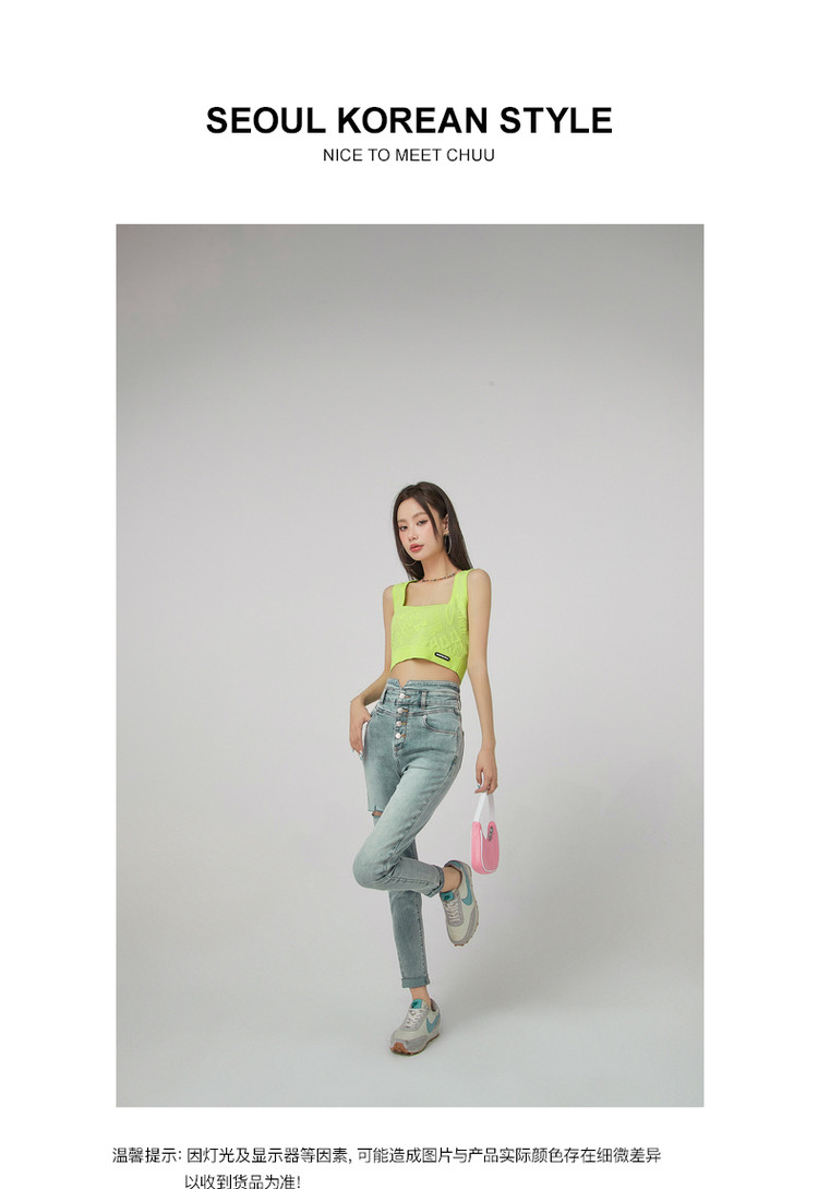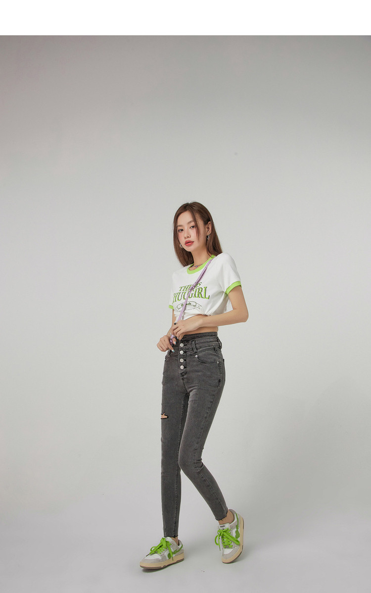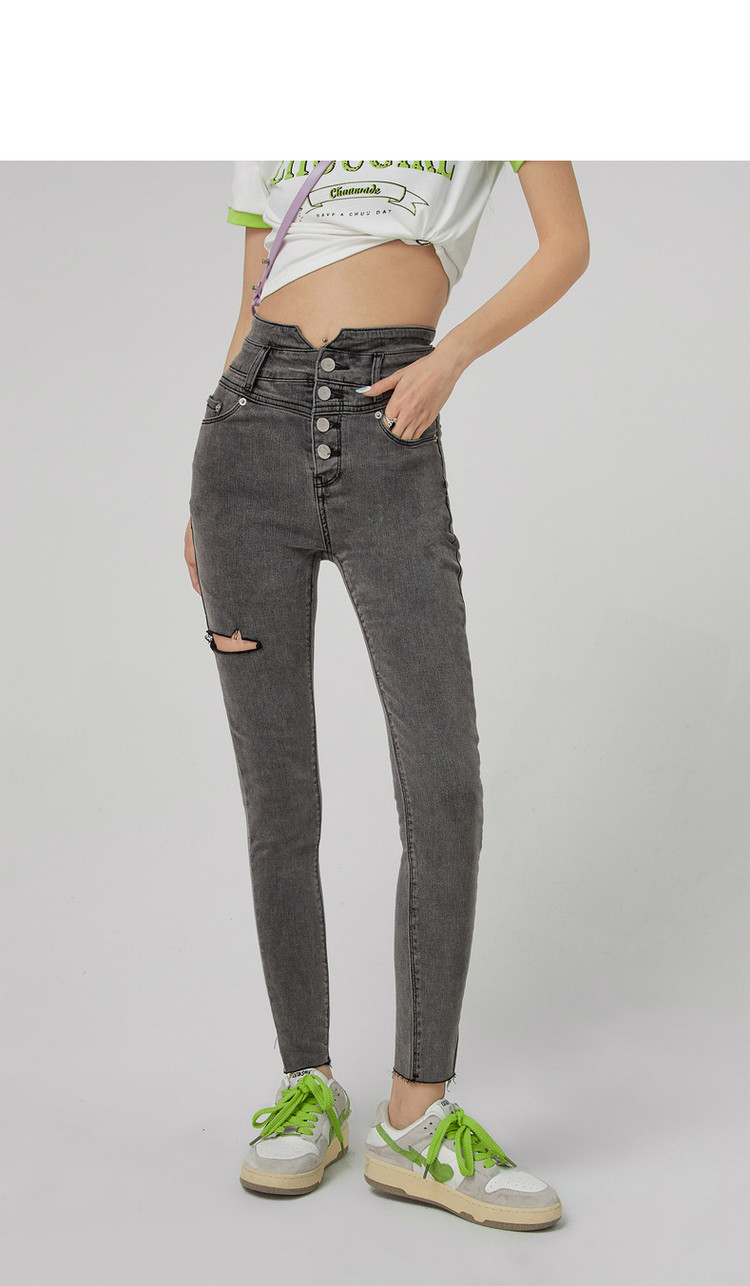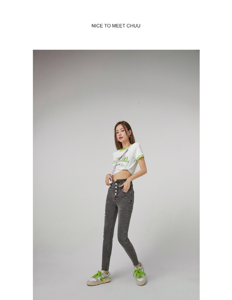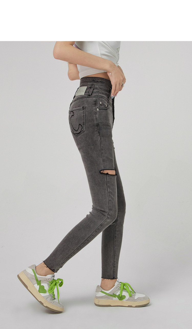 商品名称:高腰修身牛仔裤女夏季韩版小众百搭破洞小脚裤子潮 037715