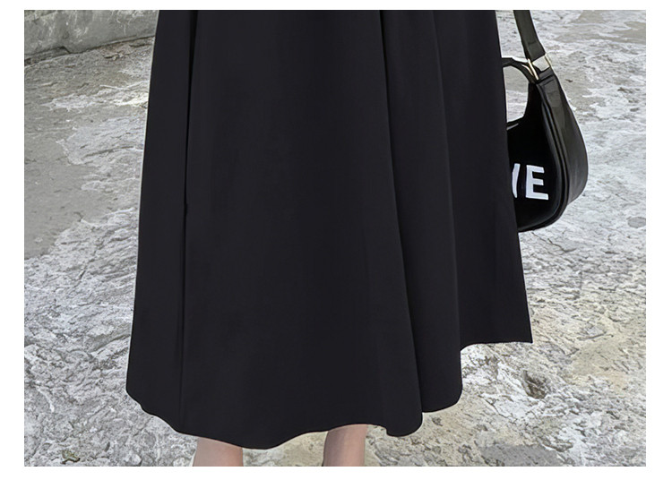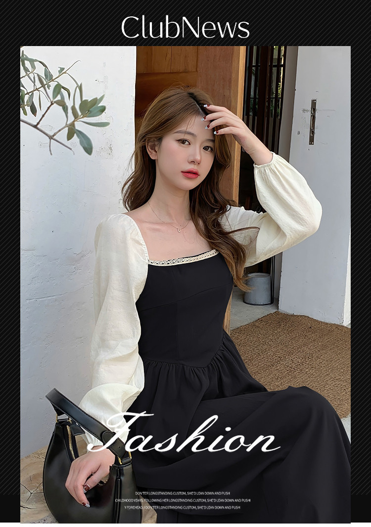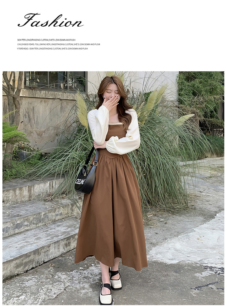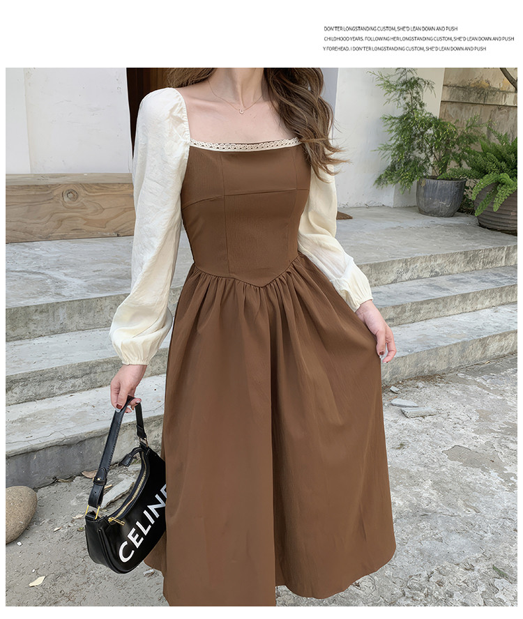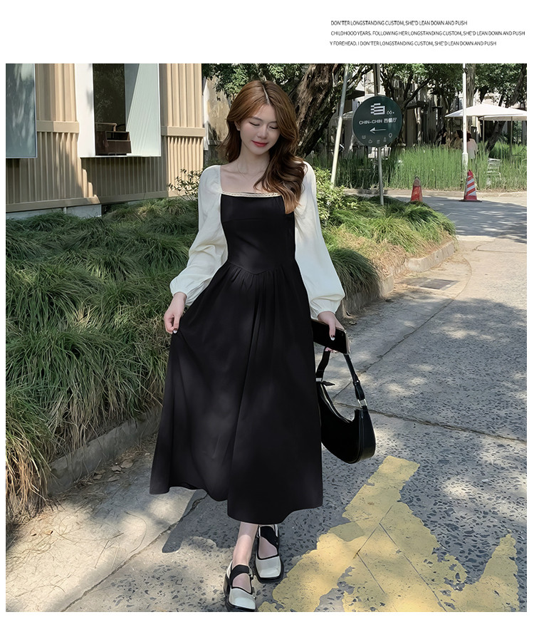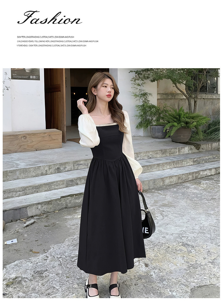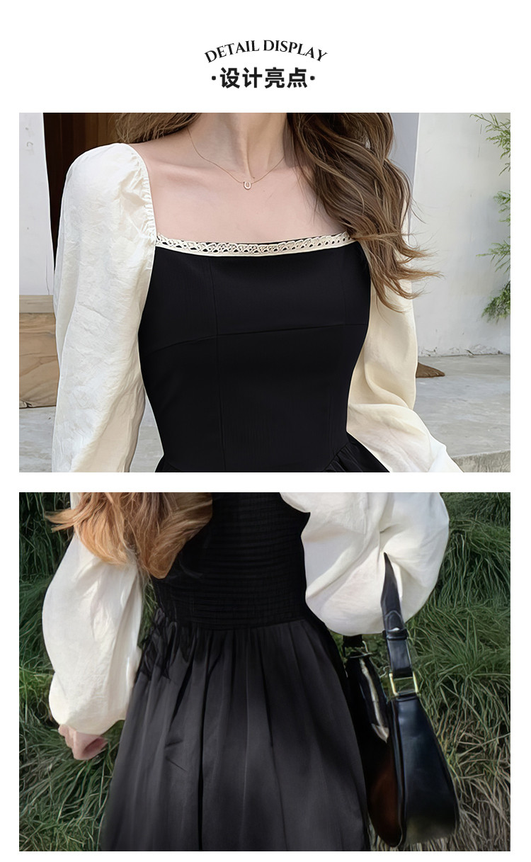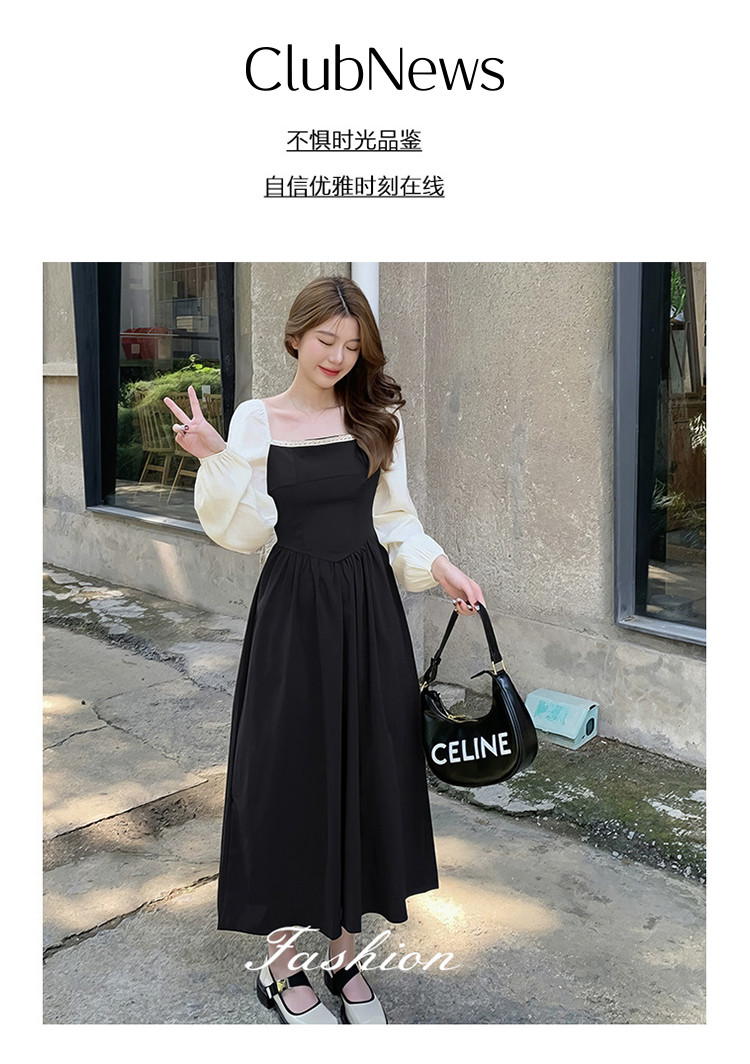 商品名称:落肩袖拼接气质长袖连衣裙女法式方领收腰中长裙 848067