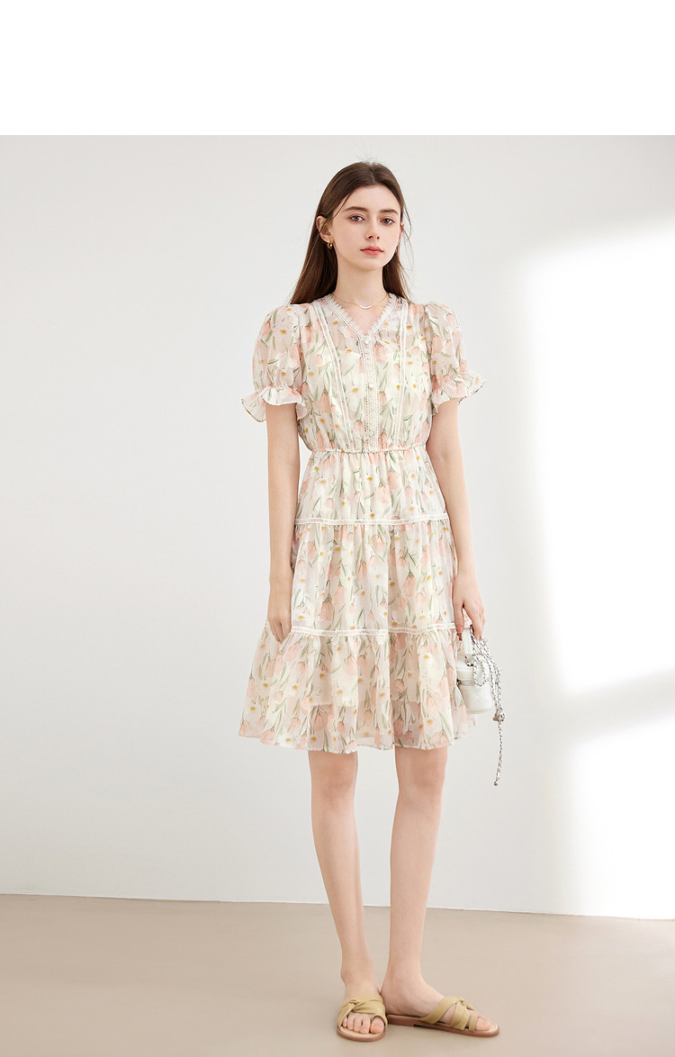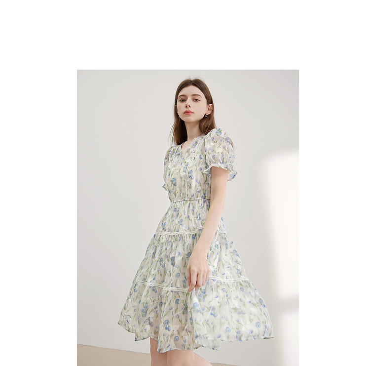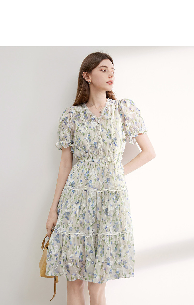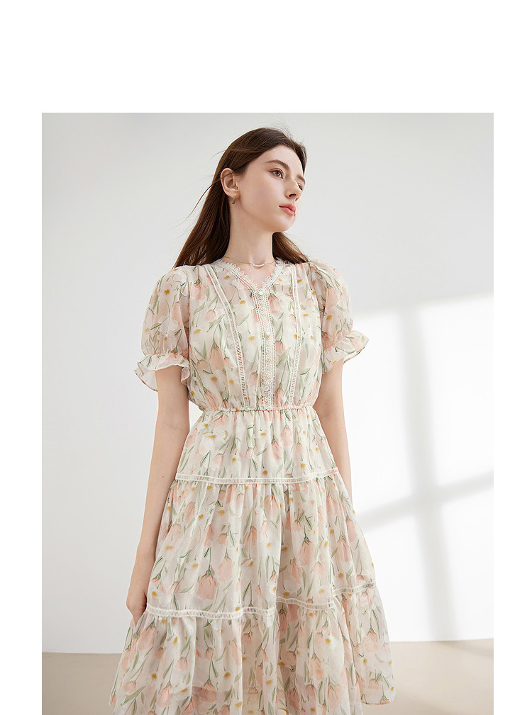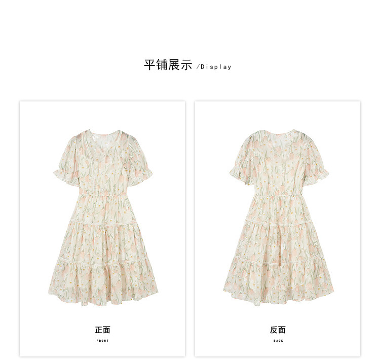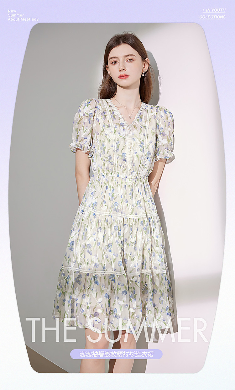 商品名称:【2024夏季】法式碎花连衣裙女气质收腰泡泡袖蕾丝边长裙 967700