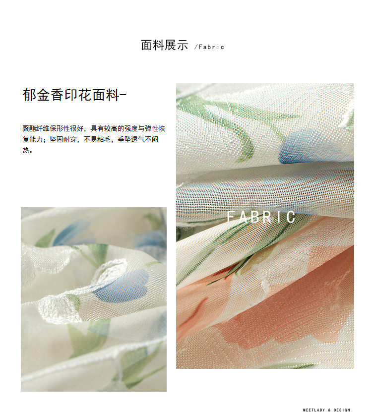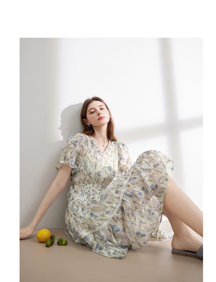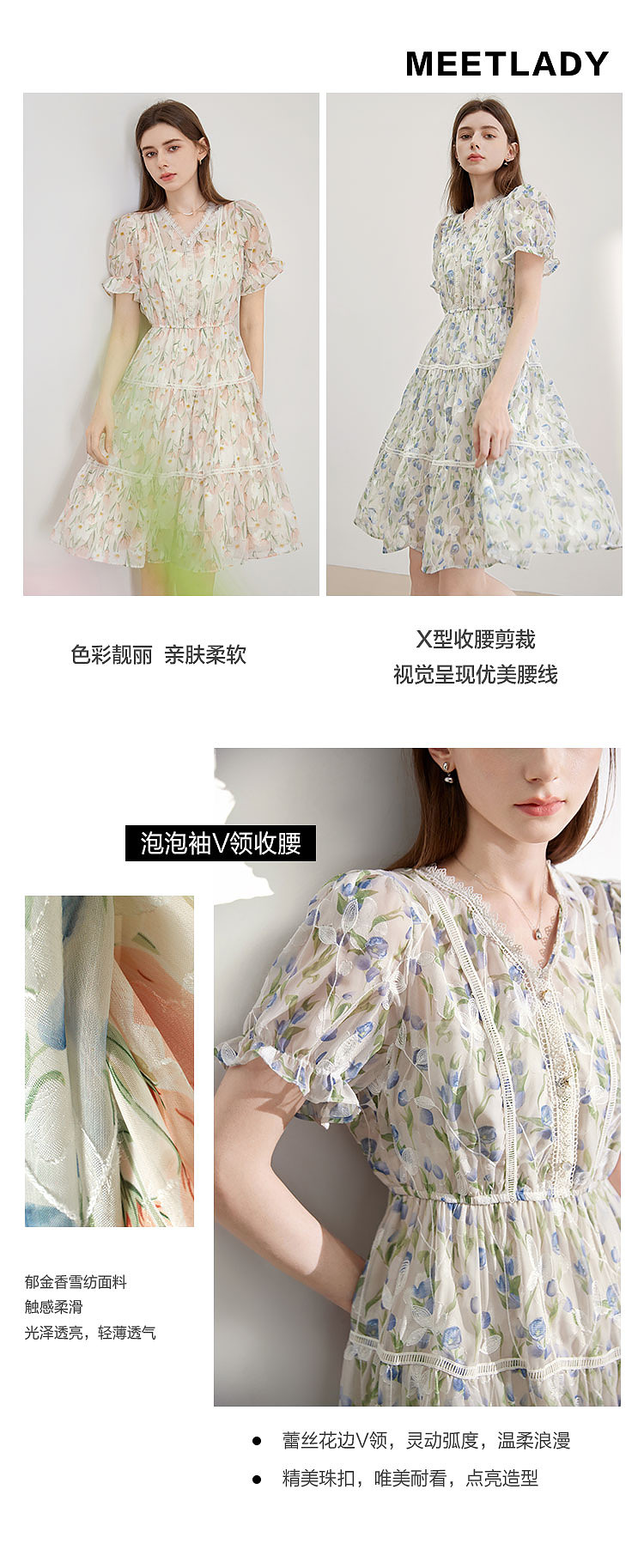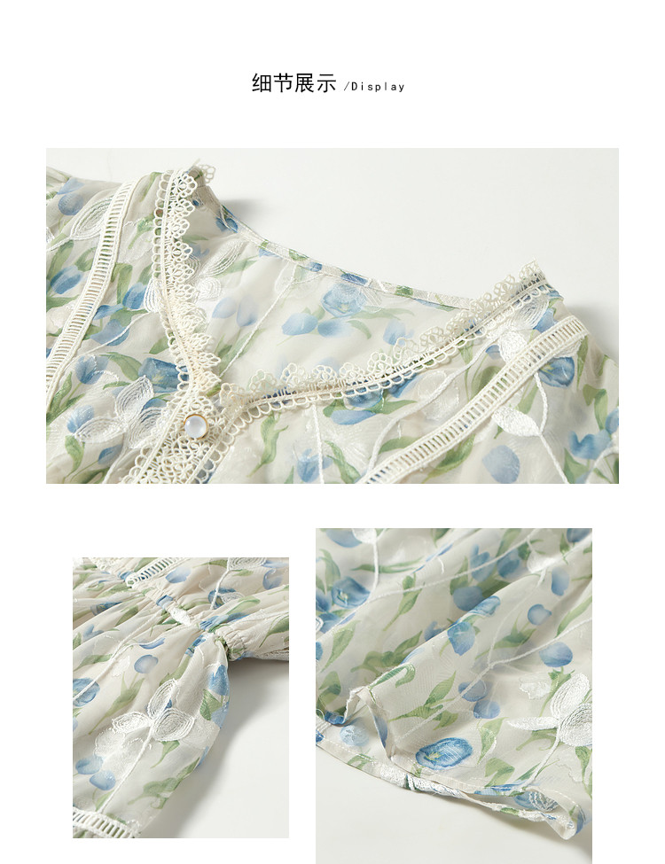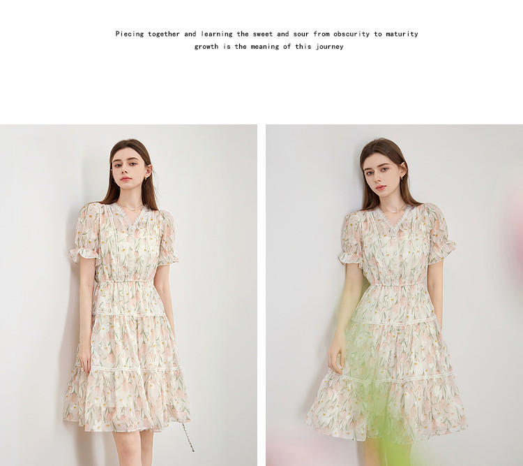 商品名称:【2024夏季】法式碎花连衣裙女气质收腰泡泡袖蕾丝边长裙 967700